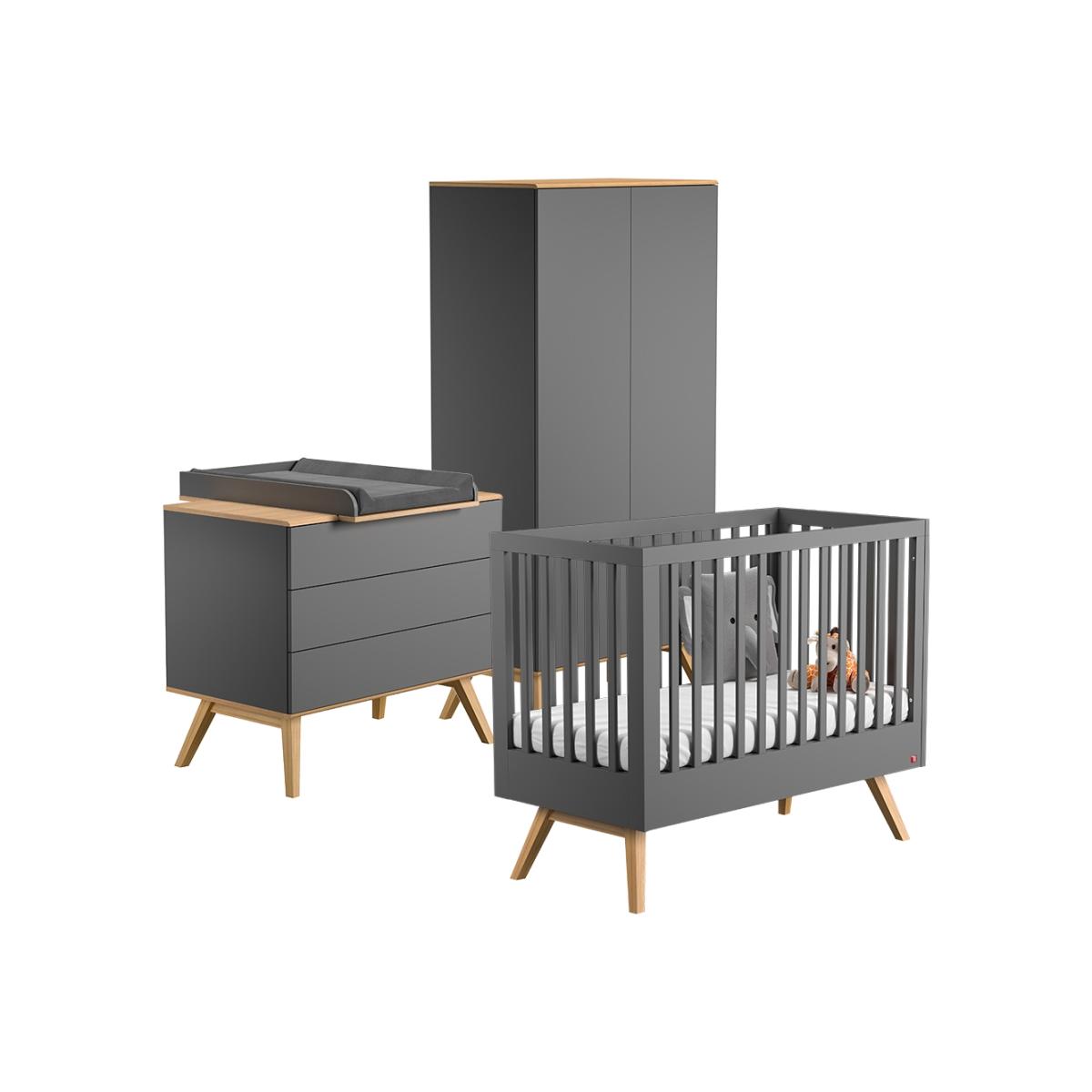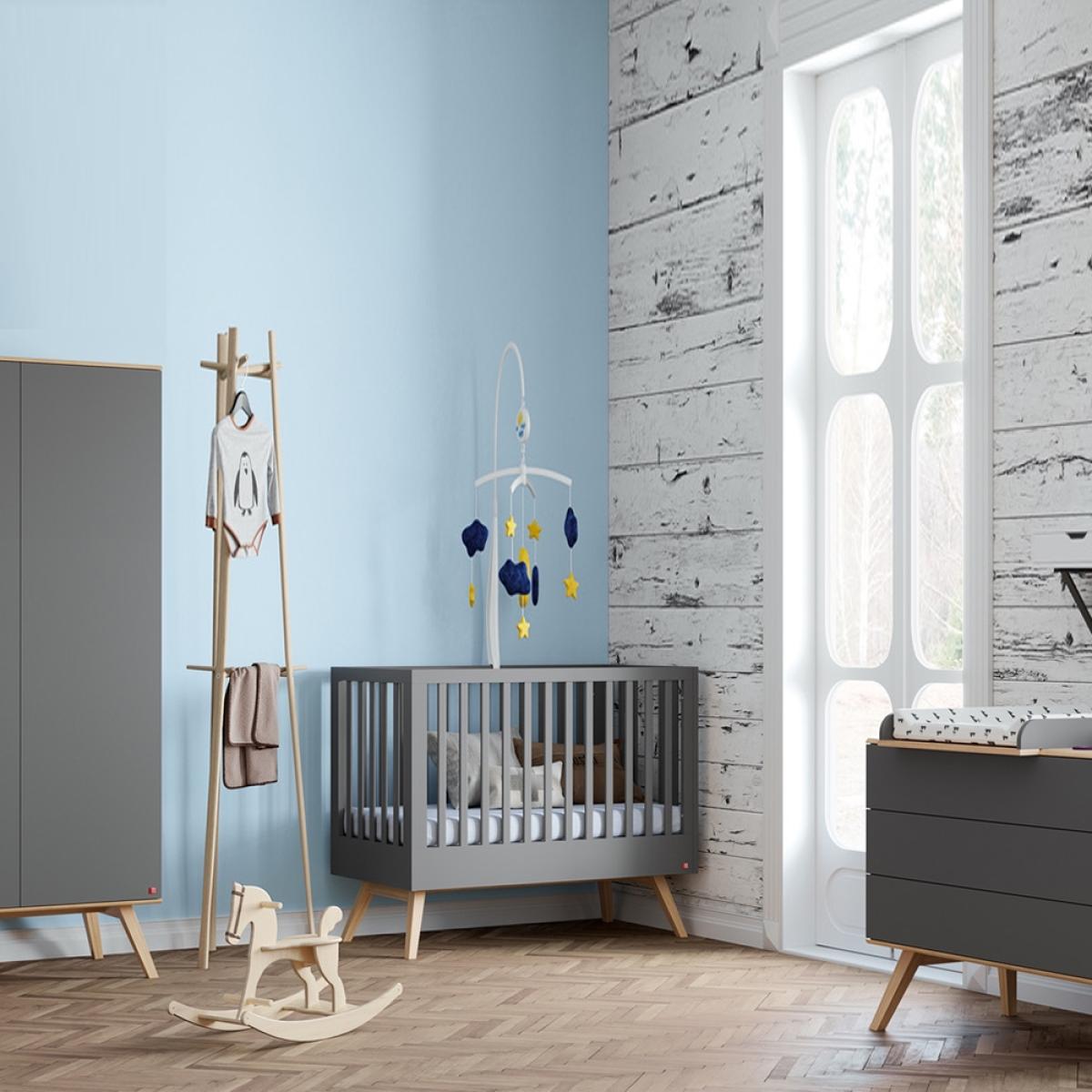The Nature Cot Bed 3 Piece Nursery Set from Vox is just what you've been looking for to inject some Scandi style into your babies room! The simple shapes and clean lines allow you to create one stylish nursery. This stunning set comes complete with a cot, to give your baby a perfect nights sleep and when the time comes this wonderful cot can be transformed into a toddler bed. A wardrobe to house those mountains of clothes we just can't help but buy, it's not our fault they're so adorable! Lastly a chest of drawers, with the option to add a changing table top you can make the ultimate baby changing station! The three drawers offer up all the space you require for those essentials whilst changing your little one's nappy and being removable when it is no longer needed you are left with a lovely chest of drawers for your youngster to grow up with! Whether it's a girl or a boy, the dark grey paired with the solid oak, this beautiful set will fit right in!.