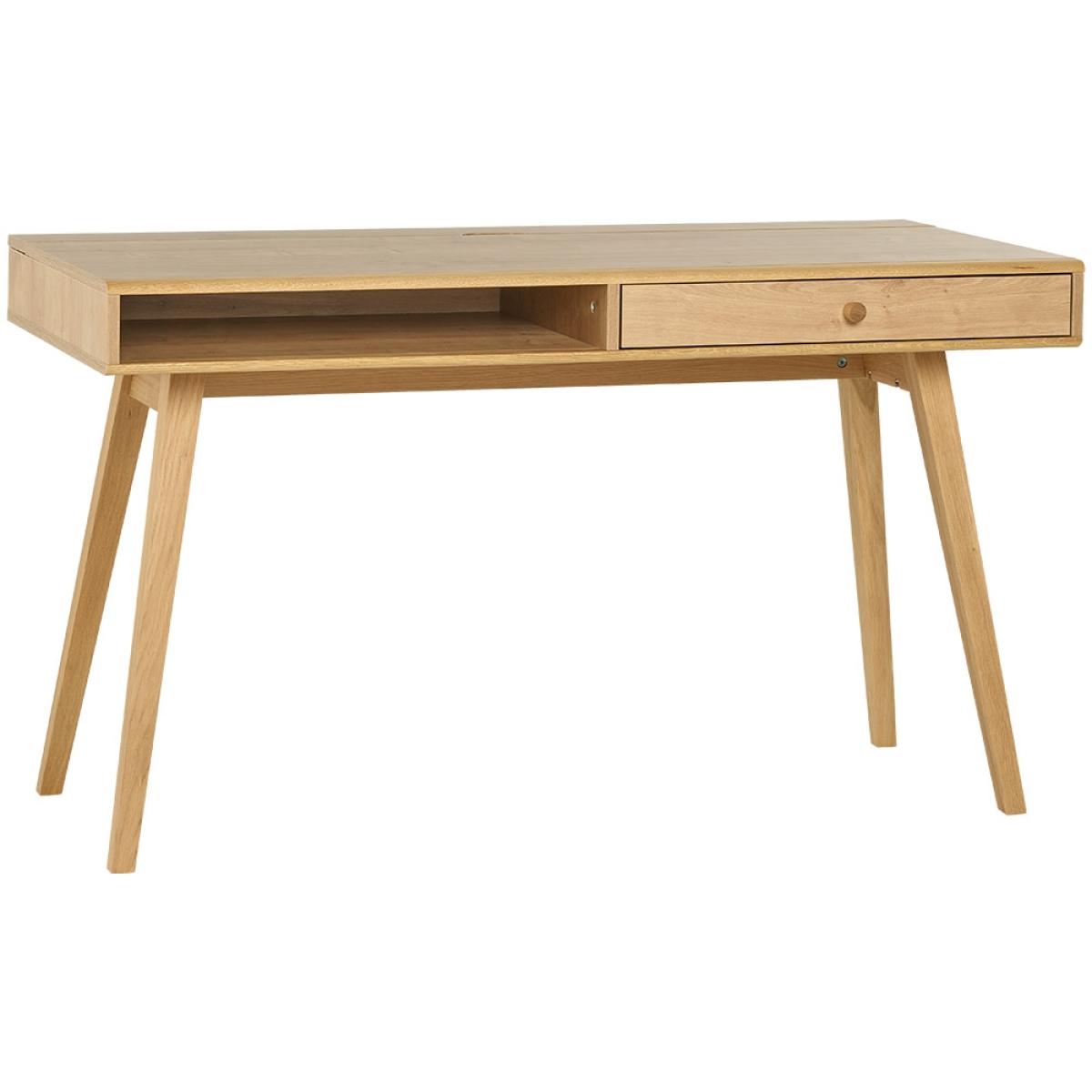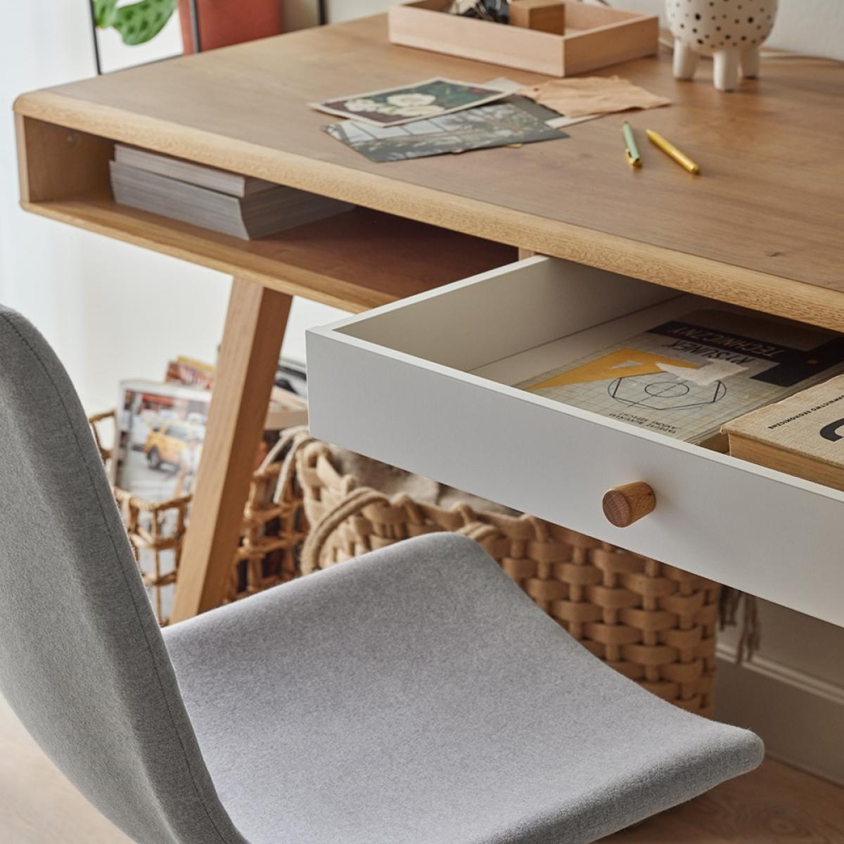 The Vox Nature Desk in White & Oak Effect will be the perfect addition to your home office. This stylish desk has a few hidden secrets, at the back a clever hinged section opens to reveal a handy channel, ideal for keeping cables neat and tidy. With one drawer and one open compartment, ideal for storing your laptop at the end of the day. If you'd prefer an additional drawer this can be purchased separately. Make your desk your own by deciding between white or oak drawer fronts, both come included so why not mix it up!.