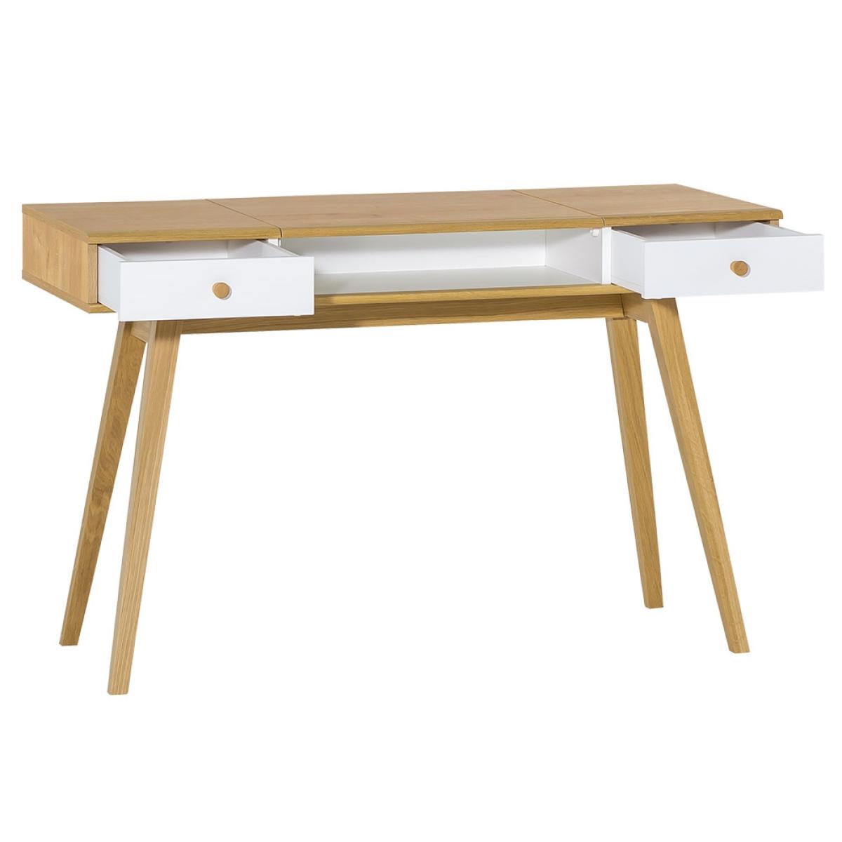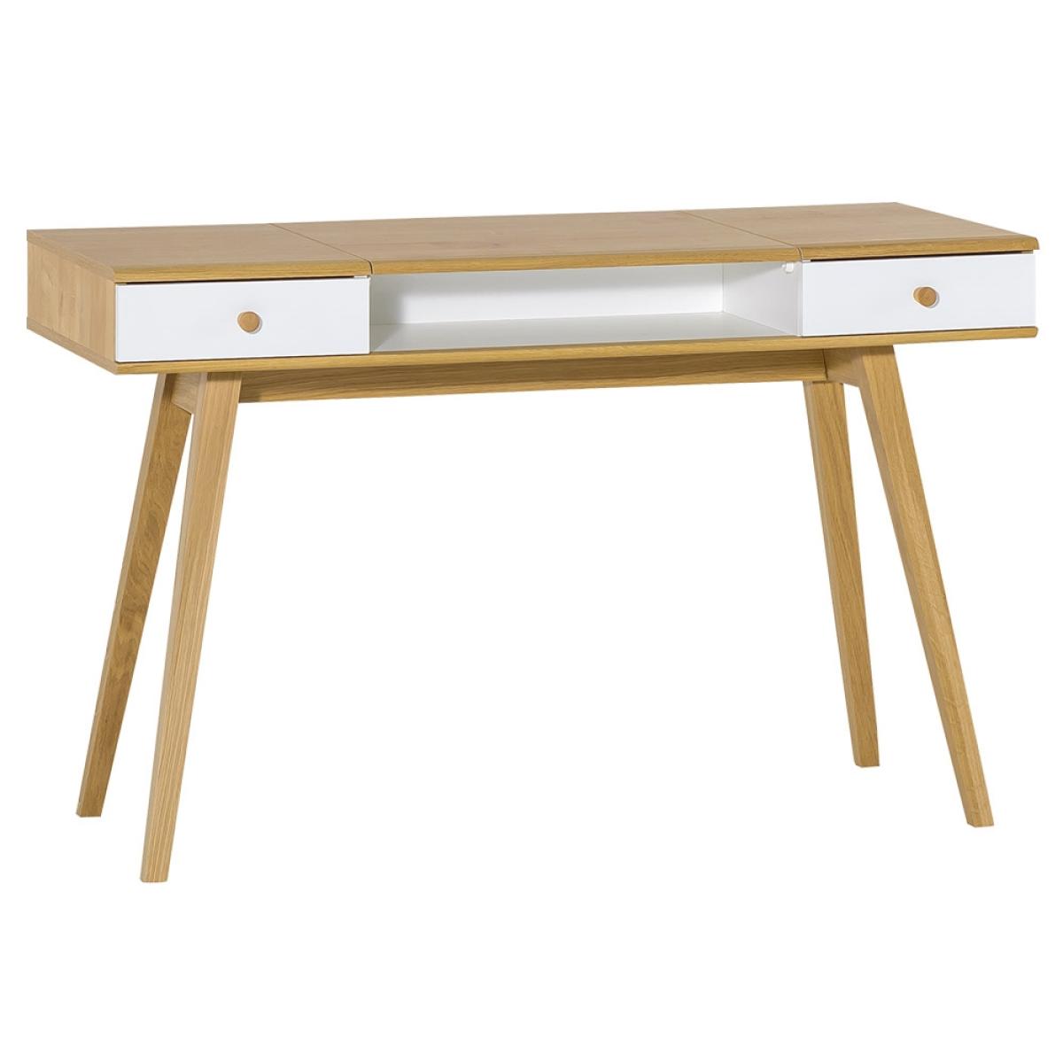 A desk? A makeup station? You decide with the Nature Dressing Table from Vox. With a mirror hidden under the tabletop plus storage space to hold your makeup, get yourself ready for the day then just lower the top and this handy little table becomes a desk. 2 in 1, perfect! The simple design and clean lines will add a touch of Scandinavian style wherever it is placed and is sure to suit any interior style! The inclusion of two drawers is ideal for holding all those essentials. So whether using it for work or play this dressing table is sure to be a welcome addition.