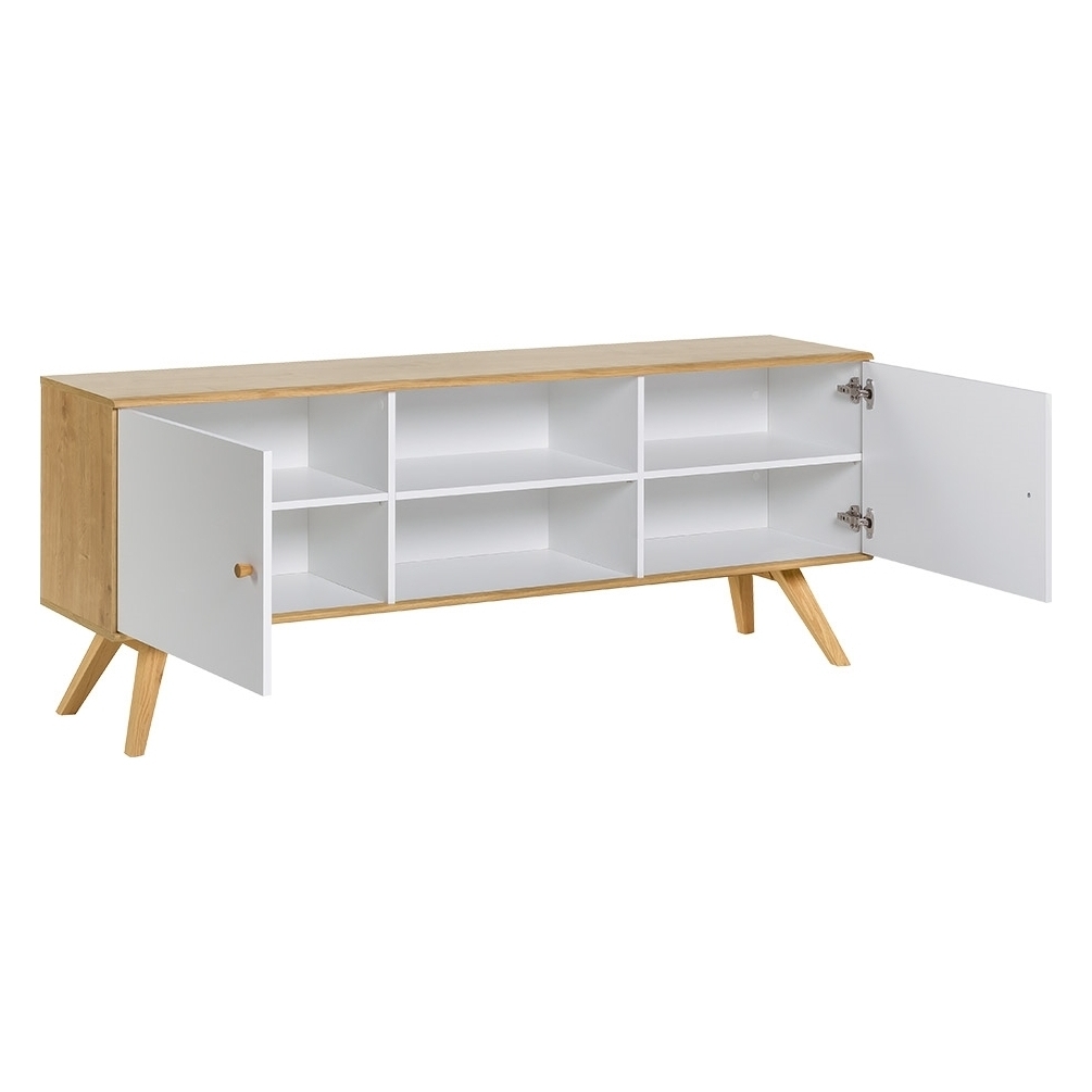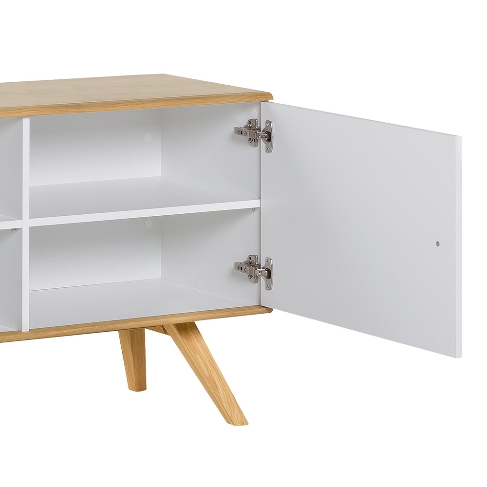 I really like this sideboard for its clean, modern look that balances practicality with style. The white and oak effect finish makes it versatile enough to slot into a range of interiors, from Scandinavian-inspired schemes to contemporary living spaces. Its slim profile and angled legs give it a neat, understated presence, making it ideal for smaller rooms or as a statement piece in open-plan areas. When styling, consider adding a few decorative touches on top-like a houseplant, a stack of books, or a statement lamp-to keep the look fresh and inviting. Practical for storage, its sliding doors help keep clutter out of sight, making it a handy addition to dining rooms, living rooms, or even hallways.