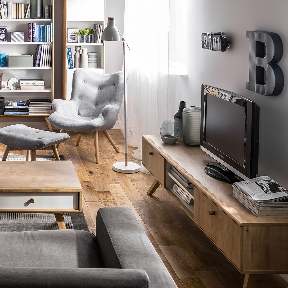 I really like this wooden TV stand in oak effect - it offers a clean, contemporary look with its light natural finish, making it versatile for many interiors. It works especially well in Scandi-inspired spaces or modern minimalist rooms where simplicity and lightness are key. Practical styling tips include clustering a few minimalist decorative objects, such as vases or books, on top, while using the open shelves for media devices or baskets to hide cables and clutter. Its sturdy build and neutral tones mean it can also serve as a functional focal point in living rooms, complementing both neutral palettes and more colourful environments. The sleek, angled legs add a subtle touch of style without overpowering the space, making it a clever choice for a stylish yet practical media unit.