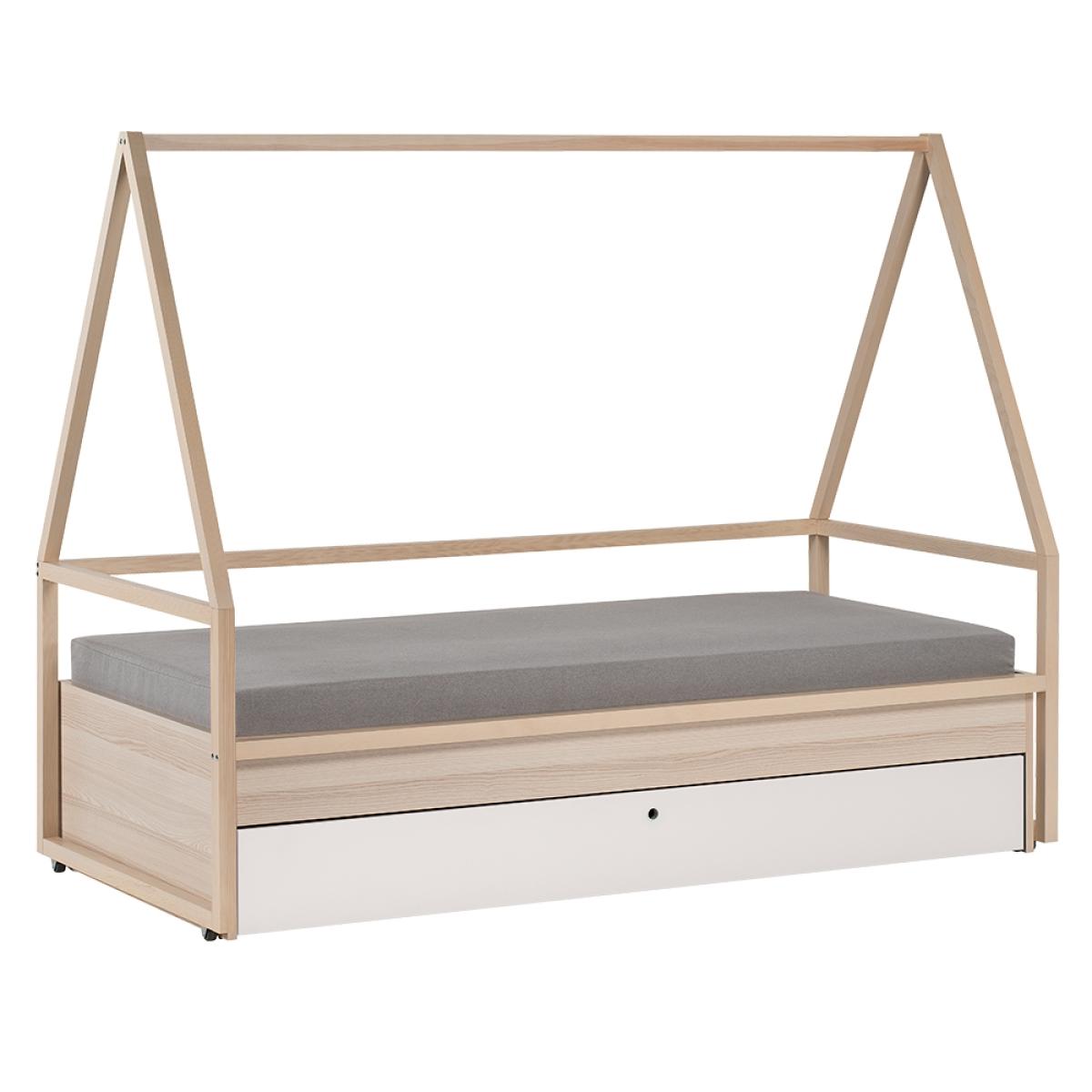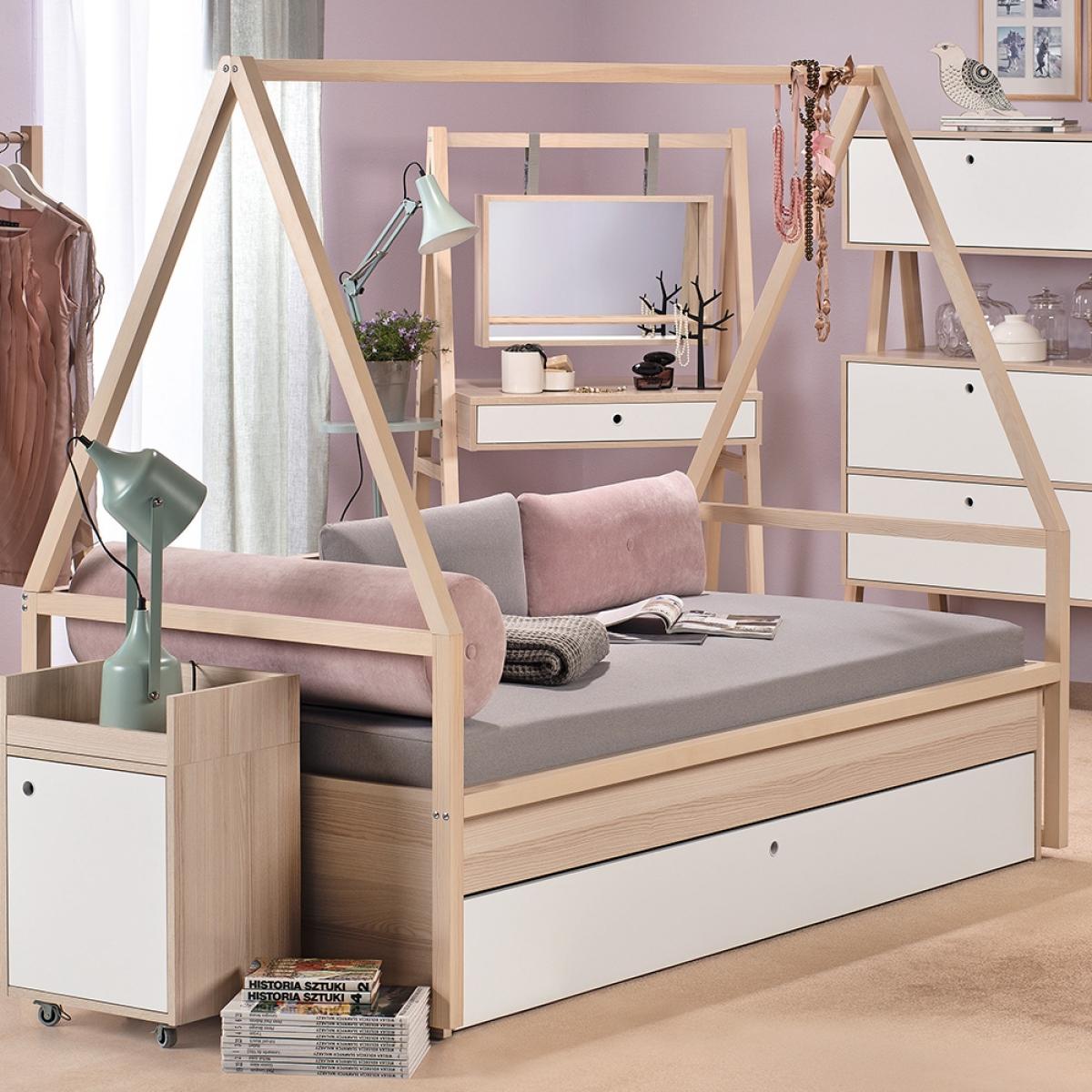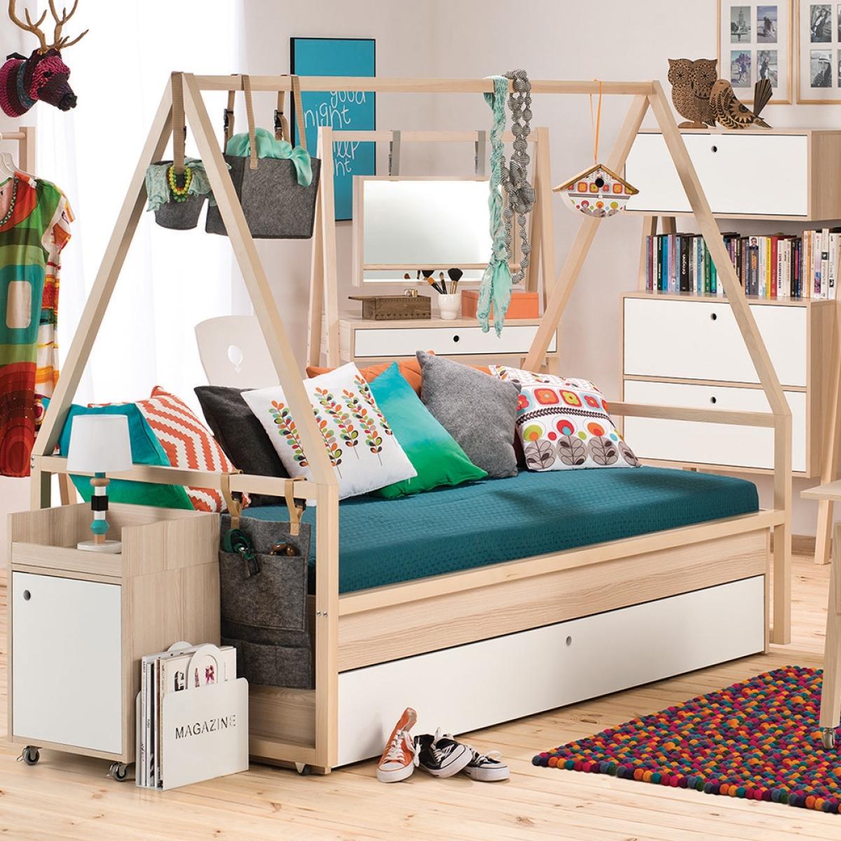 Who says you need to leave the house to go camping? The fantastic new Spot Bed with Teepee Frame from Vox is the perfect unique kids bed for little adventurers and wannabe nomads! The Tipi Bed Frame comes on wheels, so it can be positioned over the bed to create a fun Teepee Cabin Bed option, or it can be moved during the day and used as a stunning teepee den. The stylish A-frame design is easy to customise with drapes, curtains, cotton ball lights, feather boas - whatever takes your fancy! - to create a cool. Kids themed bedroom. , or use with the matching Tipi Tent (available separately) to create an enclosed kids bed or play area. This unique Scandi-style single bed also comes with a trundle drawer underneath, which provides either storage or can be upgraded to a pullout bed for a second mattress - perfect for sleepovers. Whether its alpine adventurers or camping under the stars, this versatile Tepee Bed will help fuel their imaginations, and keep them occupied for hours. Matching kids furniture items from the Spot range by Vox are also available at Cuckooland.