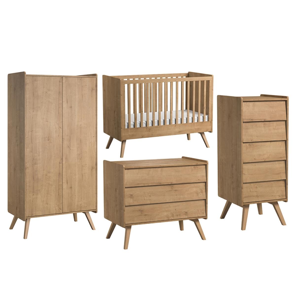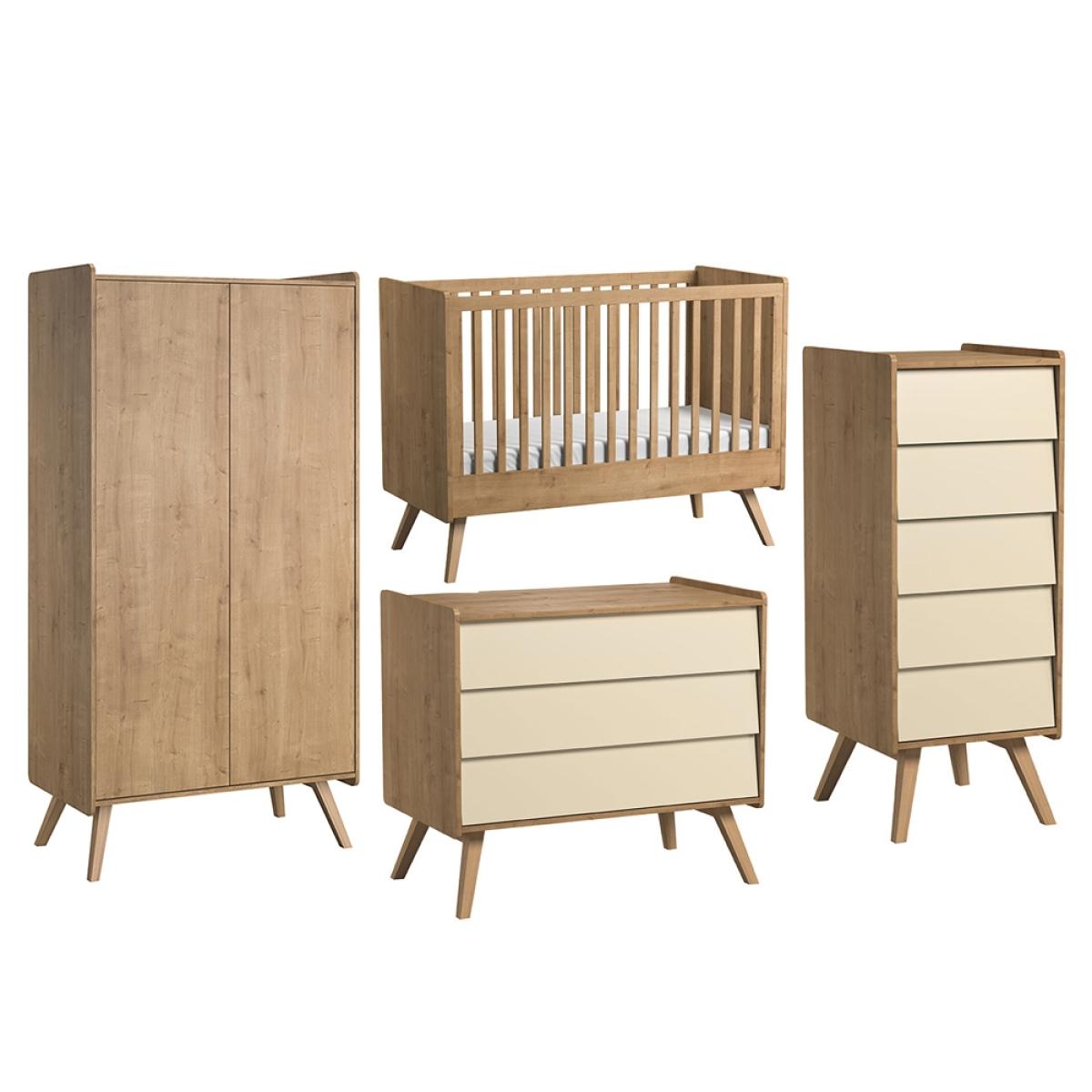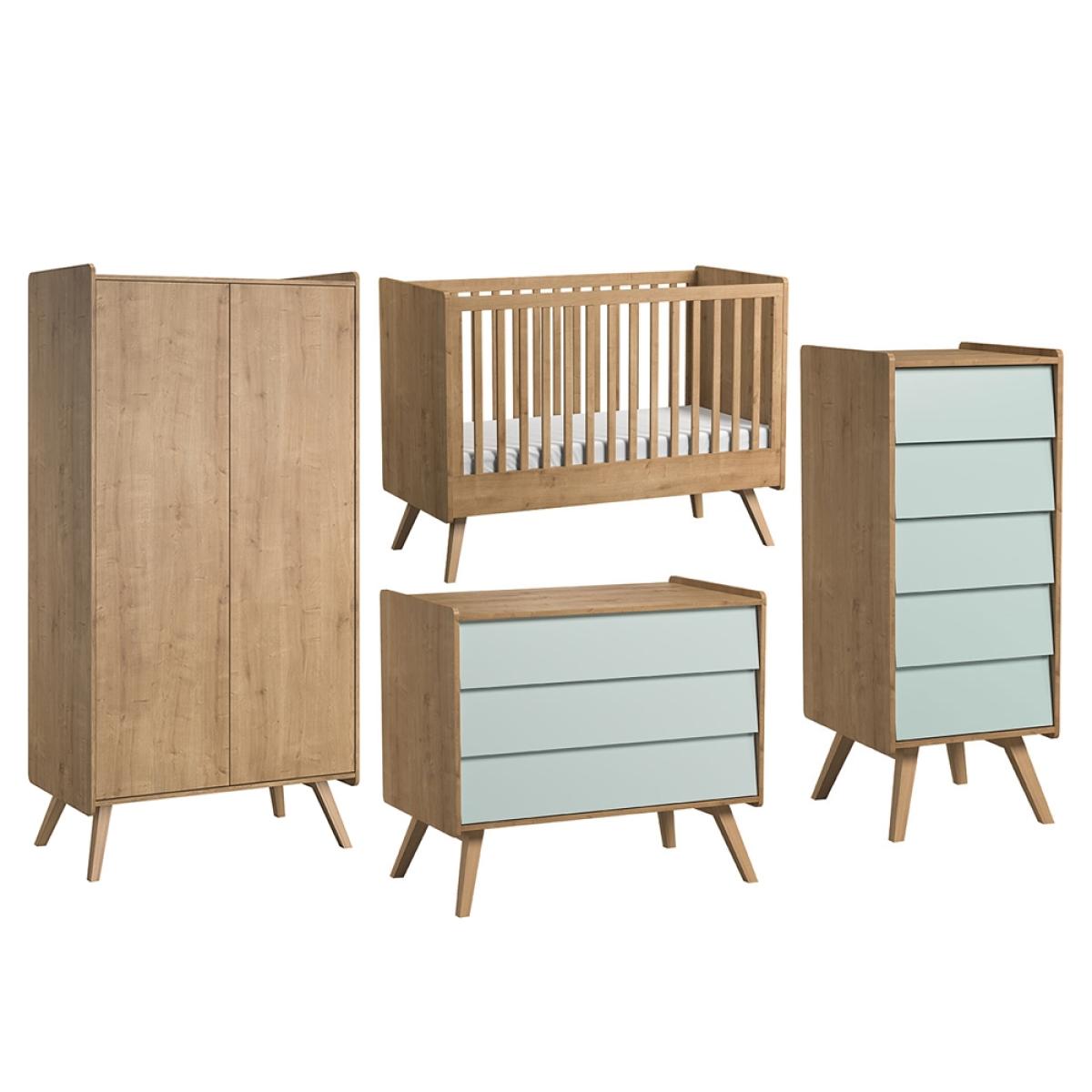 Stylish? Check! Storage? Lots of it! Possibly the sweetest nursery furniture you've ever seen? Most certainly! We give you the Vox Vintage 4 Piece Cot Bed Nursery Furniture Set. Vintage elements paired with Scandinavian styling and a nod to the seaside? We can't get enough! Including a convertible cot bed, adapt the frame to suit your tiny tot. The height adjustable cot bed base has 3 levels so as they grow they're safe at every stage. And when the cot is no longer needed, transform into a toddler bed and make the transition to big kids bed a much easier prospect. The double wardrobe with hanging rail and shelves, 3 drawer dresser and tall 5 drawer dresser will keep all of their wee onesies and precious pyjamas neat and tidy! The 3 drawer chest of drawers can be converted into a baby changing station with the changing top available separately making night time accidents a total breeze! With 6 gorgeous colours to choose from, choose your favourite set and decorate the nursery just like you dreamed!.