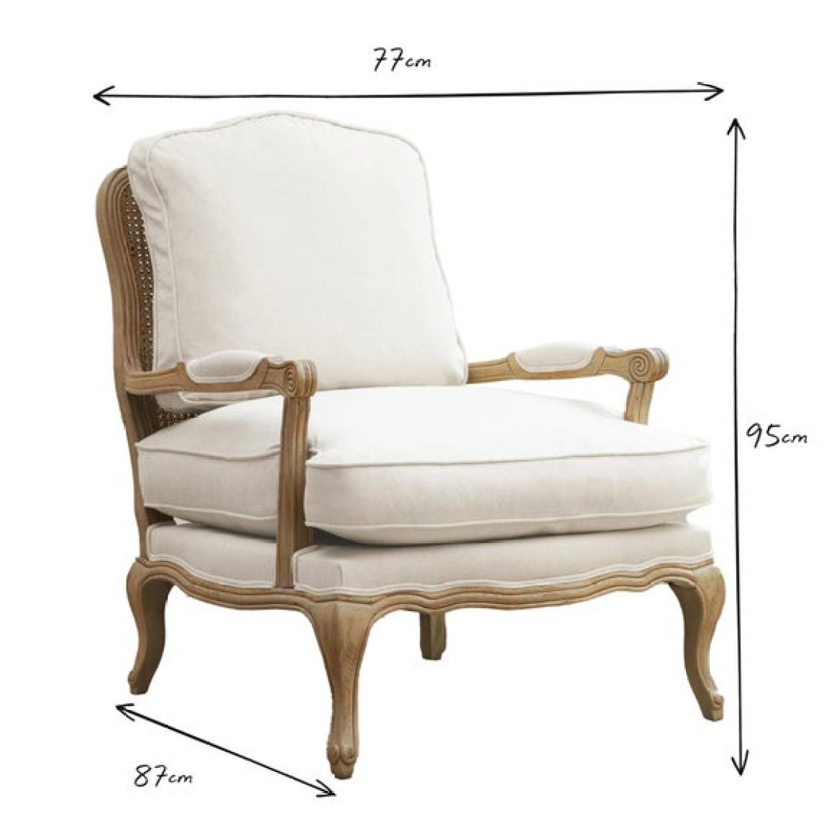 I love this armchair for its classic yet versatile design that works well in both traditional and cottage-style interiors. The slightly distressed wooden frame adds a charming, vintage touch, while the comfortable, cushioned seat makes it ideal for relaxed seating. It’s perfect for a cosy corner, whether used as a statement piece in a living room or as an accent chair in a bedroom or dressing room. Practical styling tips include pairing it with textured throws or patterned cushions to enhance its character, or adding a small side table nearby for functionality. Its neutral tones and elegant silhouette make it easy to integrate into a variety of colour schemes, from soft pastels to richer hues.