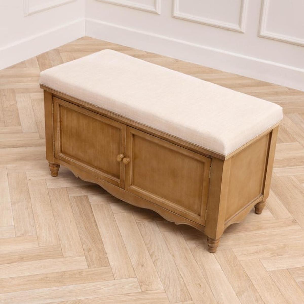 I love this bench for its versatile style and practical storage. The combination of its classic wooden design with a neutral upholstered seat makes it a great addition to both traditional and contemporary interiors. It works particularly well in hallways, bedrooms, or under windows, providing a handy spot to sit while putting on shoes or to keep blankets and accessories out of sight. To style it effectively, consider pairing it with floral or patterned cushions to add a pop of colour, and place it alongside a cosy armchair or beside a bed for a cohesive look. Its neutral tones make it adaptable to various colour schemes, while its storage function helps keep clutter at bay.