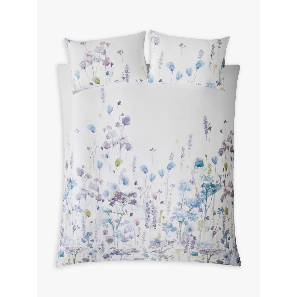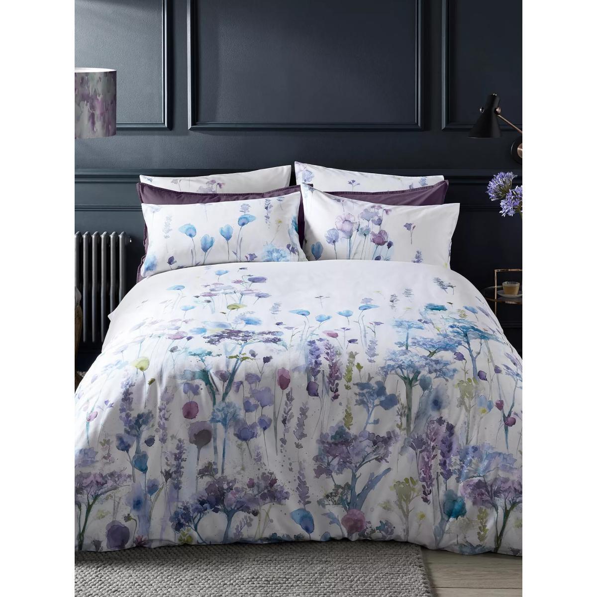 A beautiful collection of meadow flowers with splashes of watercolour in soft blues, pale olives and warm amethyst tones. Printed onto a luxurious 220 thread count 100% cotton sateen, what could be more relaxing for a peaceful nights sleep? The single set comes with one standard pillowcase, while the double, king and super king sets come with two standard pillowcases. Have you thought about sheeting? Shop. Bedding sizes To fit duvet/pillow size (cm) Standard pillowcase, L75 x W50cm Single duvet cover, L200 x W135cm Double duvet cover, L200 x W200cm King duvet cover, L220 x W225cm Super king duvet cover, L220 x W260cm