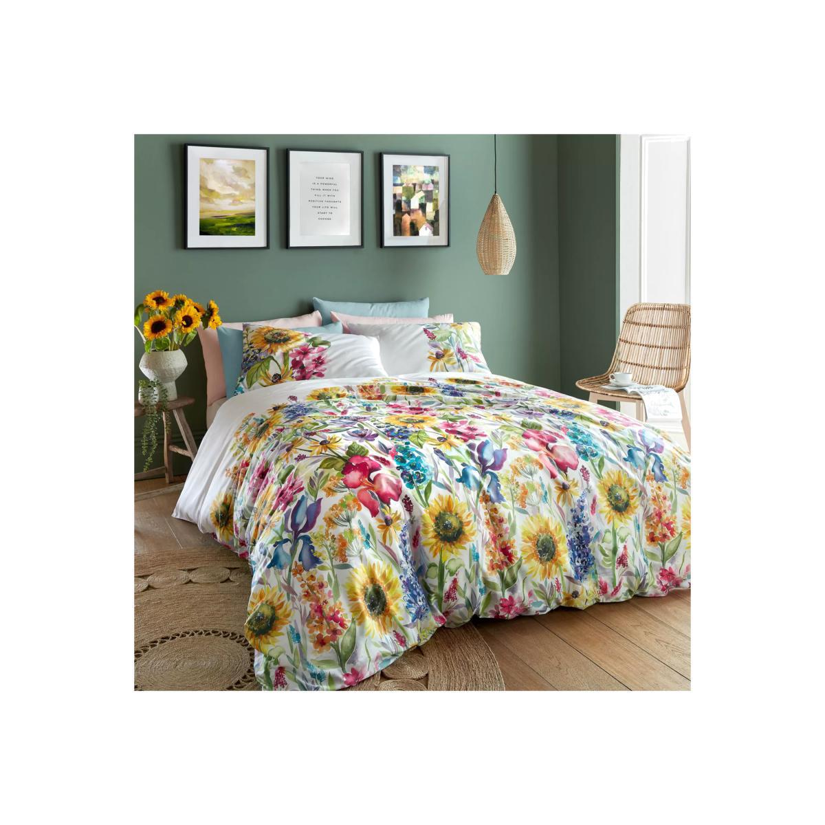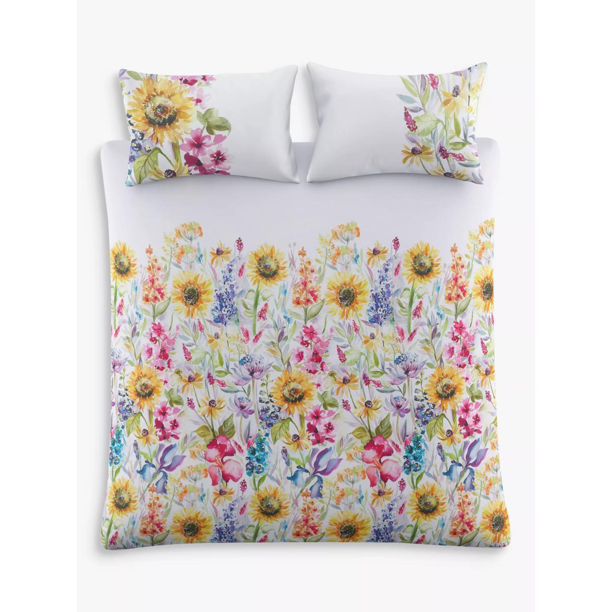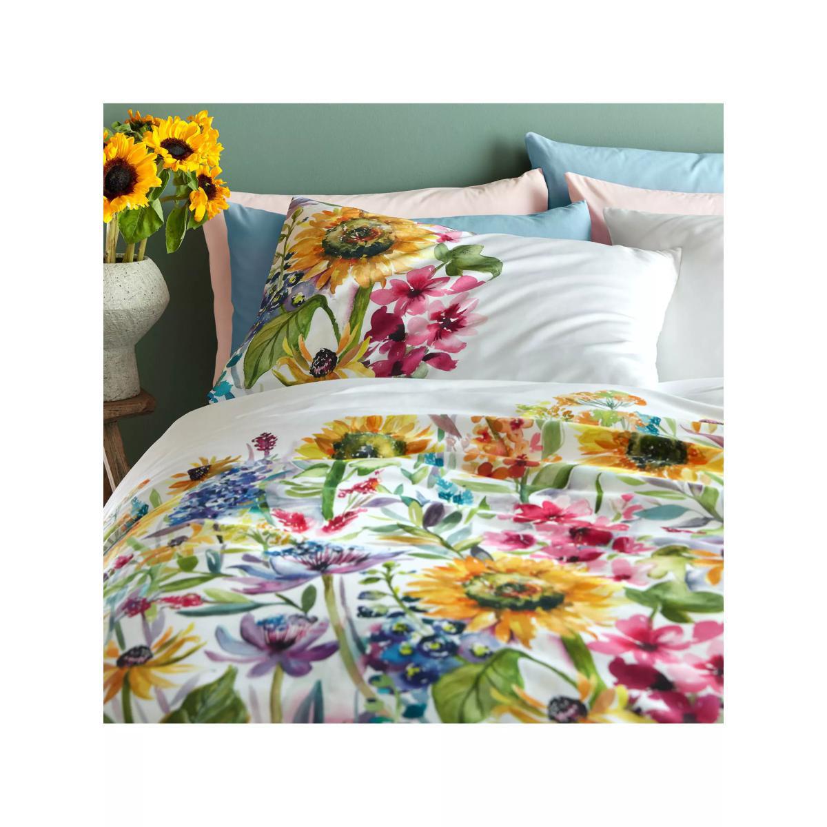 A bright summer floral with beautiful watercolour sunflowers, this vibrant design, hand-painted in a delightful fresh palette, is printed onto a crisp, white 220 thread count cotton sateen and comes complete with matching pillowcases in two different designs.. The naturally breathable fabric helps keep you cool and comfortable throughout the night. The single set comes with one standard pillowcase, while the double, king and super king sets come with two standard pillowcases. Have you thought about sheeting? Shop. Bedding sizes To fit duvet/pillow size (cm) Standard pillowcase, L75 x W50cm Single duvet cover, L200 x W135cm Double duvet cover, L200 x W200cm King duvet cover, L220 x W225cm Super king duvet cover, L220 x W260cm