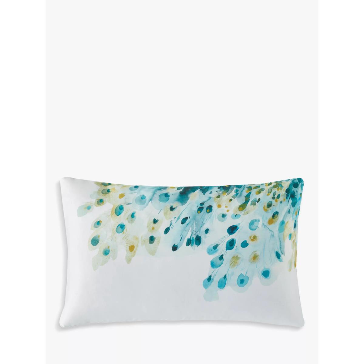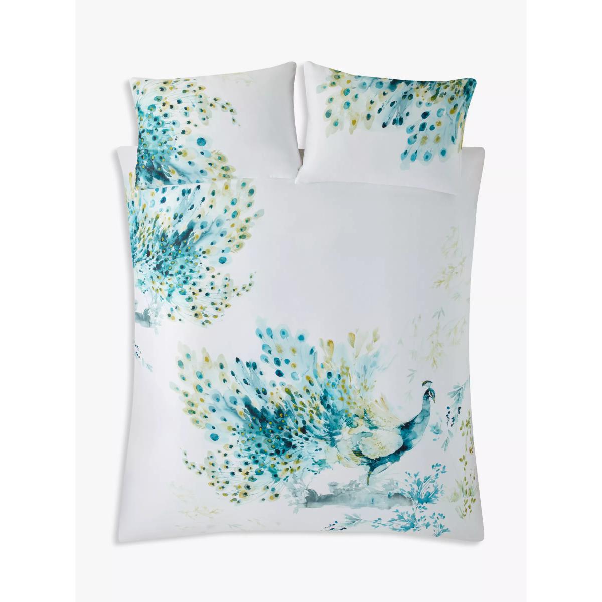 A handsome, hand-painted peacock proudly adorns this stunning bed linen. Printed onto a silky soft 200 thread count cotton sateen ground, in a sumptuous palette of teals and ochres, this design is both opulent and striking. The single set comes with one standard pillowcase, while the double, king and super king sets come with two standard pillowcases. Have you thought about sheeting? Shop. Bedding sizes To fit duvet/pillow size (cm) Standard pillowcase, L75 x W50cm Single duvet cover, L200 x W135cm Double duvet cover, L200 x W200cm King duvet cover, L220 x W225cm Super king duvet cover, L220 x W260cm