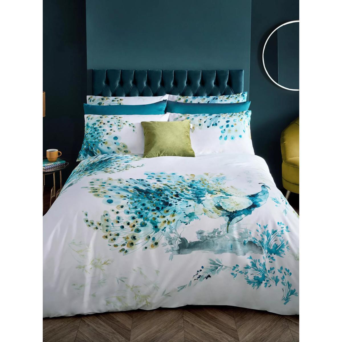 A handsome, hand-painted peacock proudly adorns this stunning bed linen. Printed onto a silky soft 200 thread count cotton sateen ground, in a sumptuous palette of teals and ochres, this design is both opulent and striking. The single set comes with one standard pillowcase, while the double, king and super king sets come with two standard pillowcases. Have you thought about sheeting? Shop here. Bedding sizes To fit duvet/pillow size (cm) Standard pillowcase, L75 x W50cm Single duvet cover, L200 x W135cm Double duvet cover, L200 x W200cm King duvet cover, L220 x W225cm Super king duvet cover, L220 x W260cm