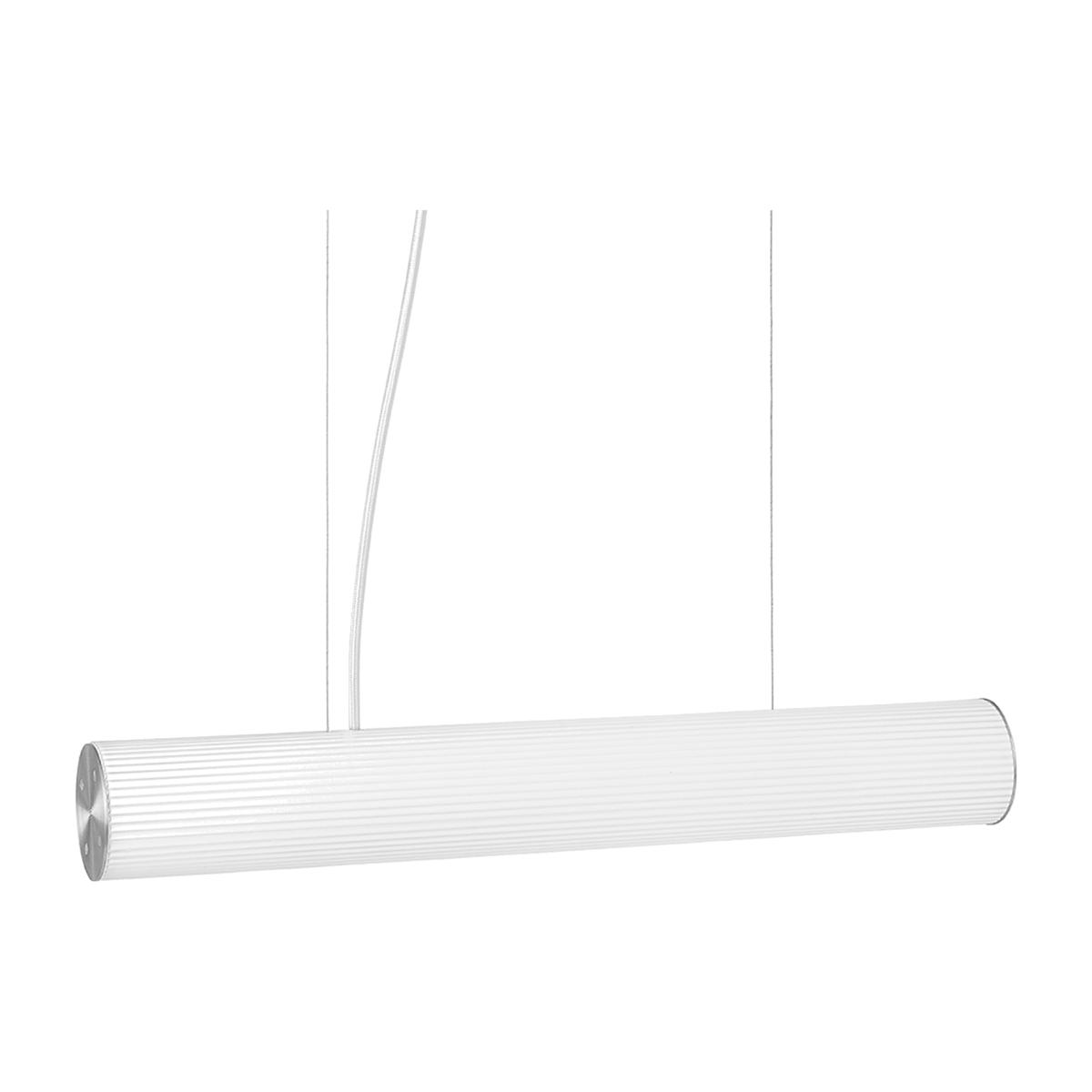 The Vuelta pendant lamp 60 cm from the Danish company Ferm Living is made of ruffled, mouth-blown glass and has an oblong, cylinder-formed design with brushed metal plates at either end, which creates for a lovely contrast to the glass. This ceiling lamp has a built-in LED light source that emits a soft, diffused light in the room and comes with a practical dimmer, allowing you to choose the feel of the room when desired. This Vuelta ceiling lamp hangs horizontally so it's best placed above a kitchen island, or somewhere similar.