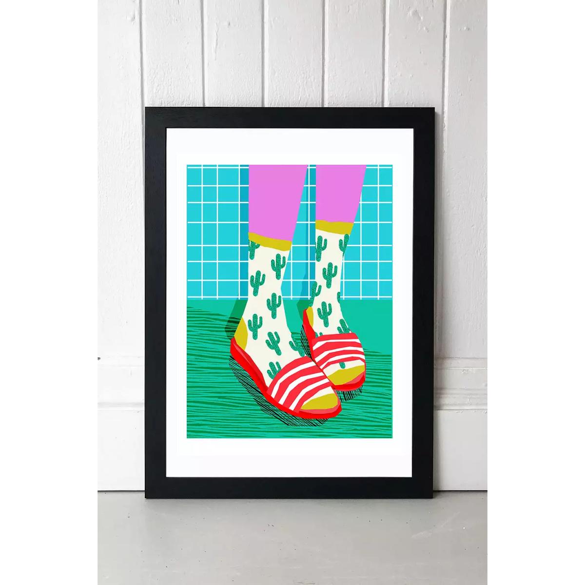 Quirky patterned cactus socks print by Wacka Design. Printed on high-quality archival paper. Available framed or unframed. **About the Frame** \- Obeche wood with an acrylic glaze finish \- All are fitted with protective plexiglass \- Complete with a ready-to-hang saw tooth at the back **Content + Care** \- Paper \- Wipe clean **Size** \- A1: 59.4cm x 84.1cm \- A2: 42cm x 59.4cm \- A3: 29.7cm x 42cm