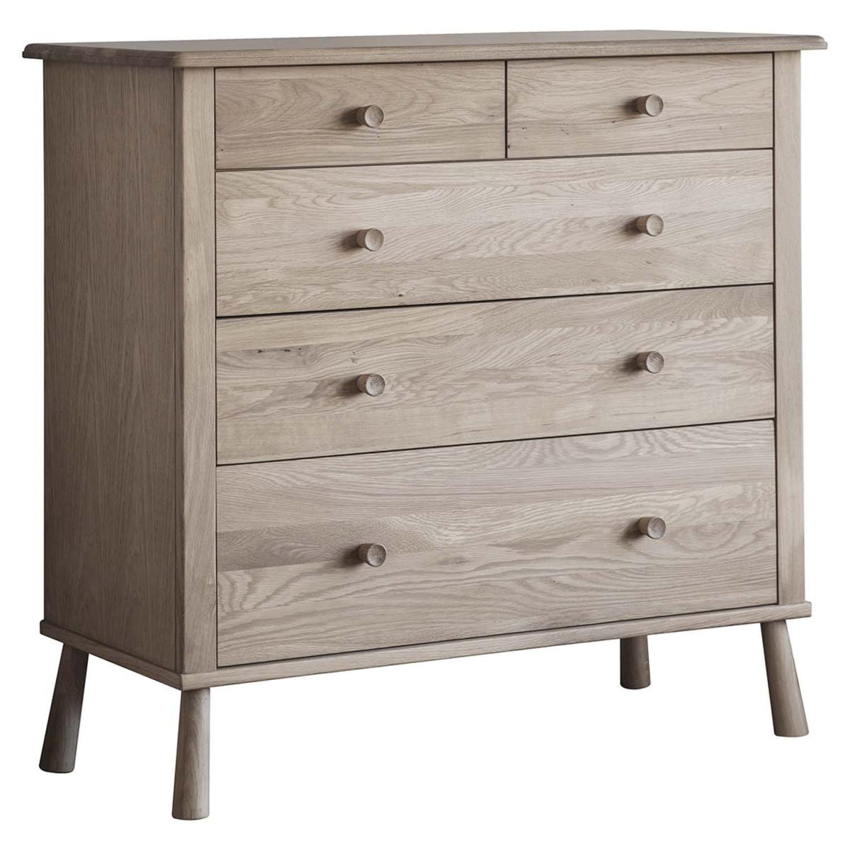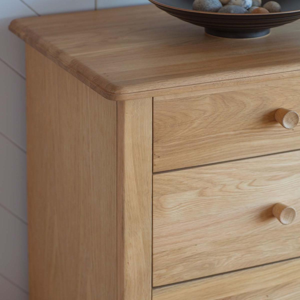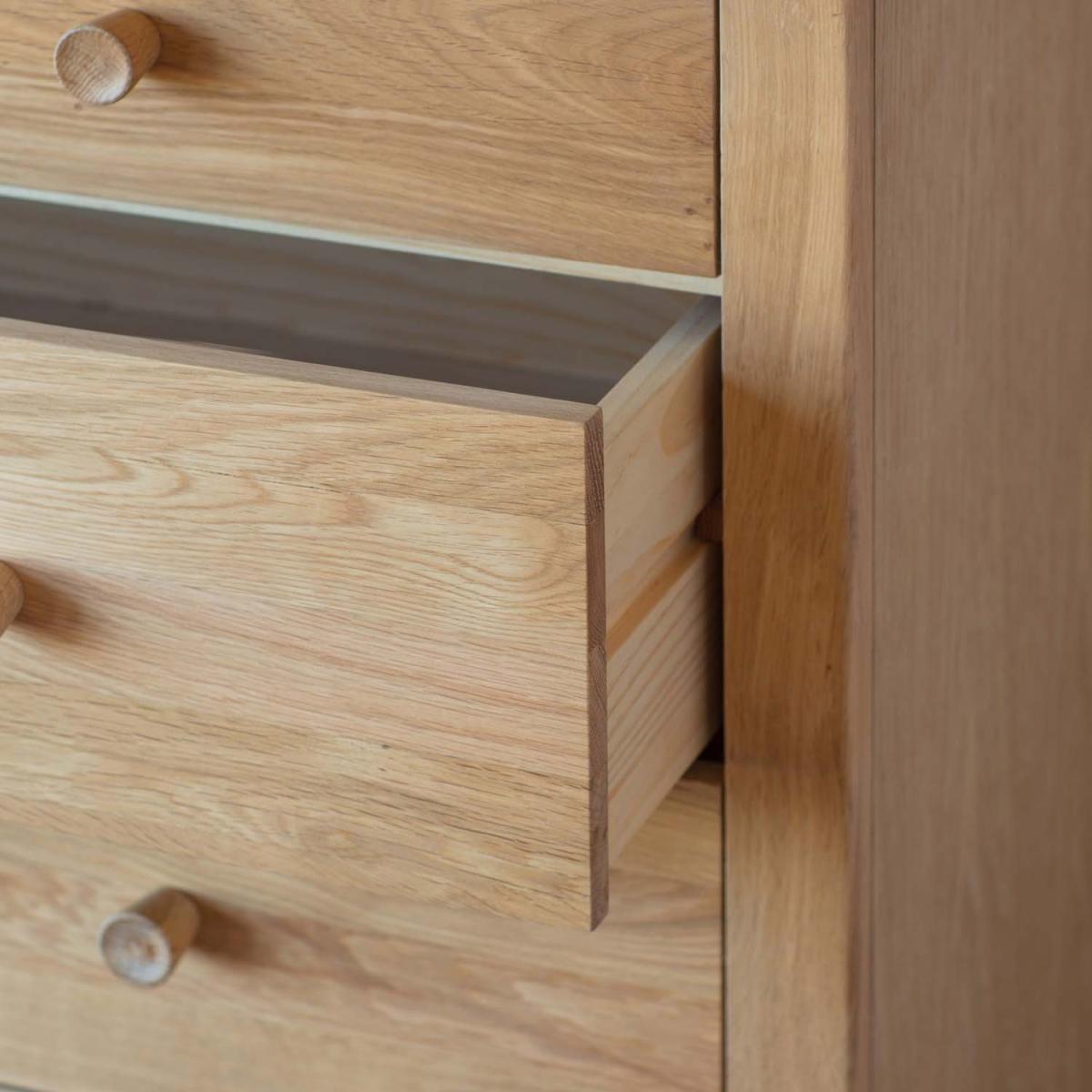 The Waddon chest of drawers offers the best of practical simplicity. Made from a combination of the finest solid oak and veneers, this drawer chest creates a contemporary aesthetic colour palette that is the essence of Nordic style. Its convenient three large drawers with two smaller ones along the top are an extremely useful element for helping to tidy away different sized collections of clothes.
