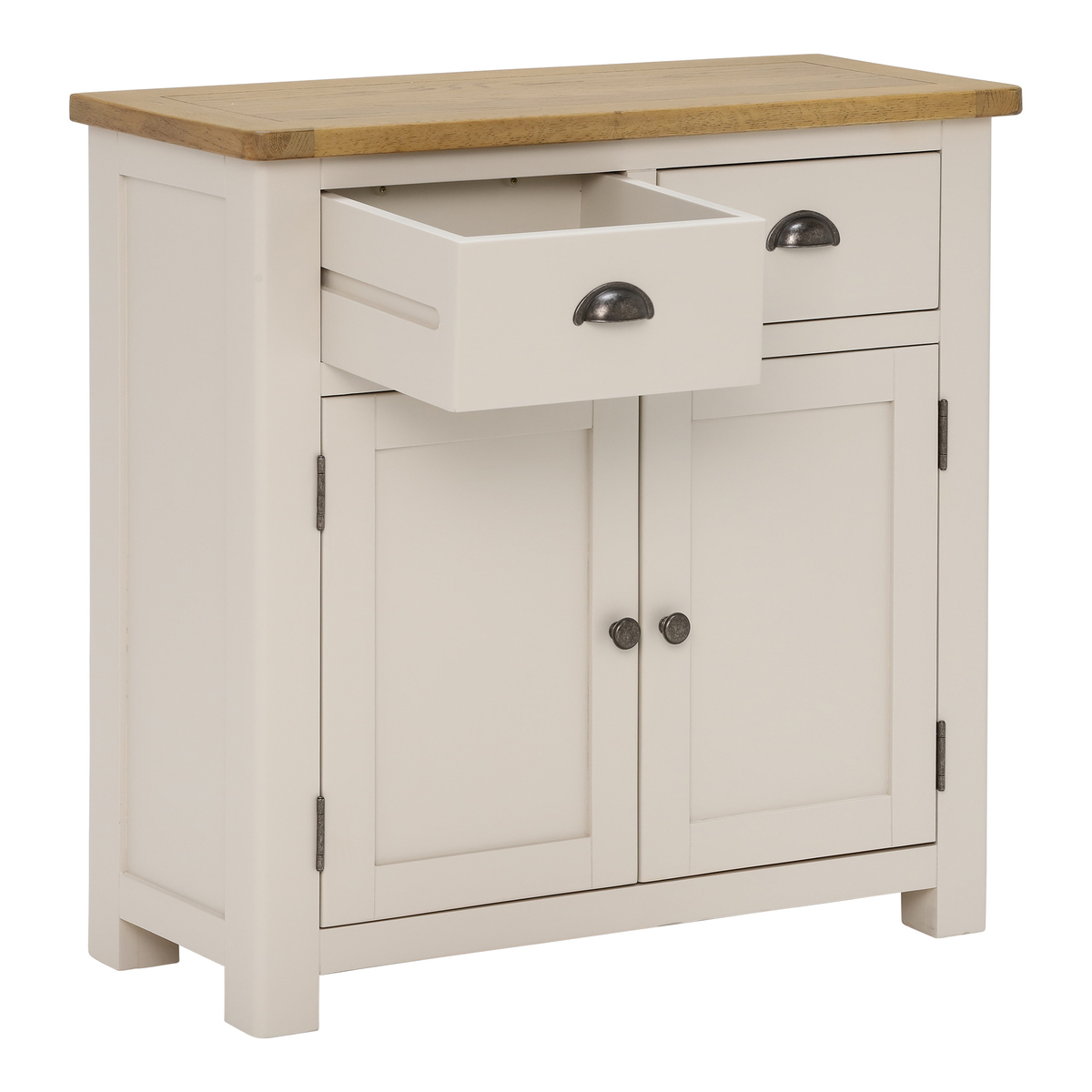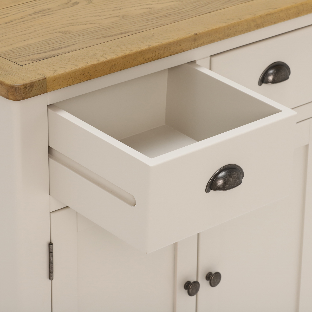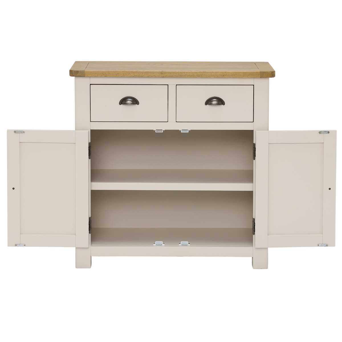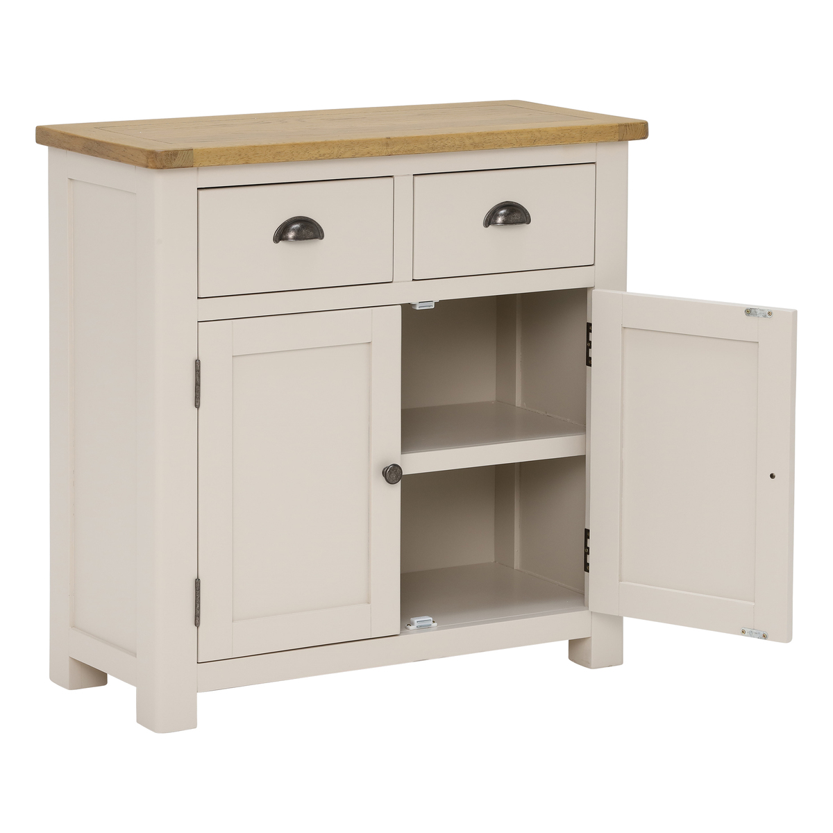 Gorgeous storage that doesn’t overpower your space, the Wainwright 2 Door 2 Drawer Sideboard is a stylish and practical means of stowing away your dining area essentials. With a stunning two-tone aesthetic that combines a rustic oak top with a modern, linen painted base, the Wainwright combines modern and classic styles to achieve its striking timeless appearance. Featuring two handy drawers, ideal for cutlery and other small possessions, the Wainwright’s spacious cupboard with a fixed central shelf is perfect for hiding away tableware for birthdays and special occasions so that it is on hand but out of sight.