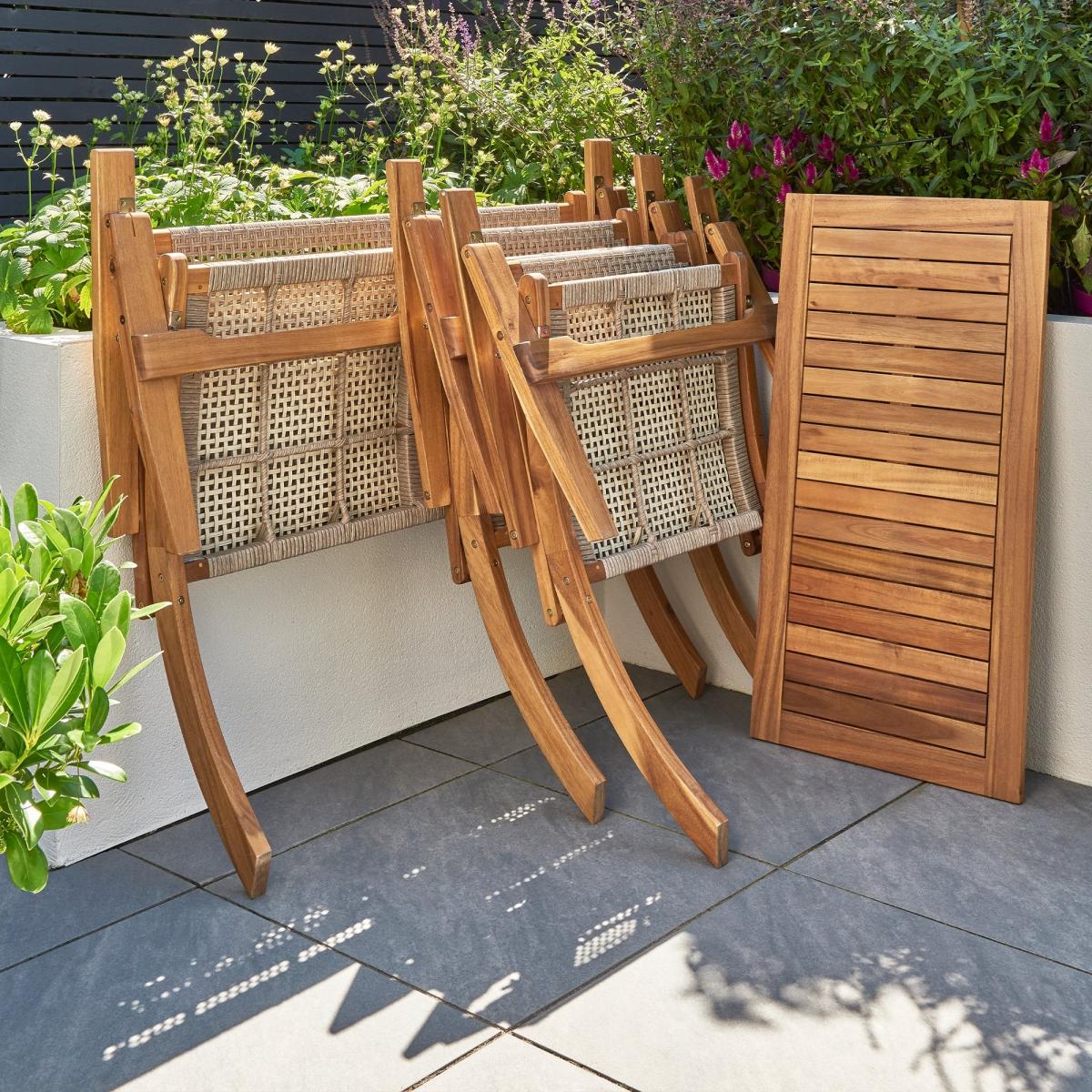 A great way to relax this summer, just unfold the table, bench and chairs to create a contemporary seating area within your garden. The weave and acacia is weatherproof with a powder coating to help prevent rusting. Store this set with ease by folding all the pieces. Easily wipe the set clean when required.