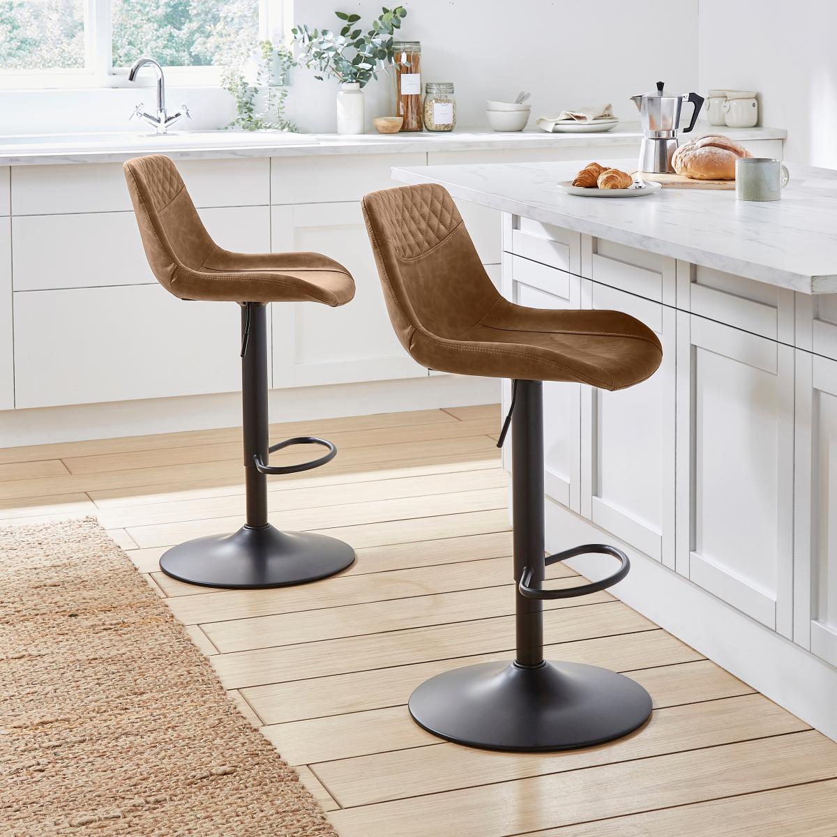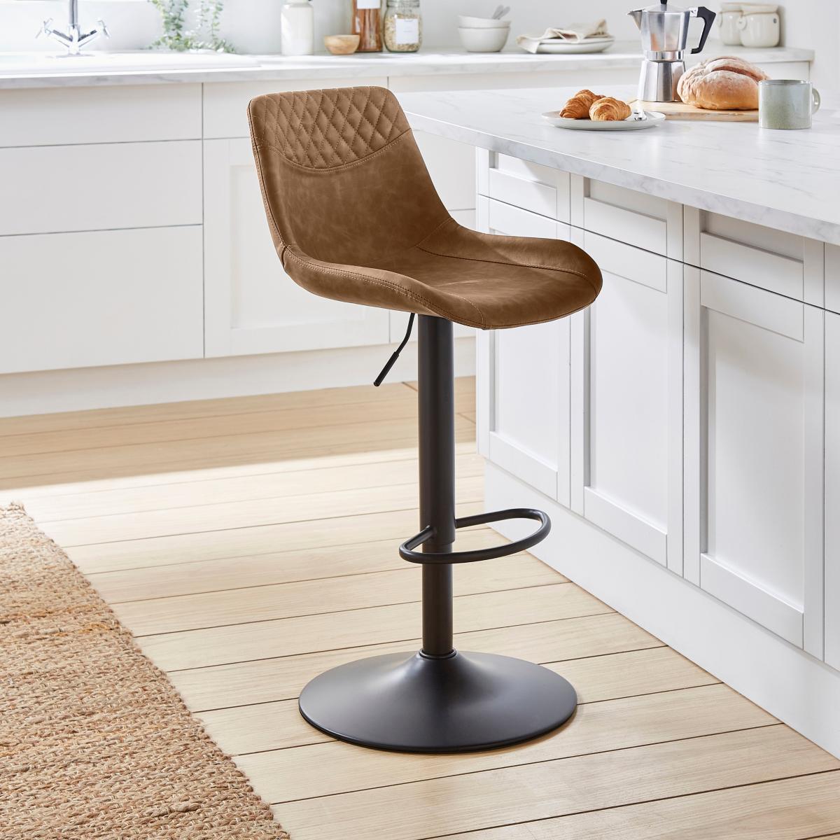 I’m a fan of this Walden bar stool for its smooth height-adjust mechanism and subtle quilted detail, which make it both practical and visually appealing at any breakfast bar. The warm faux-leather upholstery and matte-black base sit comfortably within contemporary, industrial or Scandi-inspired kitchens - pair with a light wood countertop or marble island to let the stool’s tone stand out. For easy styling, layer in a natural-fibre rug beneath, add a couple of matching stools for balance and hang brass or black-metal pendant lights overhead to tie the scheme together.