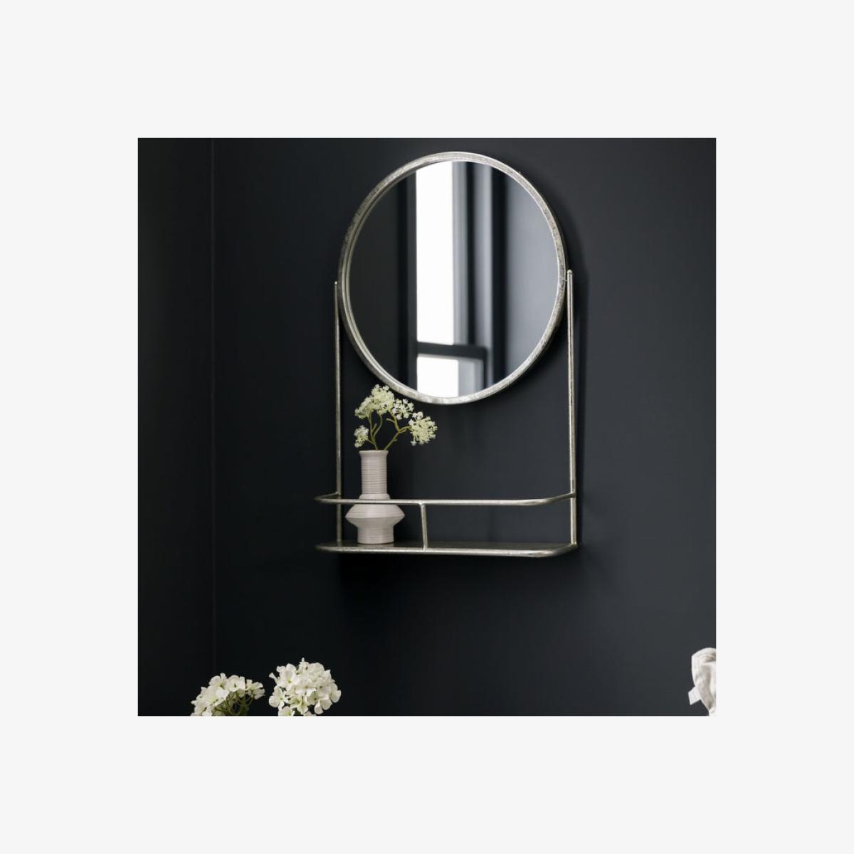 A mirror unique in design with industrial style framing in a silver finish. The design incorporates an exposed shelving element for practical use and can be wall mounted. Shape: Round. Material:Glass / Iron / MDF. Colour/Finish: Silver.