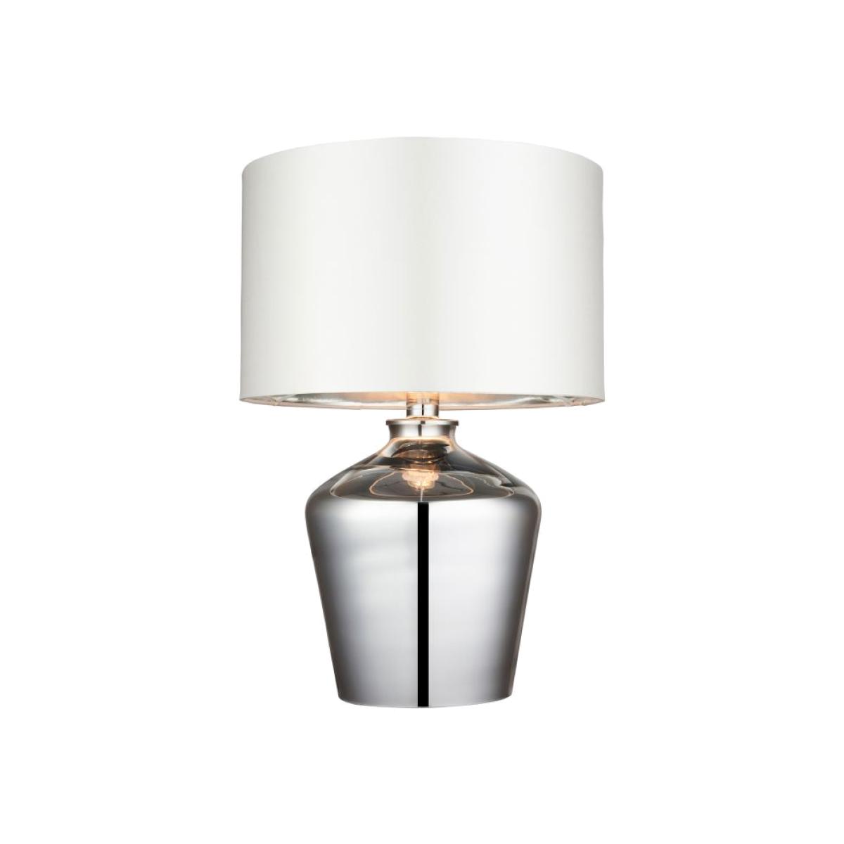 A chic glass table lamp with a high shine chromed glass base with a ivory faux silk shade. Fitted with inline switch. Suitable for use with LED lamps.