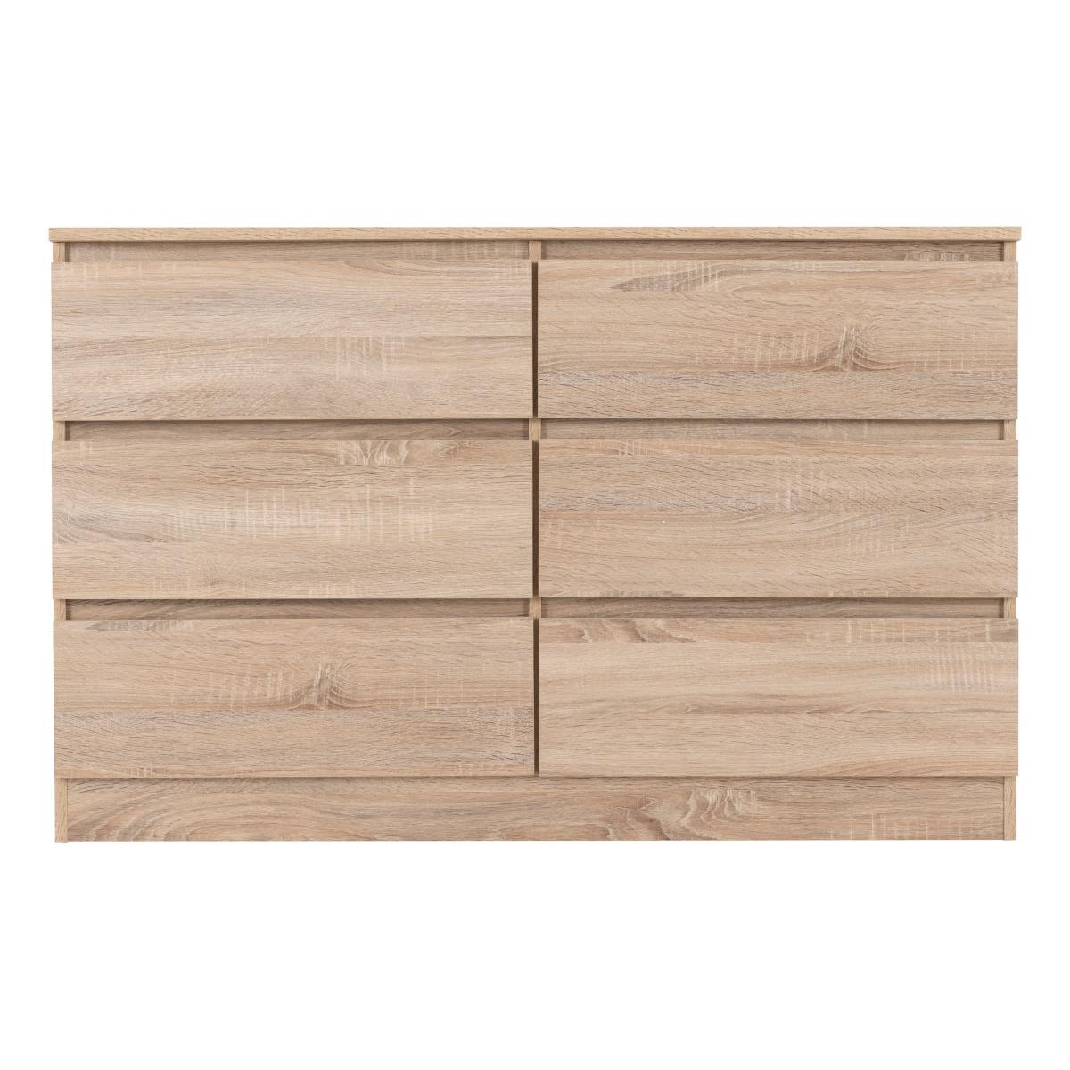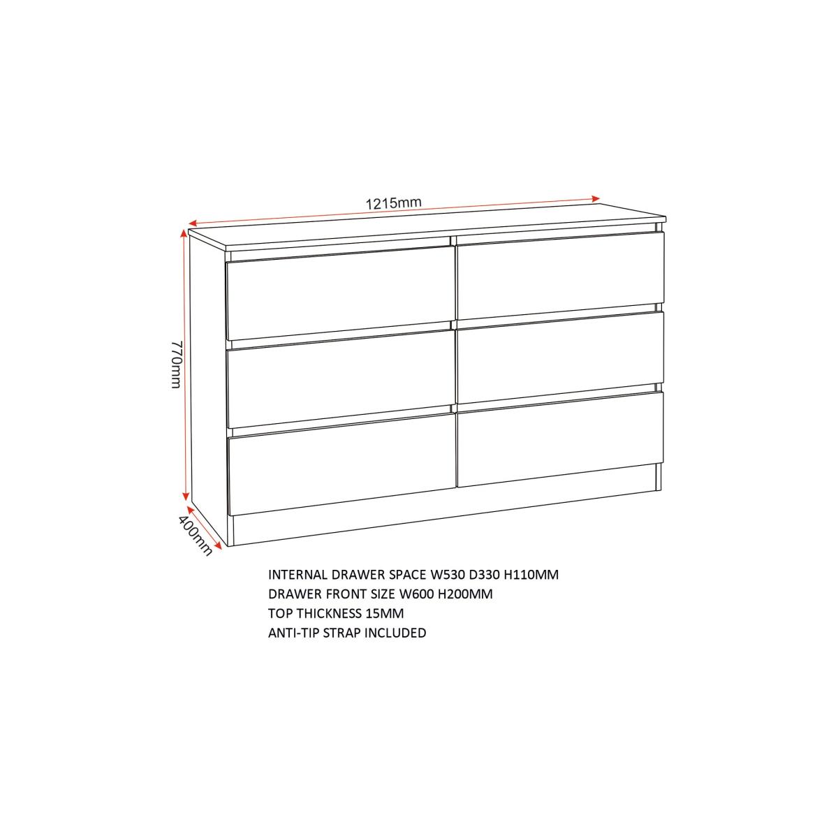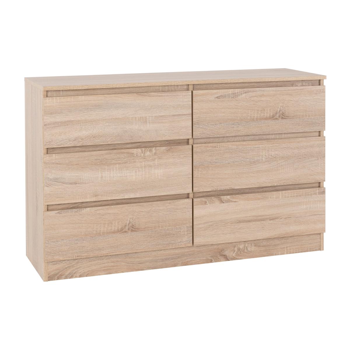 * Available in multiple wooden finishes* 6 spacious drawers* Quick assembly Featuring six spacious drawers, this chest offers ample storage space for organising clothes, accessories, and personal belongings neatly. Crafted from sturdy materials, this cheat ensures durability and reliability, making it a lasting investment for your bedroom. Its sleek silhouette, enhanced by discreet handles and available in various wooden finishes such as classic oak or contemporary grey, seamlessly integrates into any bedroom decor scheme.