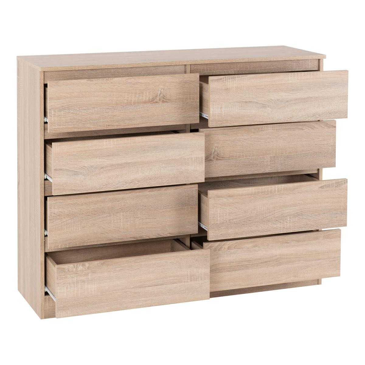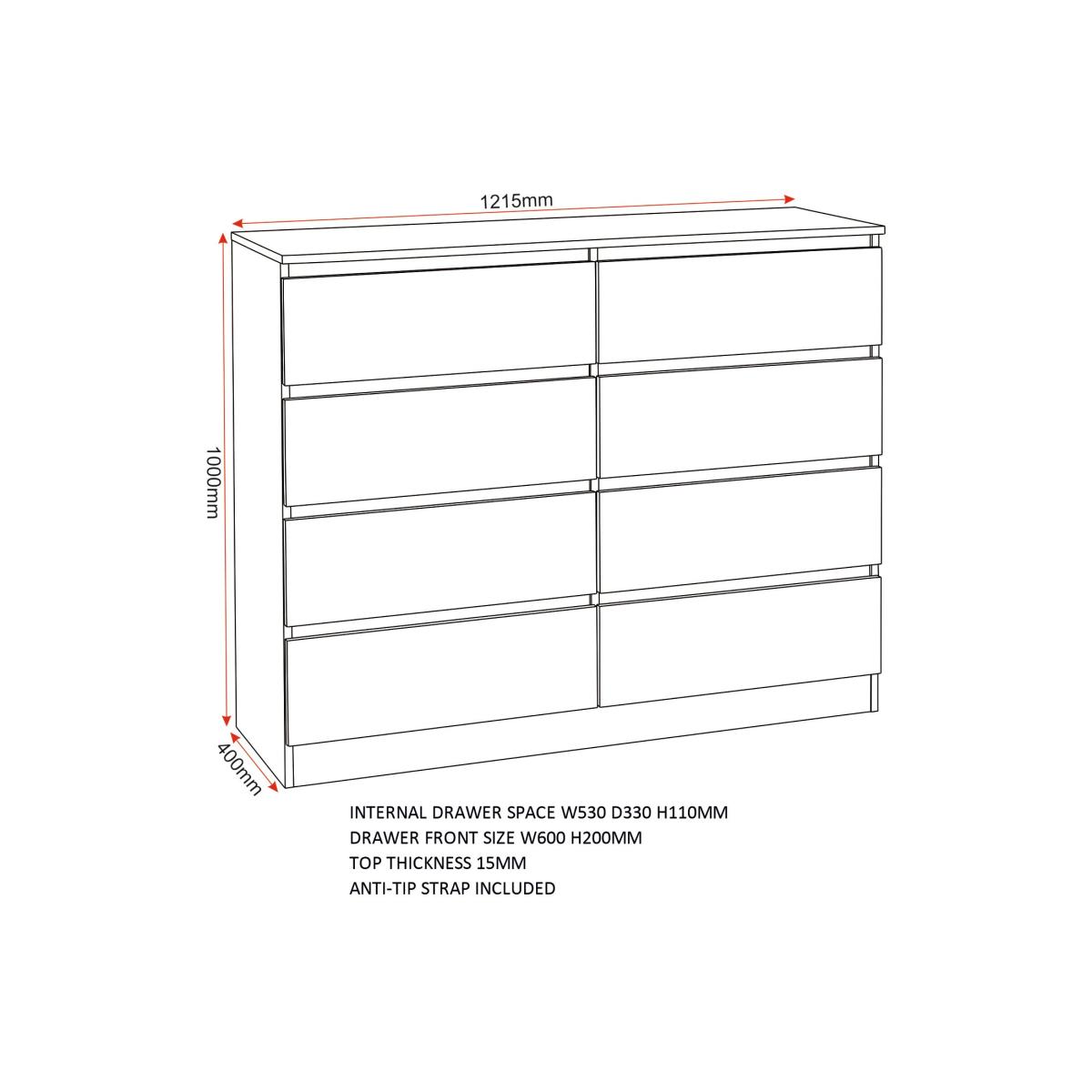 * Available in multiple wooden finishes* 8 spacious drawers* Quick assembly This chest features eight generously-sized drawers, providing ample space to neatly organise clothing, accessories, or any other essentials. Crafted with durability in mind, this chest is built from robust materials that ensure long-lasting use and reliability. Its sleek design is complemented by discreet handles and a choice of multiple wooden finishes, including classic oak and modern grey, allowing it to seamlessly integrate into any bedroom decor.