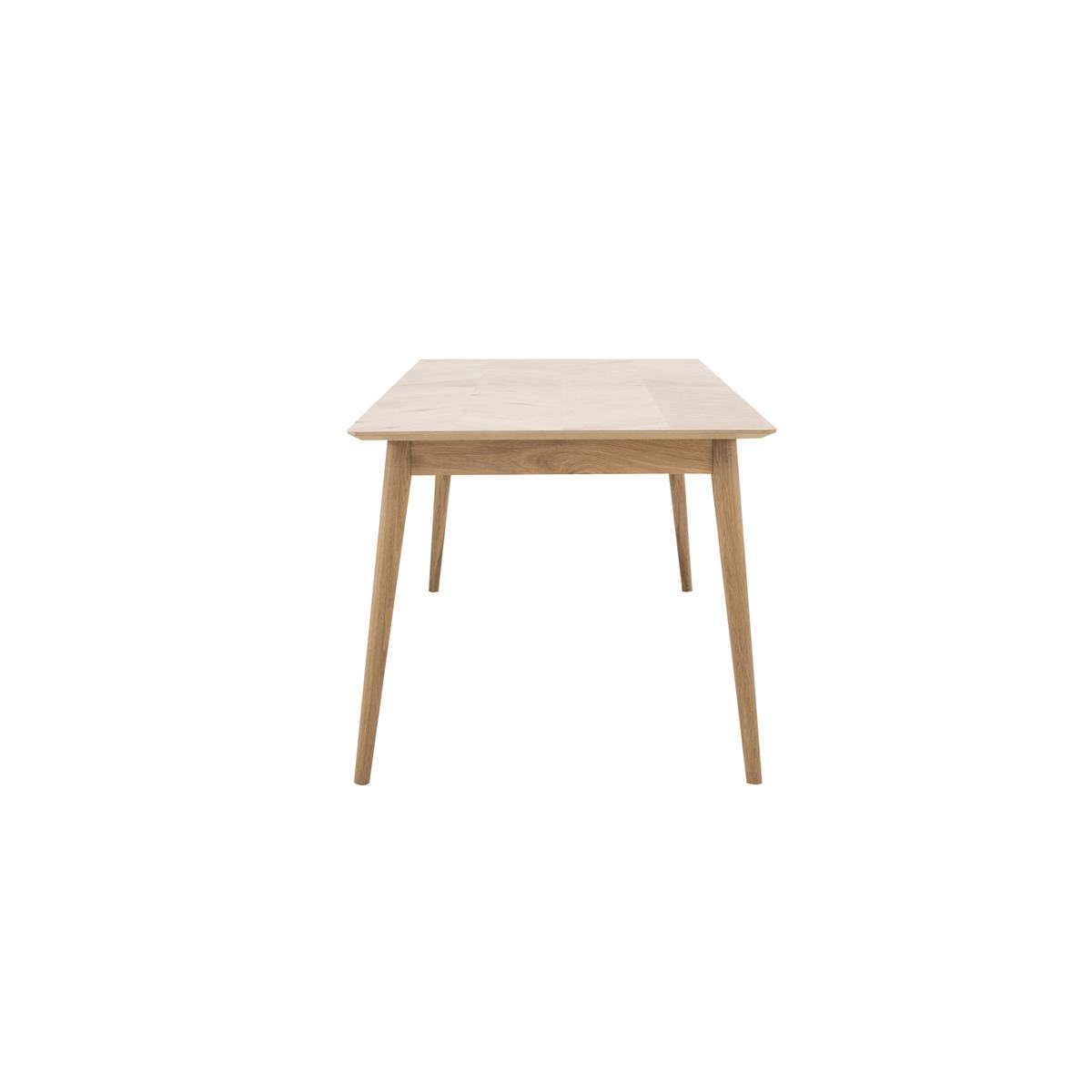 The Walker range of dining and living room furniture is all about the wood. Crafted from European oak and with rustic oak veneers, Walker celebrates the beauty of real wood, highlighting its natural texture, knots and grain with a variety of specialist techniques. Pieces feature a brushed out grain, where the softer wood grain is brushed away leaving harder wood grain more prominent for a lovely textured appearance. Table tops and cupboard doors showcase the range’s signature inlaid wood grain chevron patterning. And all pieces are finished with a natural-looking matte lacquer. Inspired by mid-century style with clean lines, simple forms and rounded splayed legs, Walker’s dining tables, storage pieces and occasional tables are sure to find a place in any stylish contemporary home. Simple and elegant, the Walker extending dining table combines beautiful wood grain texture with clean-lined desig. This stunning table extends to seat eight with an easy-to-use butterfly mechanism and is made from European oak. The top has a rustic oak veneer surface with an inlaid chevron pattern. Throughout, the wood has a brushed out grain, which beautifully highlights the contrast between the harder and softer wood grain, giving it a unique texture. This piece is finished with a specialist matte lacquer, ensuring a natural appearance. Rounded splayed legs complete the simple, mid-century look of this striking dining table. The Walker extending dining table is part of the Walker range of living room and dining room pieces and pairs beautifully with the Walker bench for a casual dining room seating situation.