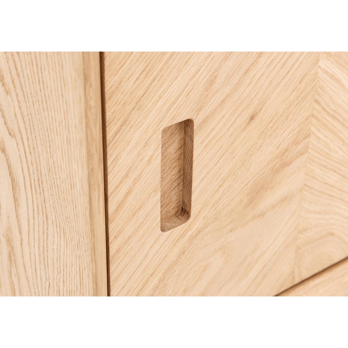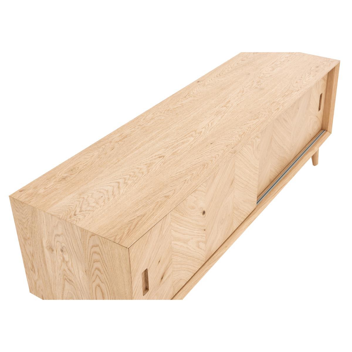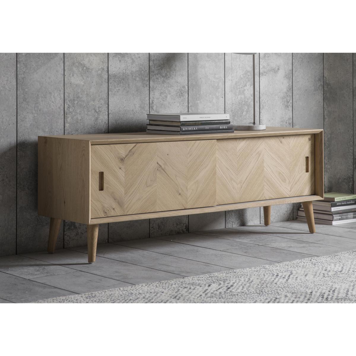 The Walker range of dining and living room furniture is all about the wood. Crafted from European oak and with rustic oak veneers, Walker celebrates the beauty of real wood, highlighting its natural texture, knots and grain with a variety of specialist techniques. Pieces feature a brushed out grain, where the softer wood grain is brushed away leaving harder wood grain more prominent for a lovely textured appearance. Table tops and cupboard doors showcase the range’s signature inlaid wood grain chevron patterning. And all pieces are finished with a natural-looking matte lacquer. Inspired by mid-century style with clean lines, simple forms and rounded splayed legs, Walker’s dining tables, storage pieces and occasional tables are sure to find a place in any stylish contemporary home. Beautifully finished, the Walker media unit combines functional storage with stunning style. Crafted fom European oak and with rustic oak veneers arranged in an inlaid chevron pattern, this piece celebrates the beauty of real wood. The wood has a brushed out grain, a technique which enhances the contrast between harder and softer wood grain to create a lovely textured effect. Set on rounded splayed legs and finished with a specialist matte lacquer that protects the wood while enhancing its natural characteristics, this useful piece provides roomy storage for media components. Two sliding doors have recessed handles and behind each is a spacious compartment with shelf. Cables holes help keep leads tidy. The Walker media unit is one of several storage pieces in the Walker range of living and dining furniture, which also includes dining tables, dining chairs and occasional tables. A beautifully-crafted mid-century-inspired piece for any home.