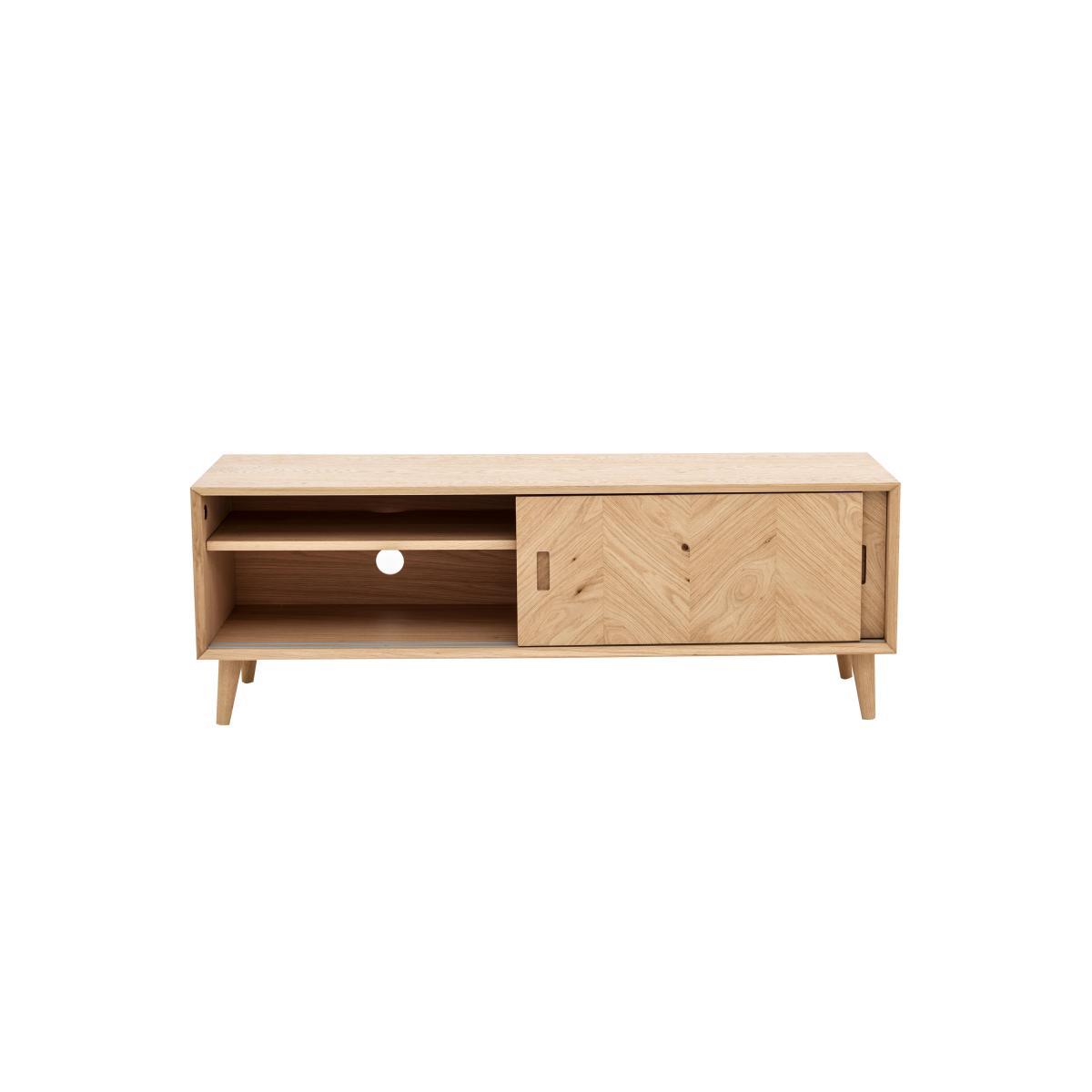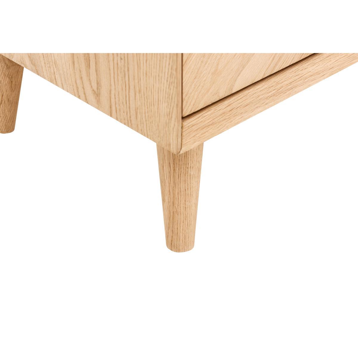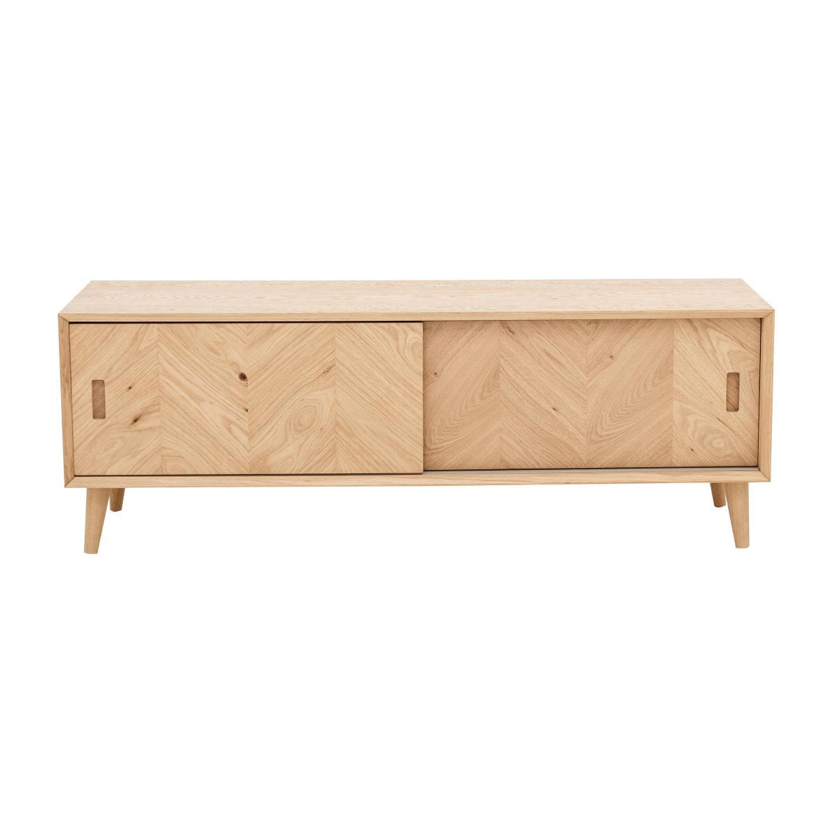 The Walker range of dining and living room furniture is all about the wood. Crafted from European oak and with rustic oak veneers, Walker celebrates the beauty of real wood, highlighting its natural texture, knots and grain with a variety of specialist techniques. Pieces feature a brushed out grain, where the softer wood grain is brushed away leaving harder wood grain more prominent for a lovely textured appearance. Table tops and cupboard doors showcase the range’s signature inlaid wood grain chevron patterning. And all pieces are finished with a natural-looking matte lacquer. Inspired by mid-century style with clean lines, simple forms and rounded splayed legs, Walker’s dining tables, storage pieces and occasional tables are sure to find a place in any stylish contemporary home. Beautifully finished, the Walker media unit combines functional storage with stunning style. Crafted fom European oak and with rustic oak veneers arranged in an inlaid chevron pattern, this piece celebrates the beauty of real wood. The wood has a brushed out grain, a technique which enhances the contrast between harder and softer wood grain to create a lovely textured effect. Set on rounded splayed legs and finished with a specialist matte lacquer that protects the wood while enhancing its natural characteristics, this useful piece provides roomy storage for media components. Two sliding doors have recessed handles and behind each is a spacious compartment with shelf. Cables holes help keep leads tidy. The Walker media unit is one of several storage pieces in the Walker range of living and dining furniture, which also includes dining tables, dining chairs and occasional tables. A beautifully-crafted mid-century-inspired piece for any home.