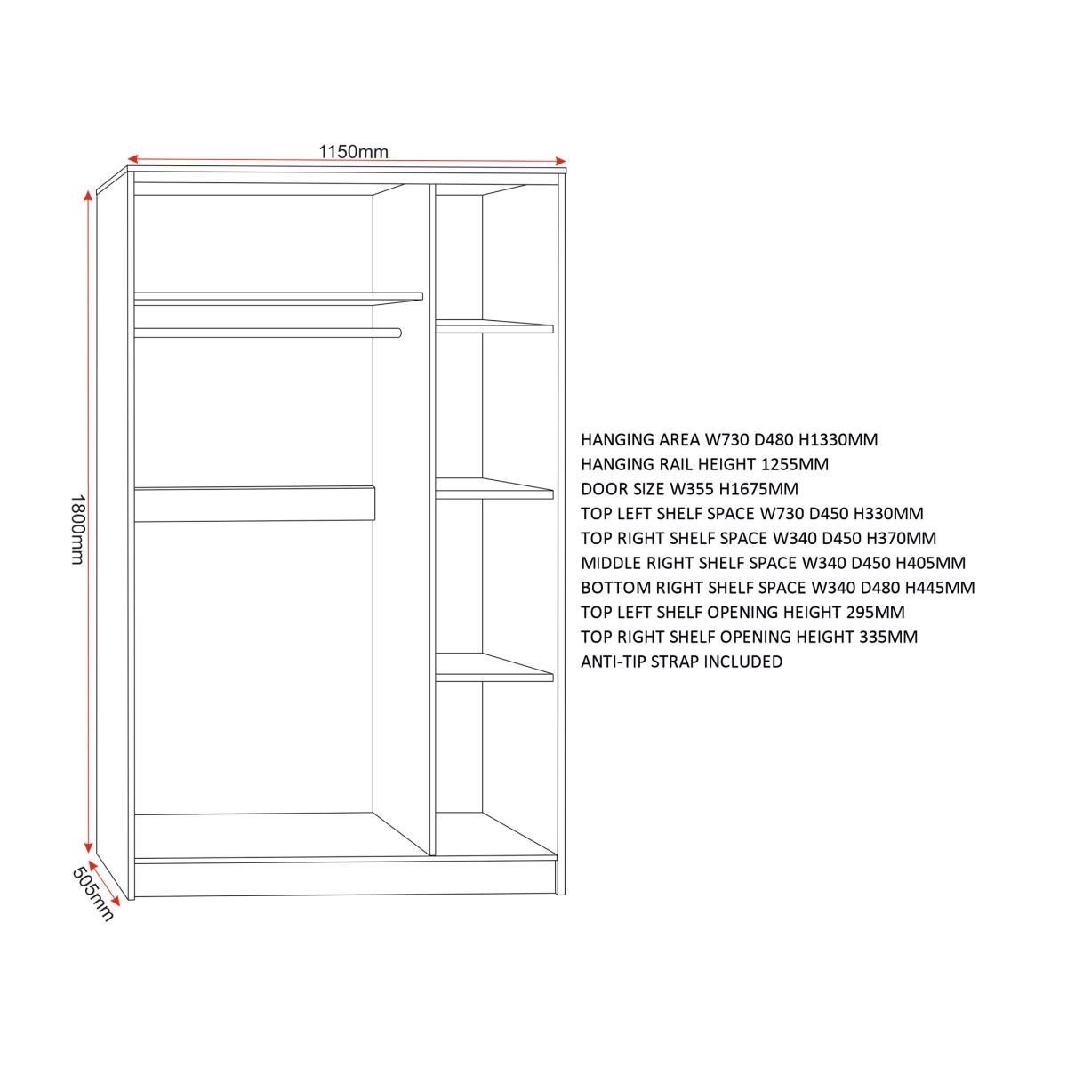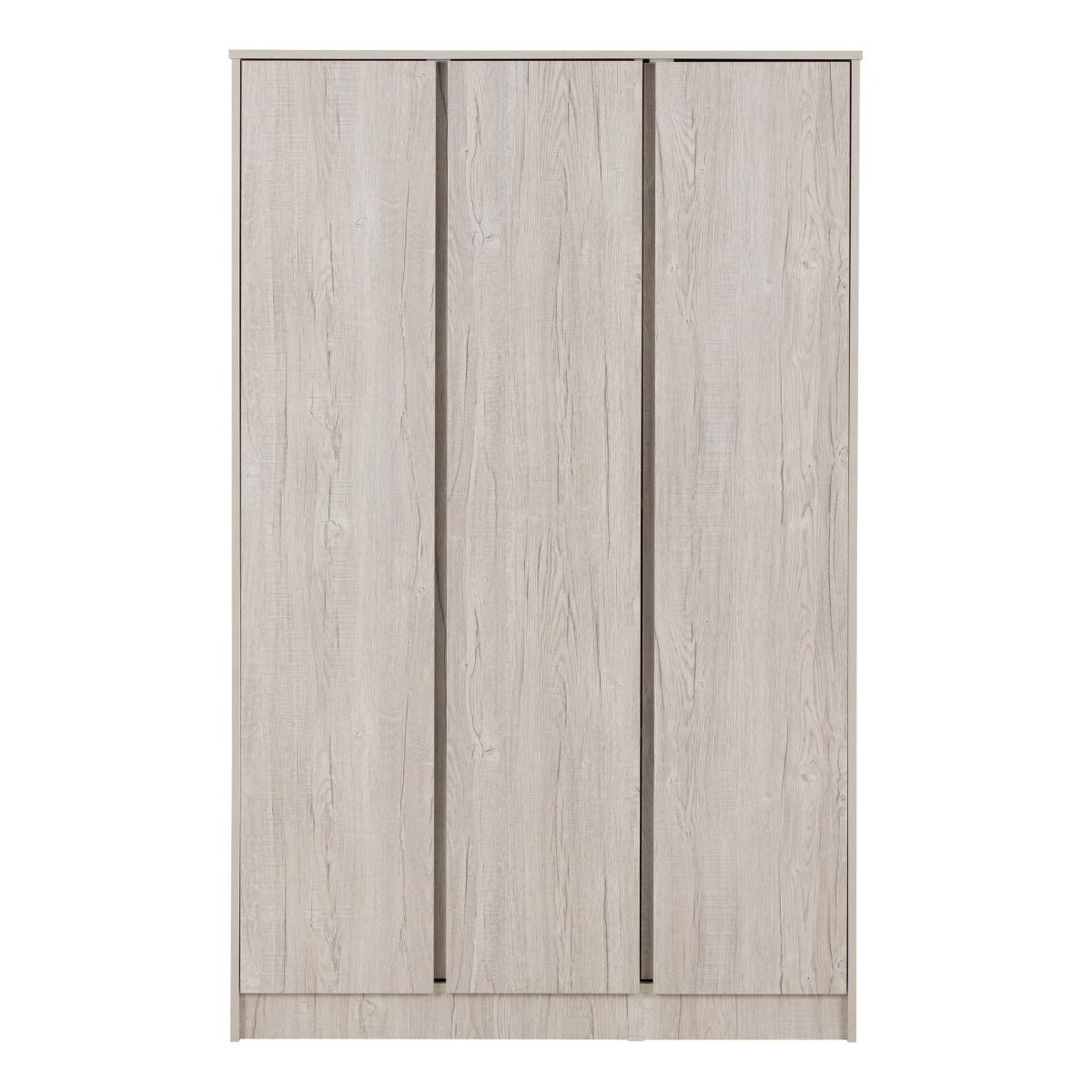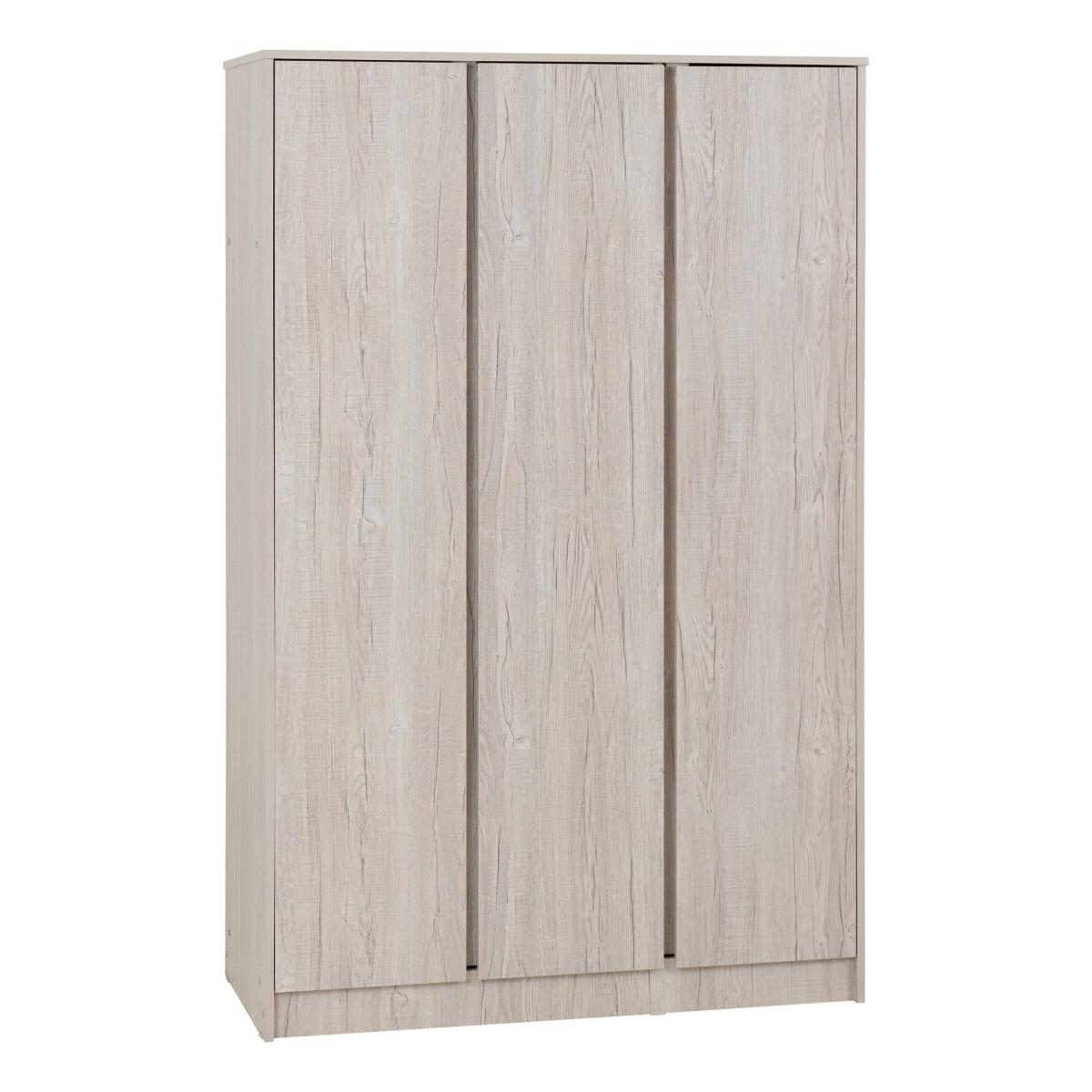* Shelving and hanging space* Available in multiple wooden finishes* Quick assembly With its spacious triple-door design, this wardrobe provides extensive storage options. Inside, you'll find a well-organized layout featuring hanging rails for garments that need to be hung up neatly, as well as shelves for folded clothes, shoes, or other accessories. This thoughtful arrangement ensures easy access and efficient organisation of your wardrobe essentials. Crafted with attention to detail and durability, this wardrobe boasts a robust construction that promises longevity.