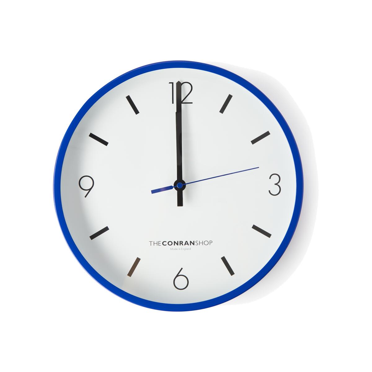 The classic Wall Clock receives a new look featuring our signature Conran Blue hue, designed by The Conran Shop. Crafted in the UK, the coated aluminium clocks feature quartz movement, sealed with a mineral glass flat front lens. The stylish clock makes a bold statement in a home office, living room or kitchen. Available with a Conran Blue or black body and accent blue second hand, this clock is exclusively available at The Conran Shop. Requires: 1x AA battery (included).