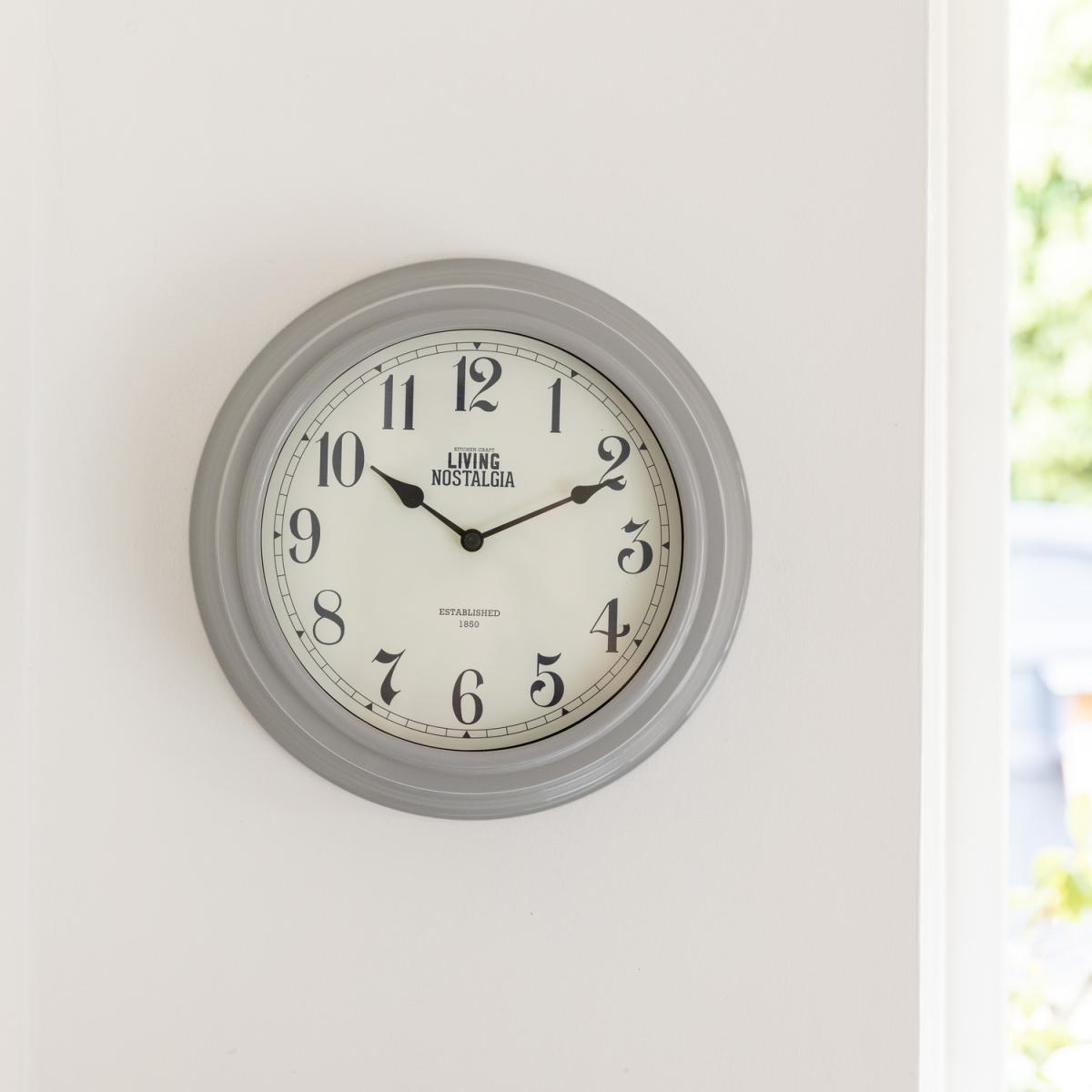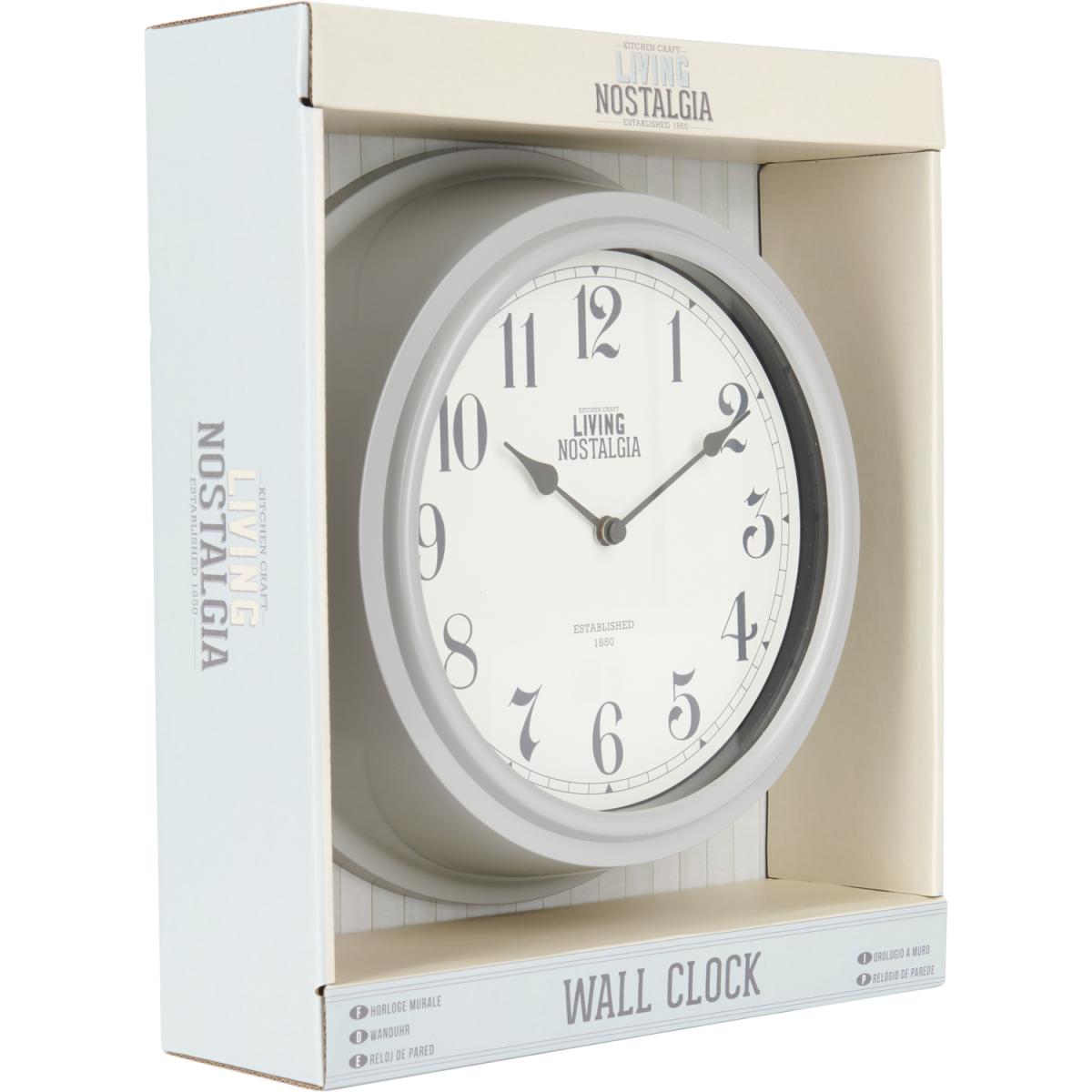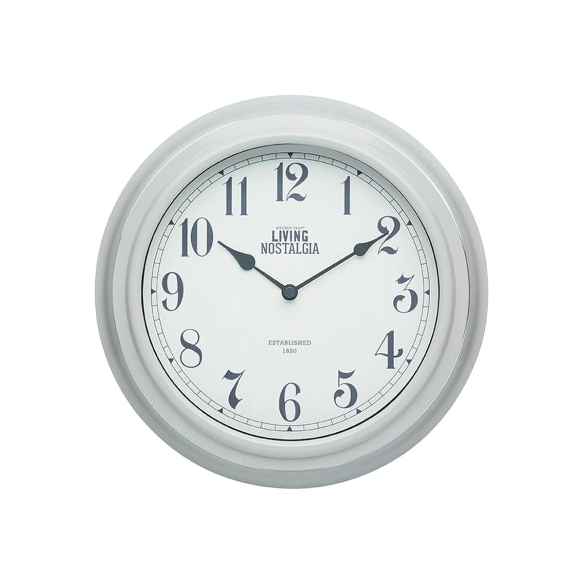 Add a touch of vintage charm to your interiors with this characterful wall clock from KitchenCraft Living Nostalgia. Its farmhouse look and neutral French Grey colour palette give it an understated beauty that works wonderfully with traditional and modern homes. Like all of Living Nostalgias creations, this clock is inspired by the functional forms and vintage character of times gone by. Its designed to be eminently practical, with a robust and long-lasting battery-powered mechanism. With its simple hanging hook, its easy to install the clock wherever you fancy. Fit it on your kitchen wall and time your bakes. Hang it on the bedroom wall and keep an eye on your lie-ins. Or install it in your living room as an eye-catching and useful wall decoration. The clock is also available in Living Nostalgias Vintage Blue and Antique Cream hues.