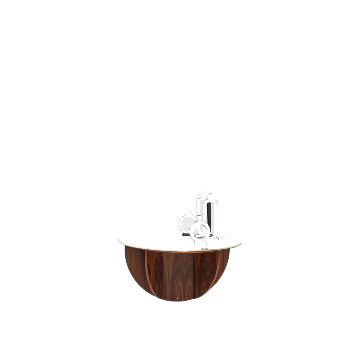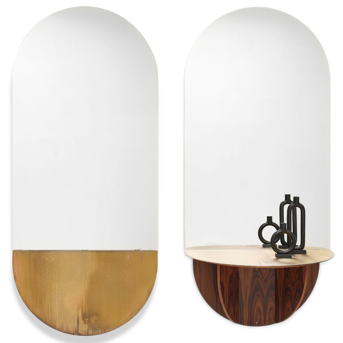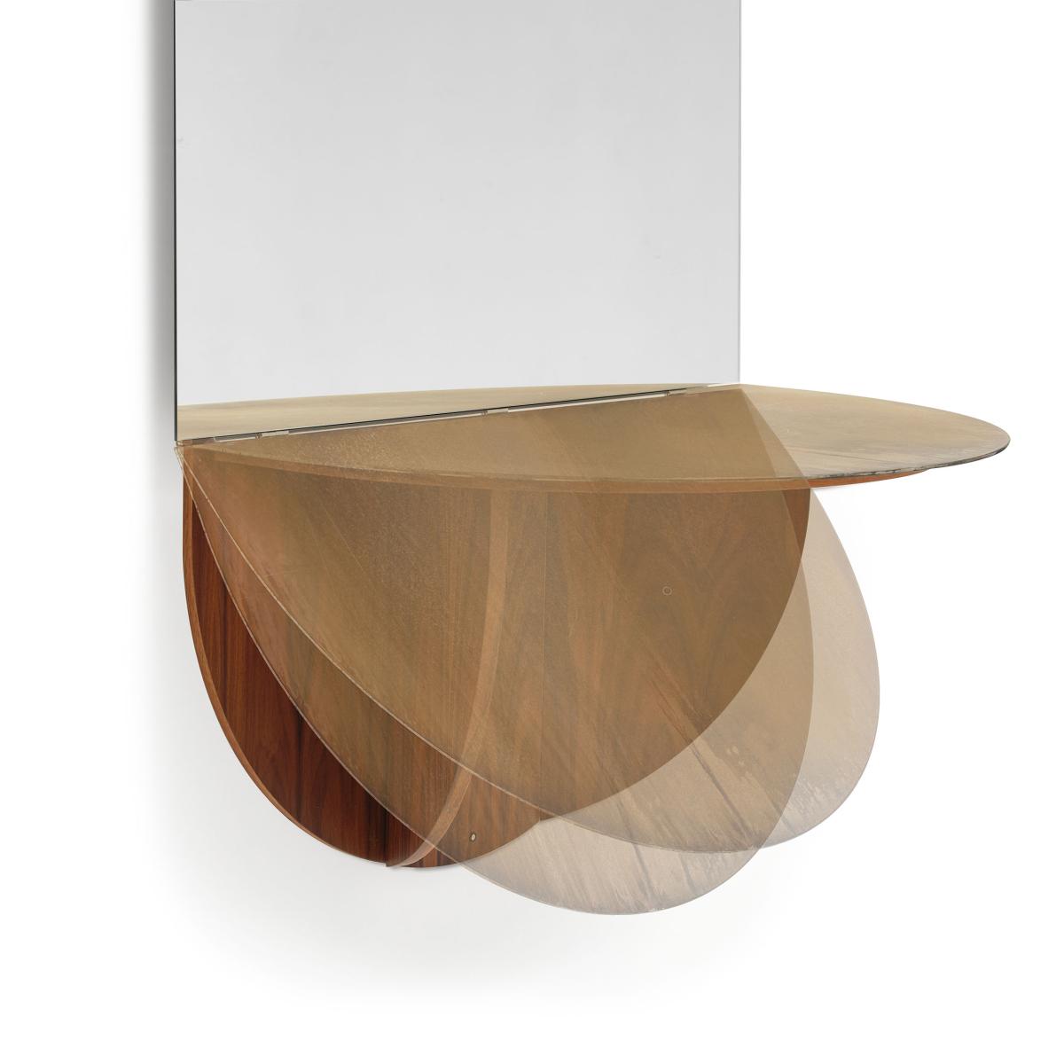 Brame elegantly combines a wall mirror and folding tray. This large mirror that turns into a console is a functional element in an entrance, bedroom or living room. This 2-in-1 object appeals as much by its functionality as by its style. The minimalist design, luxurious materials and perfect finishes make it an exceptional piece. The folding structure in rosewood-veneered MDF is surmounted by a top available in two finishes: smooth oxidised gold glass or silver fluted glass. Brame gives rise to the magic of reflection... The mirror reflects the environment and objects placed on the tray, giving life to a mysterious depth.