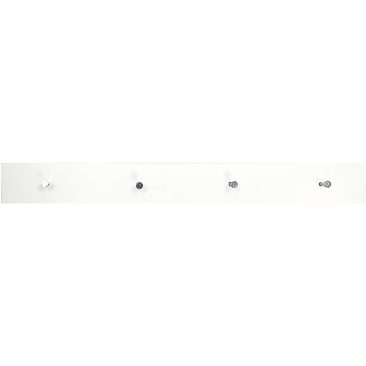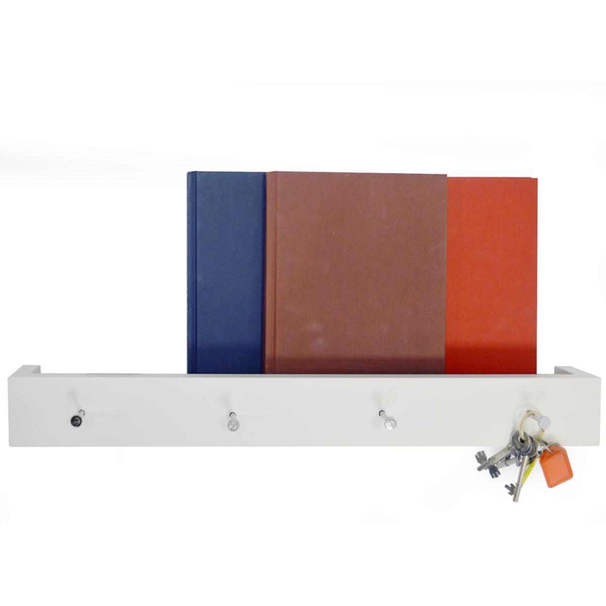 Contemporary chunky wall mounted organiser shelf with four sturdy hooks ideal for use in any room in the home. Comprises a tray style shelf area which prevents items from sliding off and four metal pegs ideal for hanging everything from towels to light coats, hats, bags and even keys. Would look great in a hallway for keys, wallets and passes fabulous in a bathroom for toiletries and towels wonderful in a kitchen for above the sink and tea towels and cute in a kids room so they can hang their own clothes. Made from MDF with a crisp white painted finish. Metal hanging pegs 3.5cm deep. Display items not included.