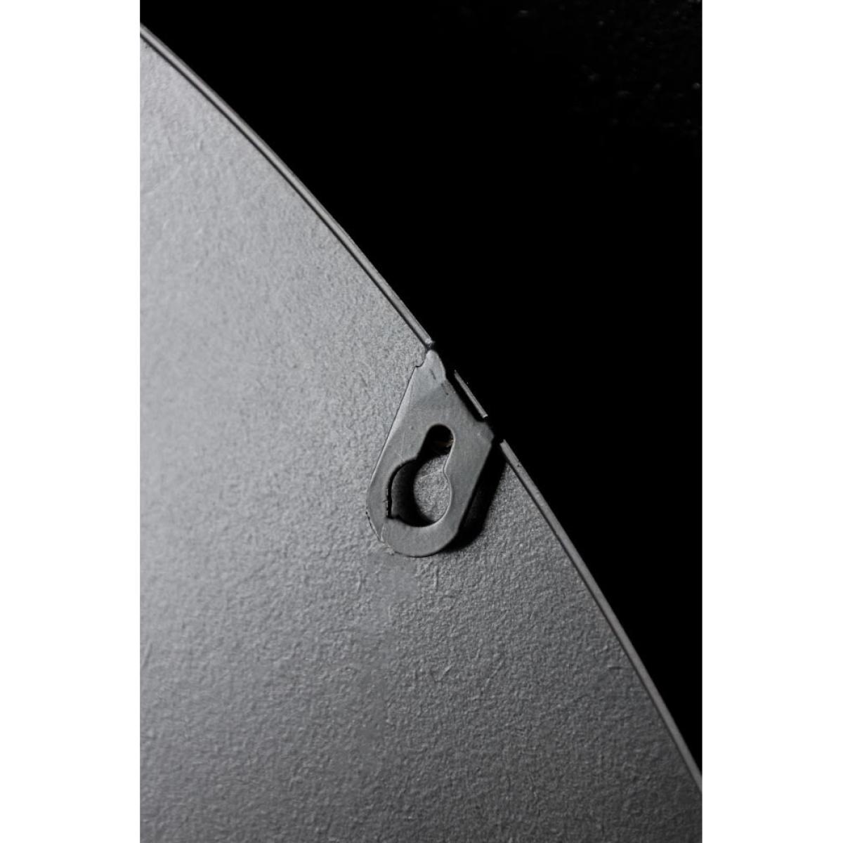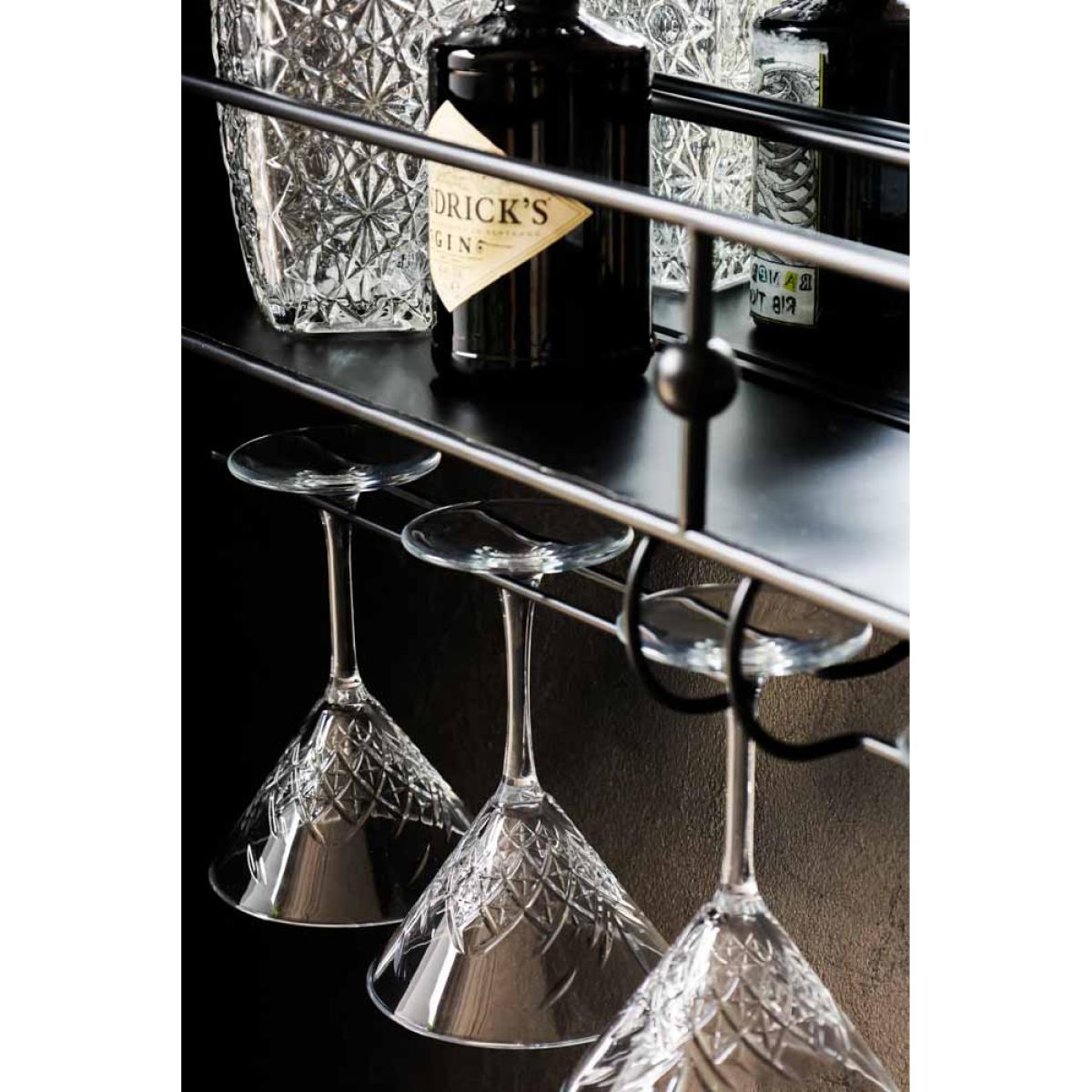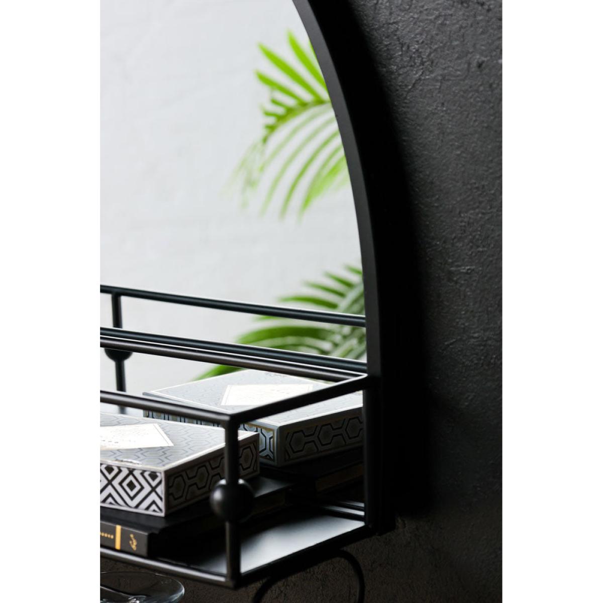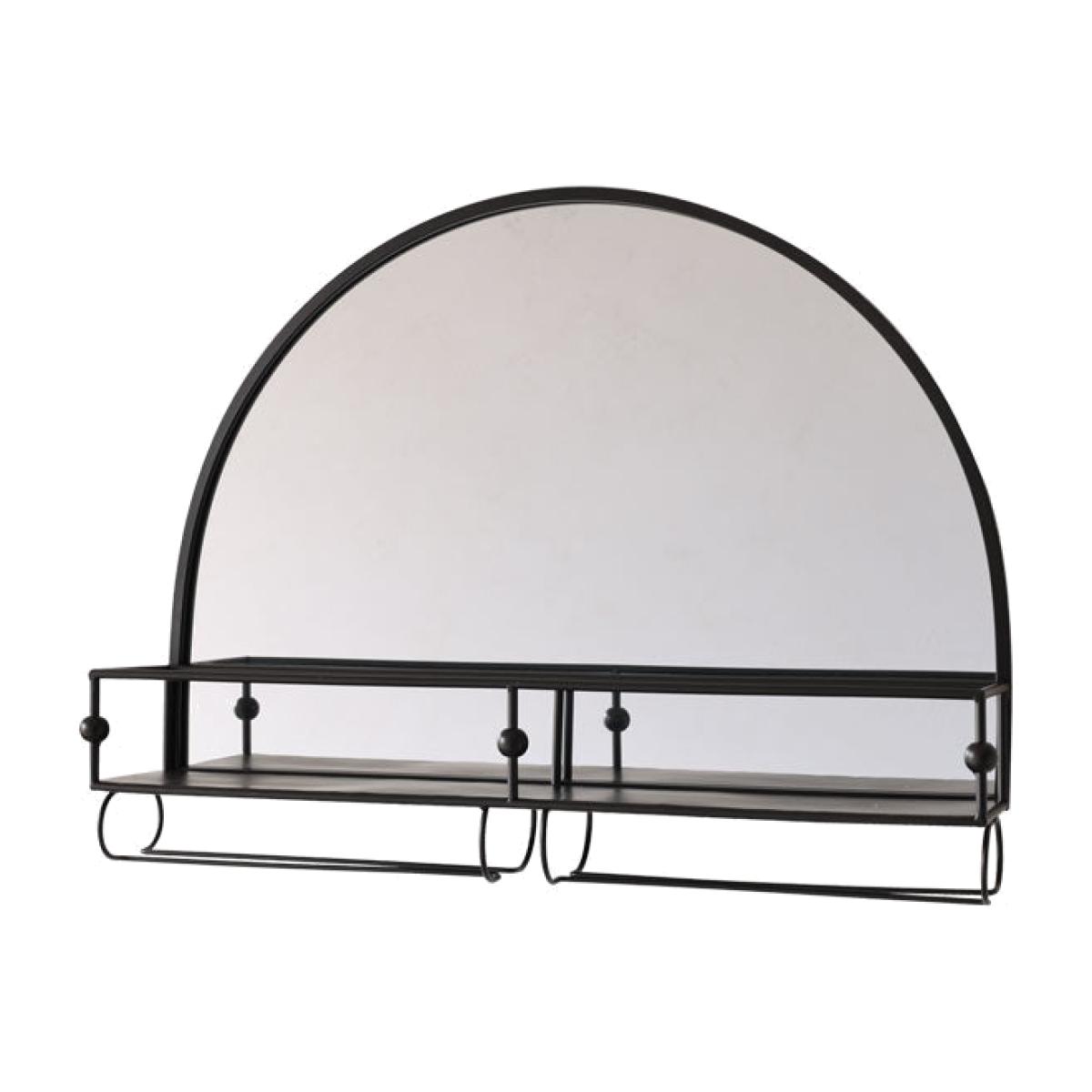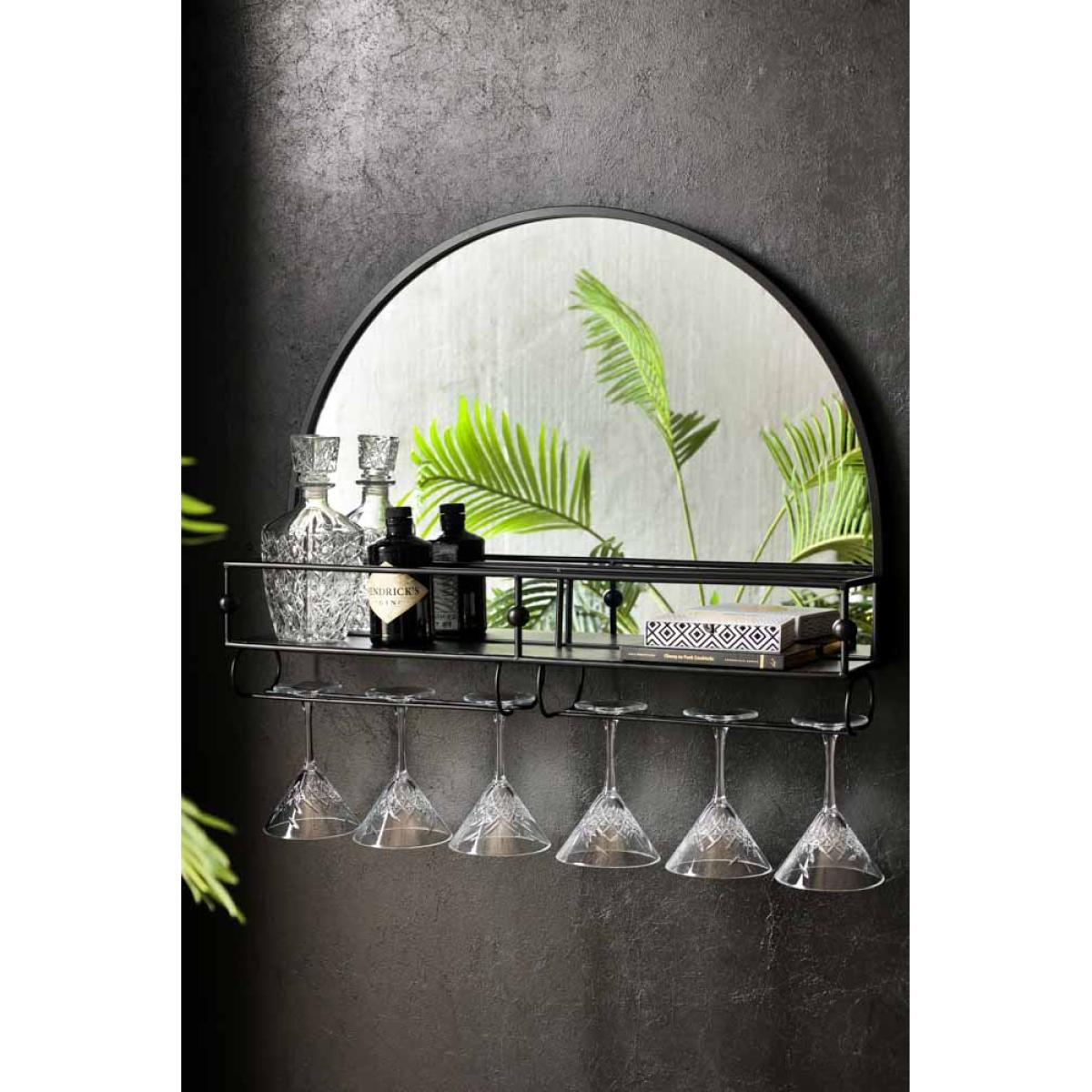 - Black semicircle wall mirror with shelf - Glass holders for six wine/cocktail glasses -Fixings on the back to hang on the wall, fittings to be sourced separately -Measures: 76.5cm x 16cm x 57.5cm- Clean with an eco-friendly glass cleaner and soft cloth