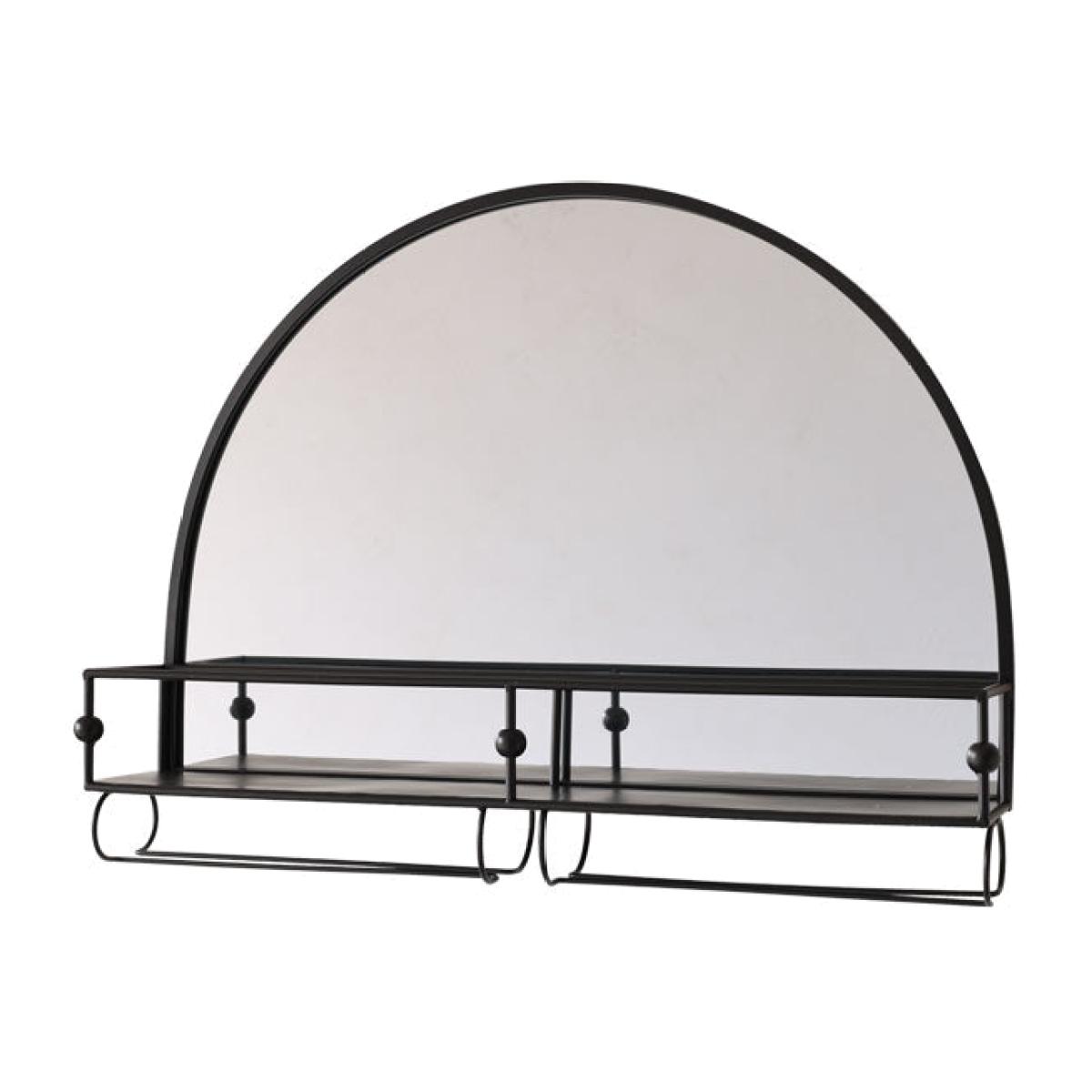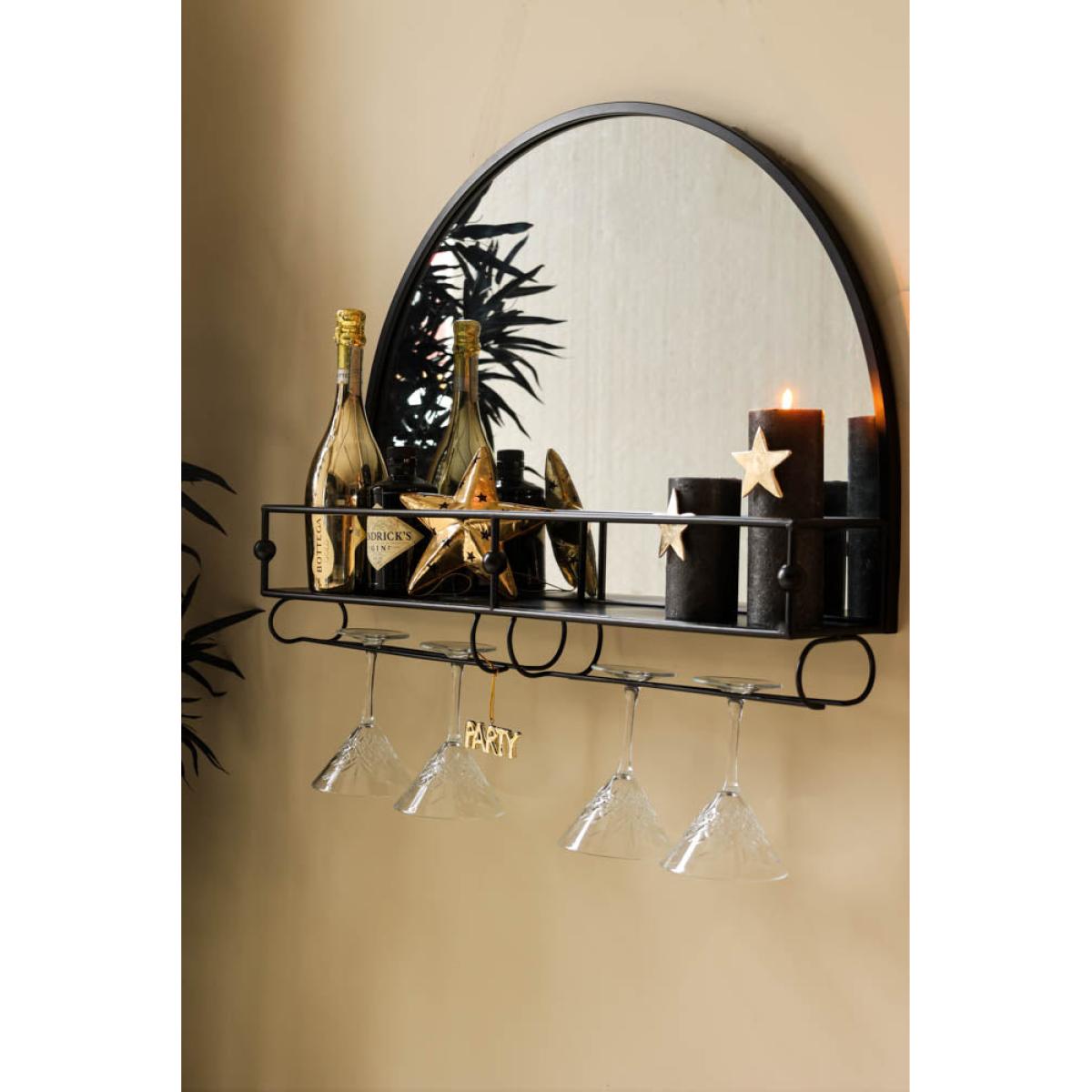 - Black semicircle wall mirror with shelf - Glass holders for six wine/cocktail glasses -Fixings on the back to hang on the wall, fittings to be sourced separately -Measures: 76.5cm x 16cm x 57.5cm - Clean with an eco-friendly glass cleaner and soft cloth