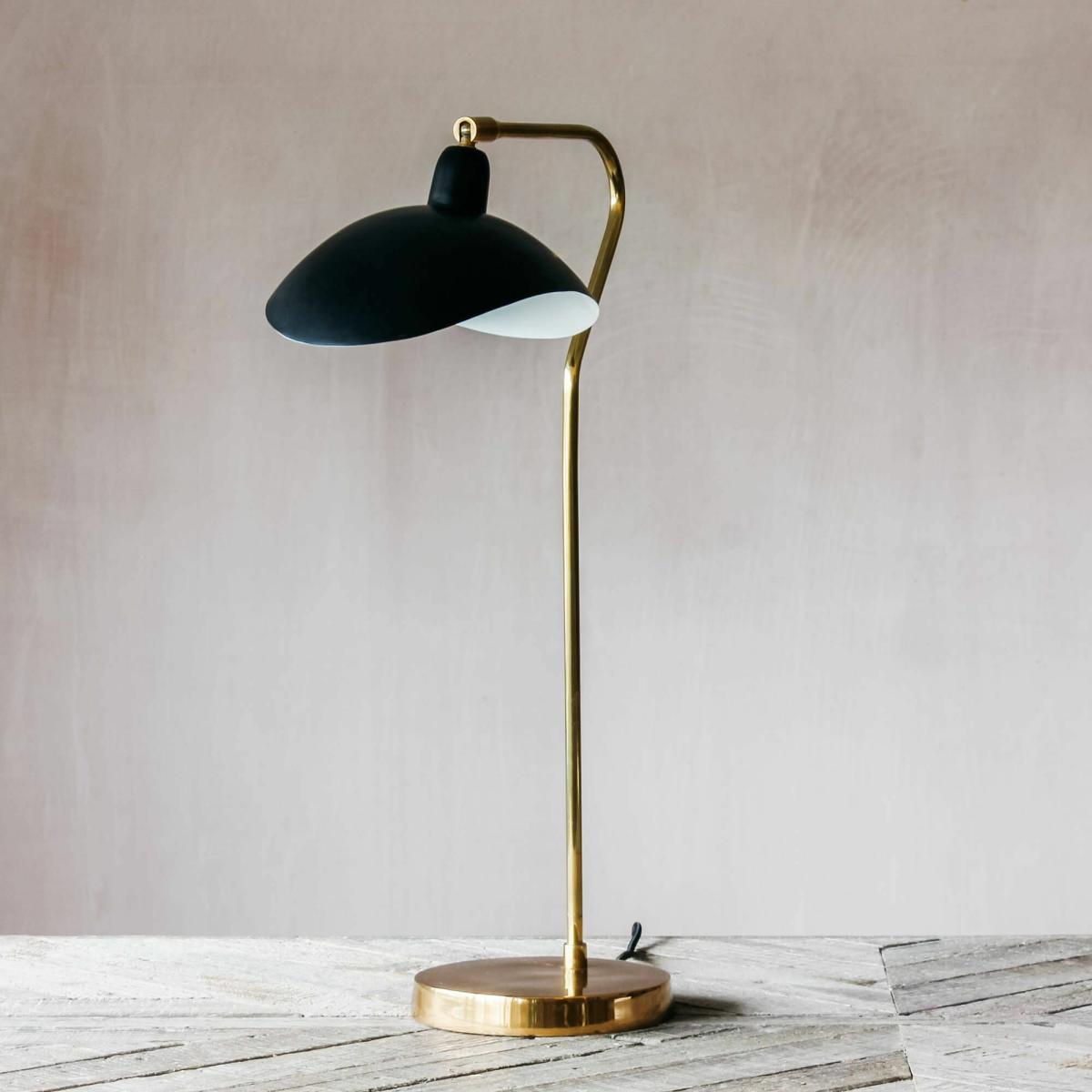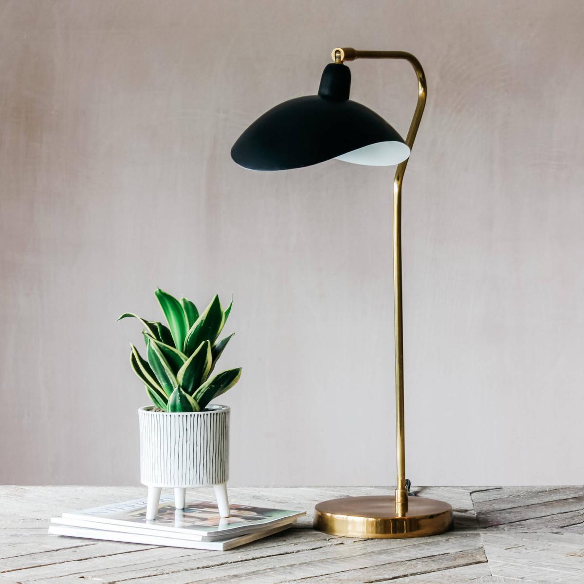 A dramatic table lamp with all the right curves, a matte black shade and a sleek curved stem. A stylish home office accessory.
