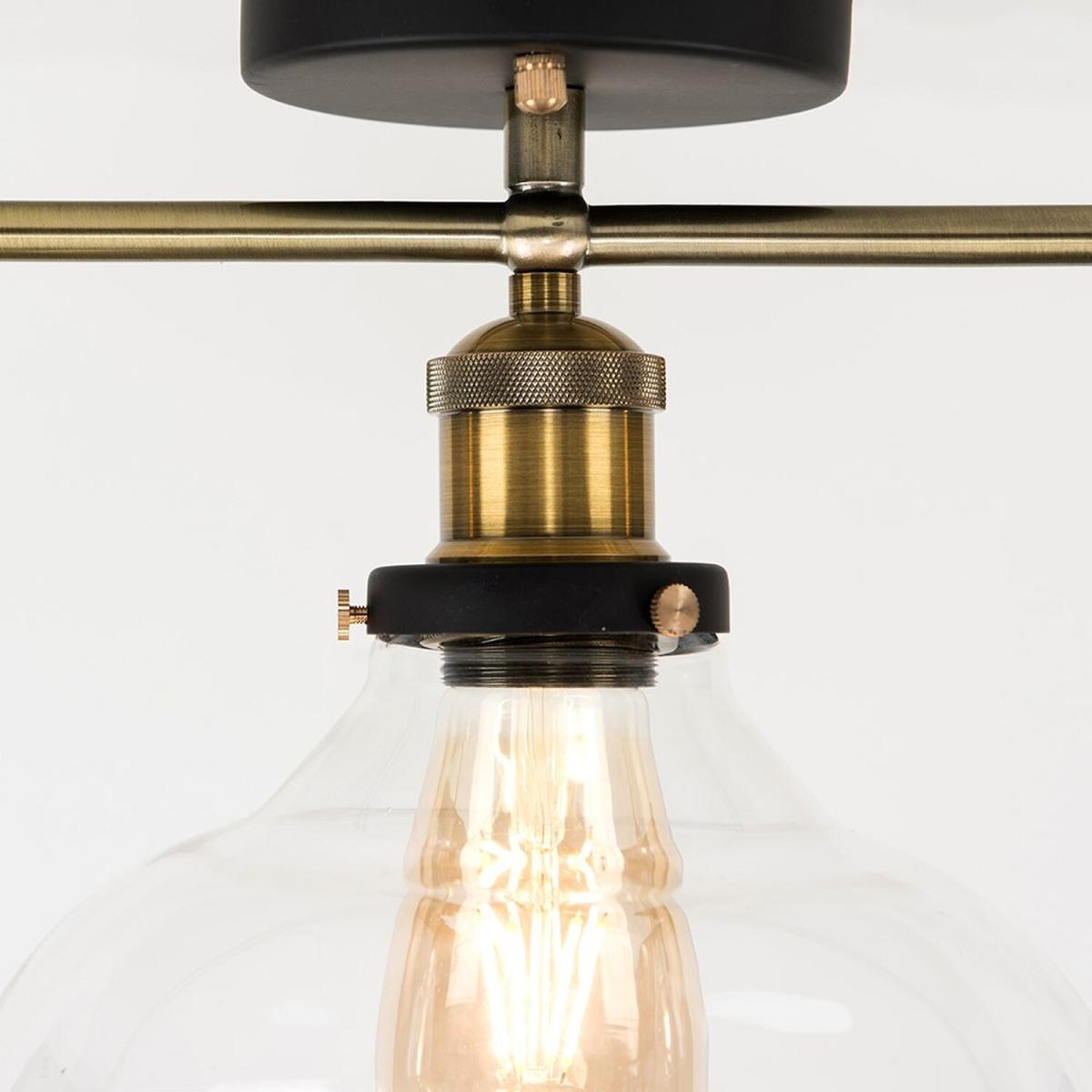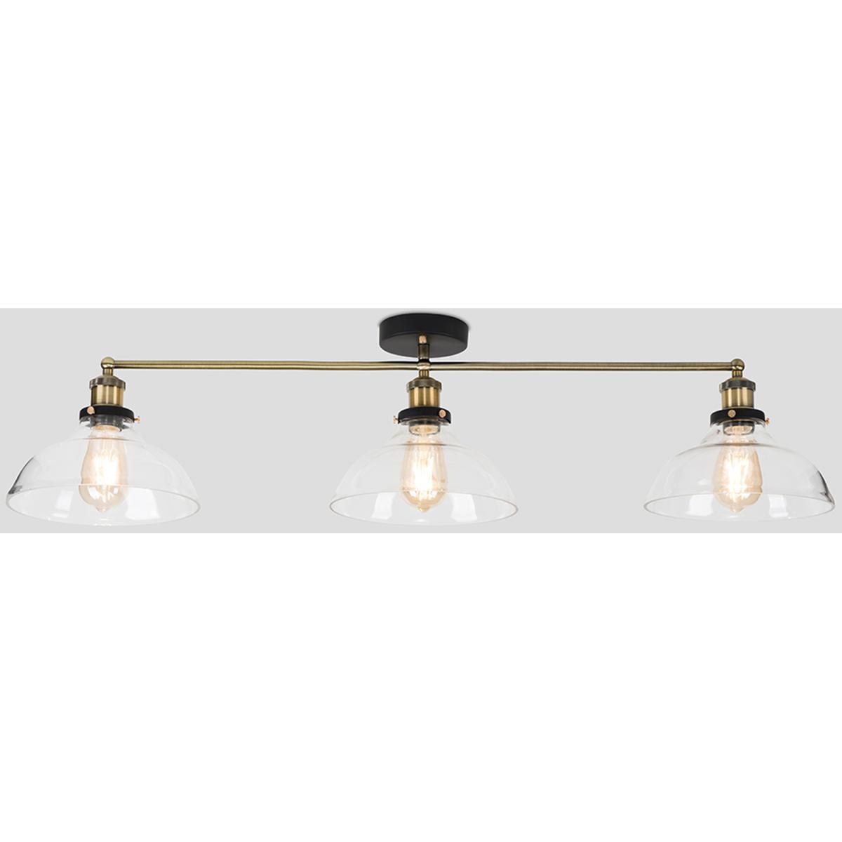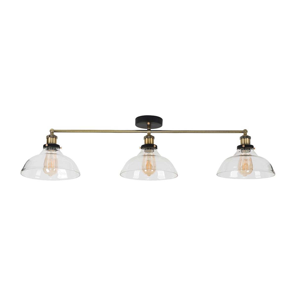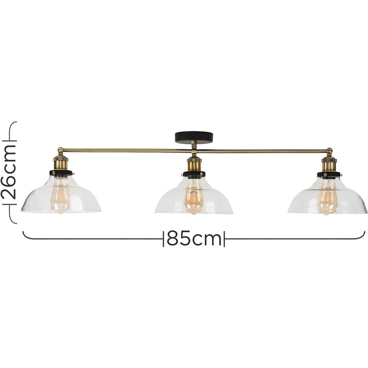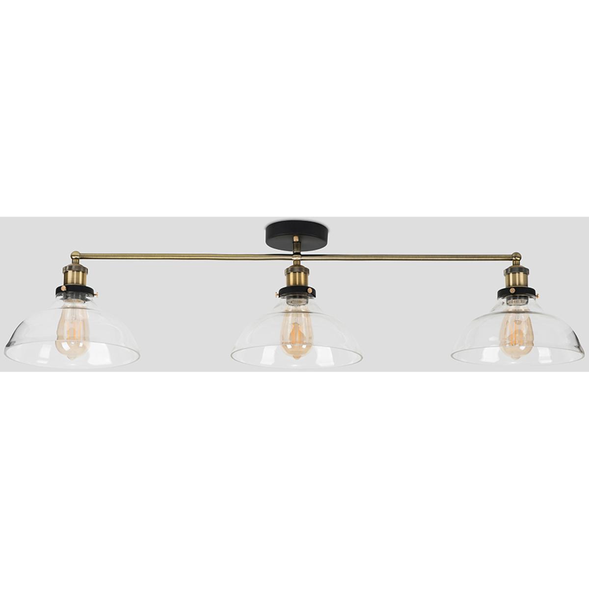 Retro steampunk style 3 way ceiling light fitting in a black and gold effect metal finish. Complete with wide clear glass shades. Ideal for living rooms, bedrooms, dining rooms and hallways. Ceiling lights are usually the main source of illuminating a room but with the many styles on offer today, also become a main focal point or talking point. The right fitting can make a real style statement and complete your living space look.