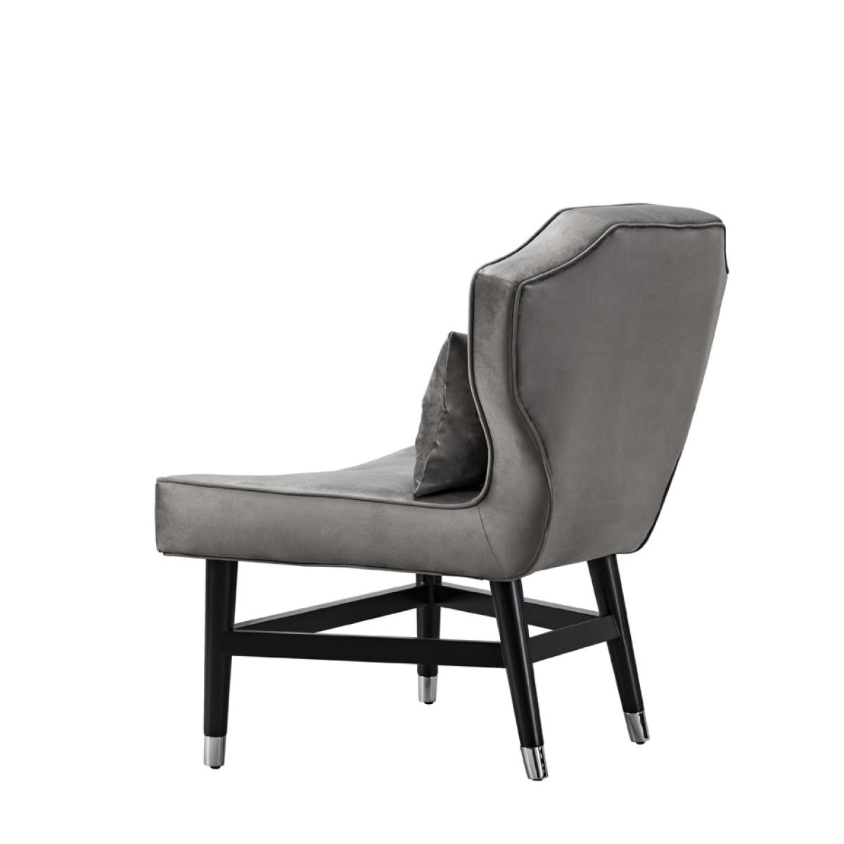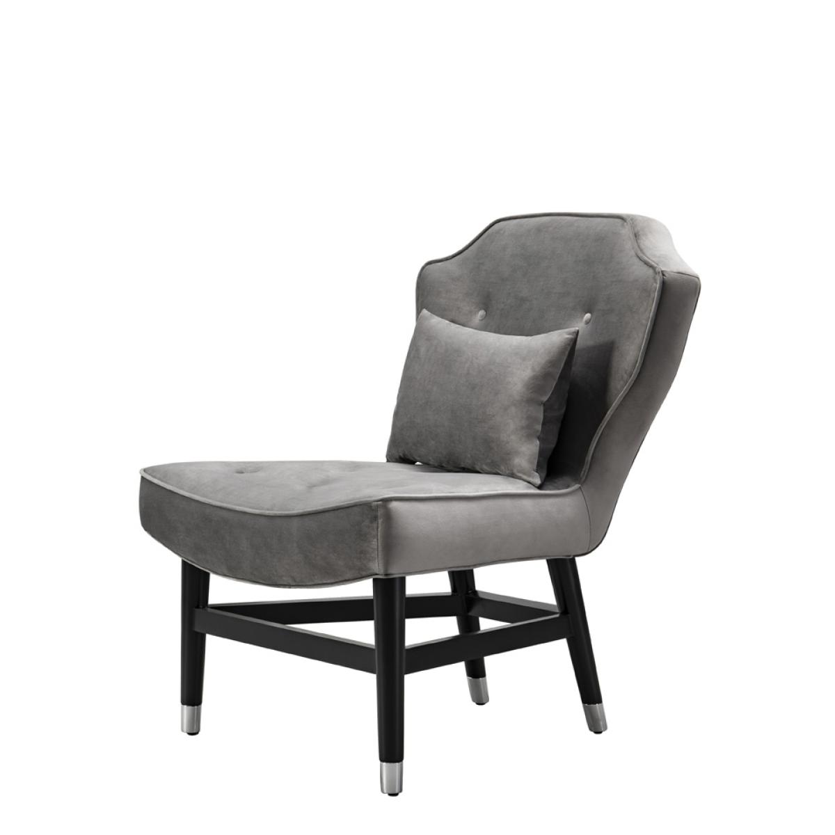 A unique and distinctive occasional chair. Buttoned seat and backrest. Solid oak frame with black polished finish and chrome plated ferrules. Comfortable sprung seat. Velvet upholstery fabric. Scatter cushion included. Minimal assembly required, simply attach legs.