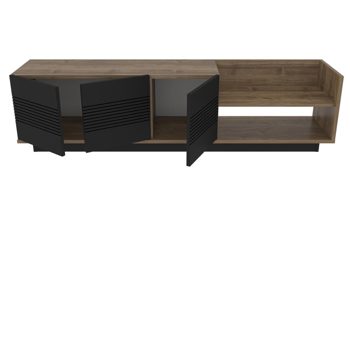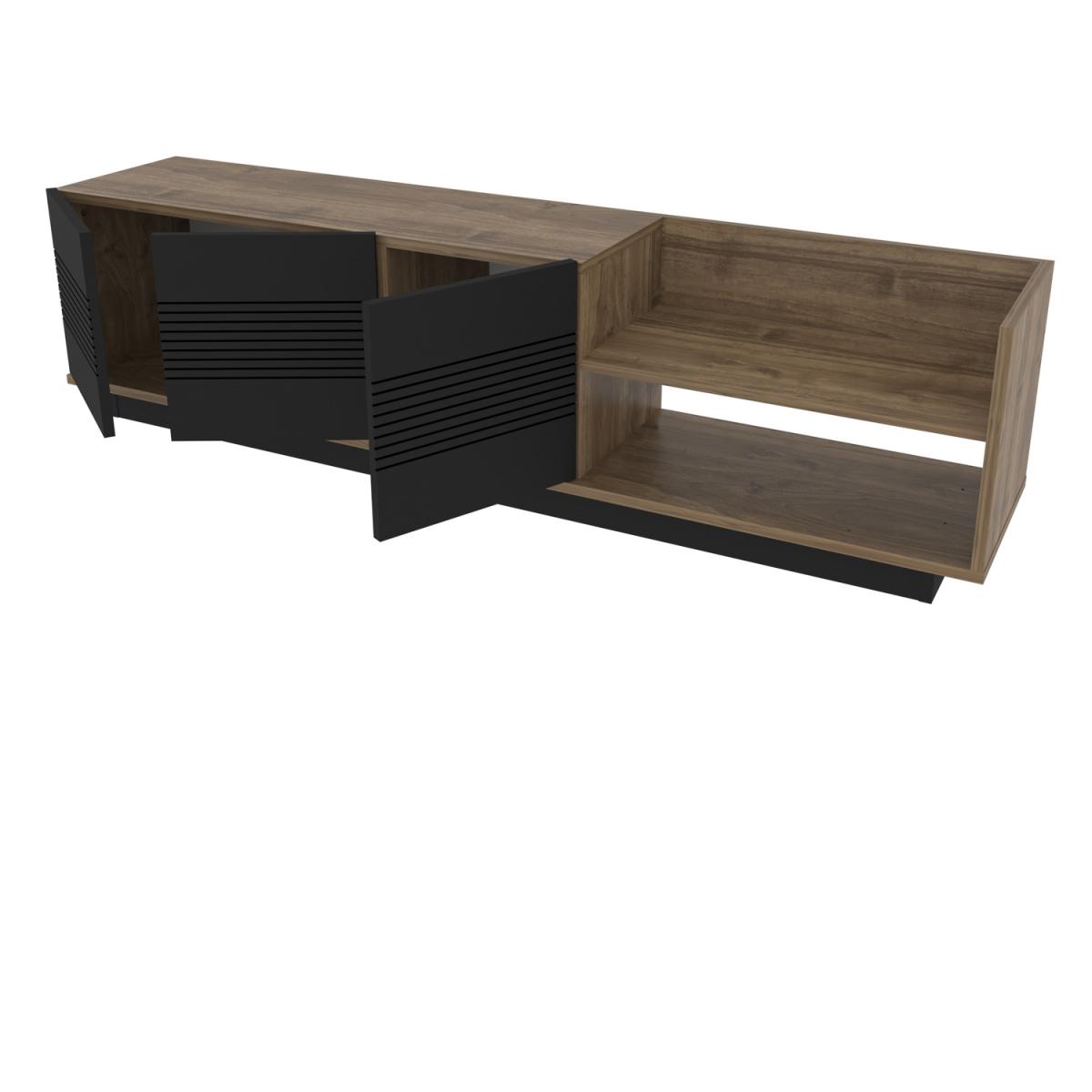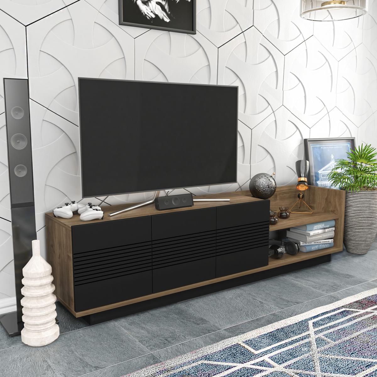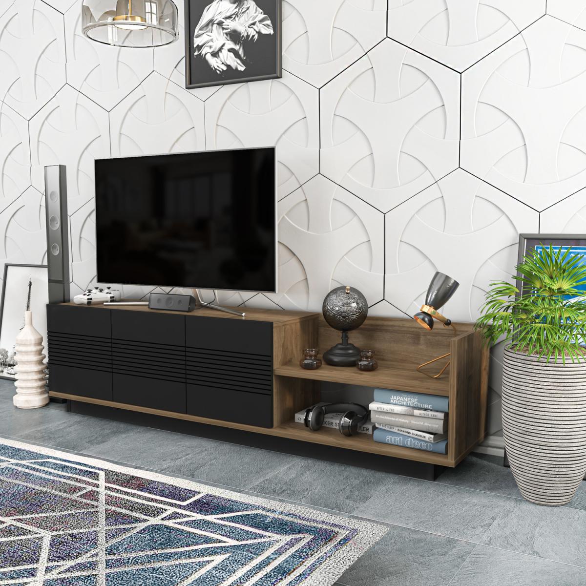 It features 2 cabinets and 2 open shelves, offering huge storage space for your entertainment sets and media collections. Slab doors have no handles. The extended upper edge of the door is used as a handle in this design. Carved straight lines on the doors make the stand more stunning. The media stand is made of an 18 mm thick melamine coated particle board and banded with PVC edge banding tape. It is manufactured using health-friendly materials. The product will be delivered to the customer in the original package as disassembled. It is designed to be assembled by the customer using a power drill and screwdriver. Assembly instruction and installation hardware are included in the package. For fast and error-free installation, product parts are numbered with stickers in accordance with the assembly guide.