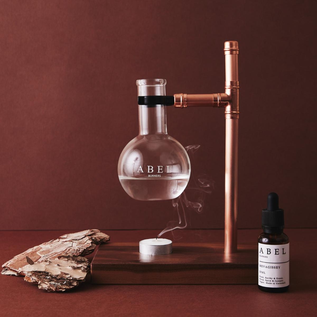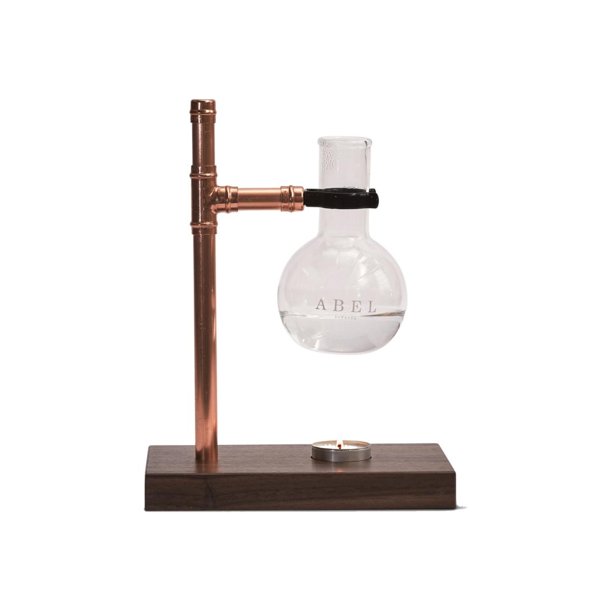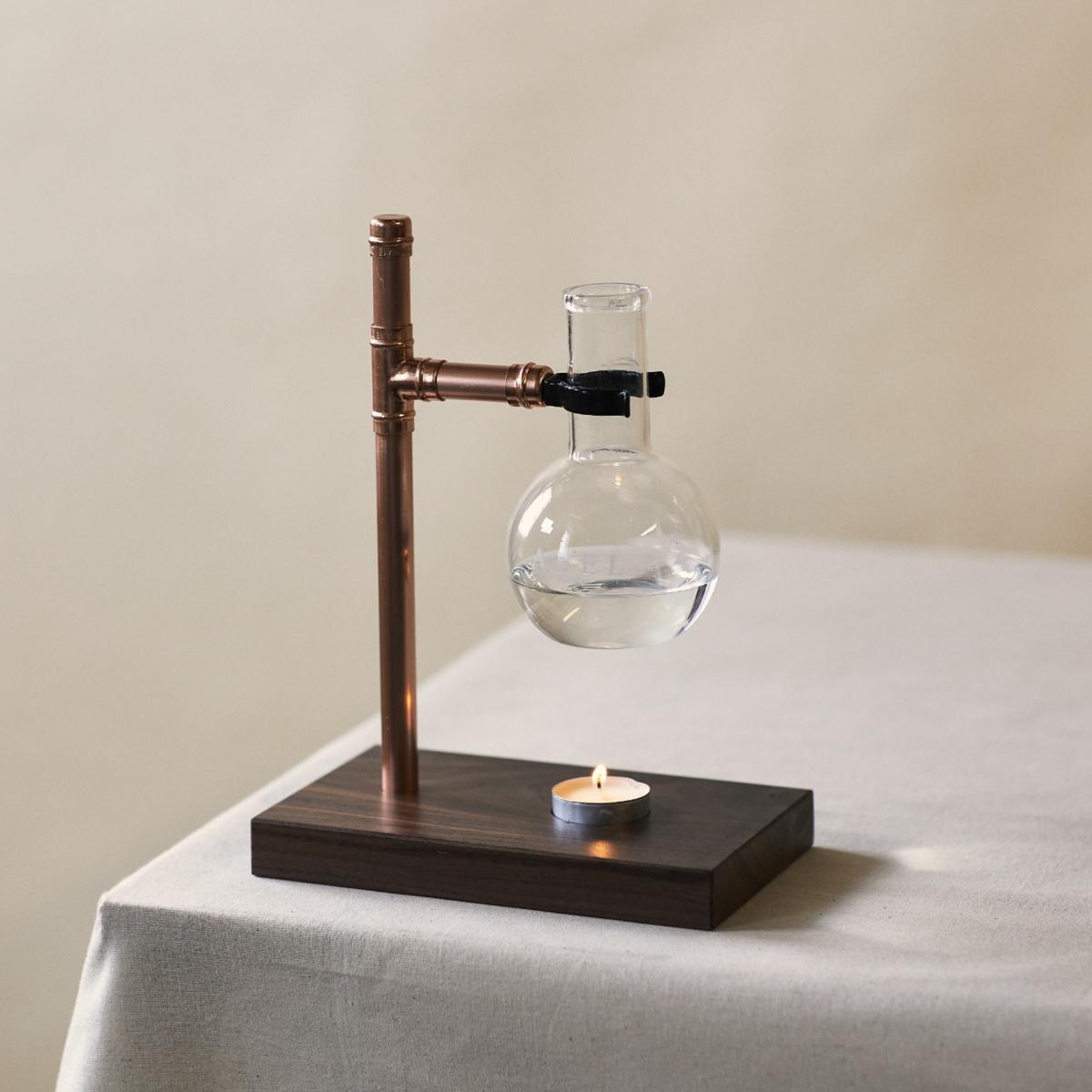The Abel Walnut & Copper Handmade Essential Oils Burner. Simple and beautiful, this burner will relax you instantly. Be mesmerised by the candle creating beautiful light patterns through the flask as it gently diffuses your favourite scent. Abel is lovingly handmade in Cornwall from repurposed Industrial materials, and natural, hand cut wood. Please expect serial numbers on your copper, knots and grain in the wood, and the unique patina that comes with a product not made in the thousands by a machine, but hand cut, prepared, painted and assembled by a tiny little business in rural Cornwall. We're not perfect, and we don't want to be! We're here for handmade. Please read the safety information supplied in your box.