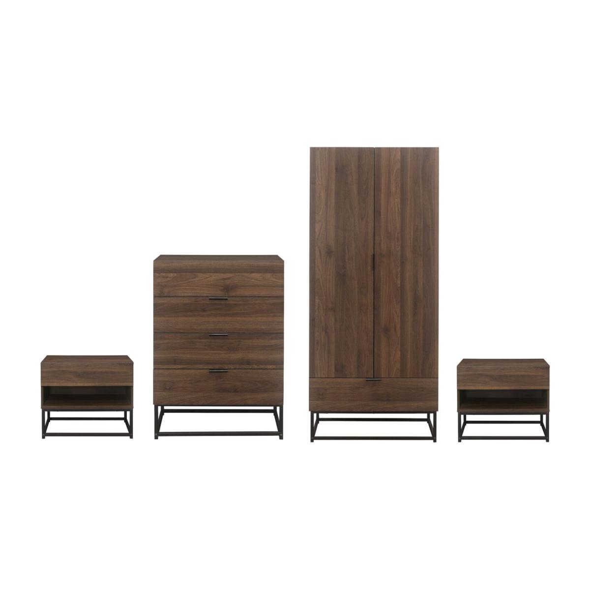 Crafted from a mix of metal and walnut effect wood, the Houston's distinctive, modern style oozes sophistication inspired by modern architecture. The Houston 4 door wardrobe offers ample space and features internal shelves along with a handy drawers for storing clothing and accessories. The Houston 4 Drawer Chest is designed with four spacious drawers and is ideal for storing away any belongings. The Houston 1 Drawer Bedside features a handy drawer and internal shelf ideal for storing away any belongings. This versatile range is crafted from particle board with walnut effect finish. Care instructions:Wipe carefully with a soft, dry cloth.