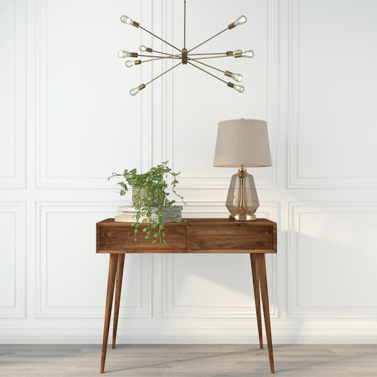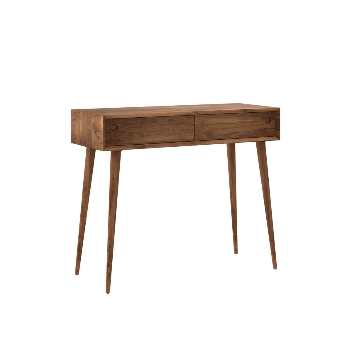 Features we love Mid-century inspired design in beautiful real walnut. Stunning mitred edge thanks to its Walnut veneer build. Cut-out circular handles enhance its minimal design. With two handy drawers to keep your essentials. Made of real walnut veneer and a solid walnut frame Need to know. Overall dimensions. W95 x H80 x D38 cm Number of drawers. 2 Number of legs. 4 Colour. Walnut Finish. Walnut with clear oil Material. Solid walnut (edges corners and legs) walnut veneer backed with MDF (top and sides) and metal (runners) Weight. 19kg Assembly required. Yes - attaching legs.