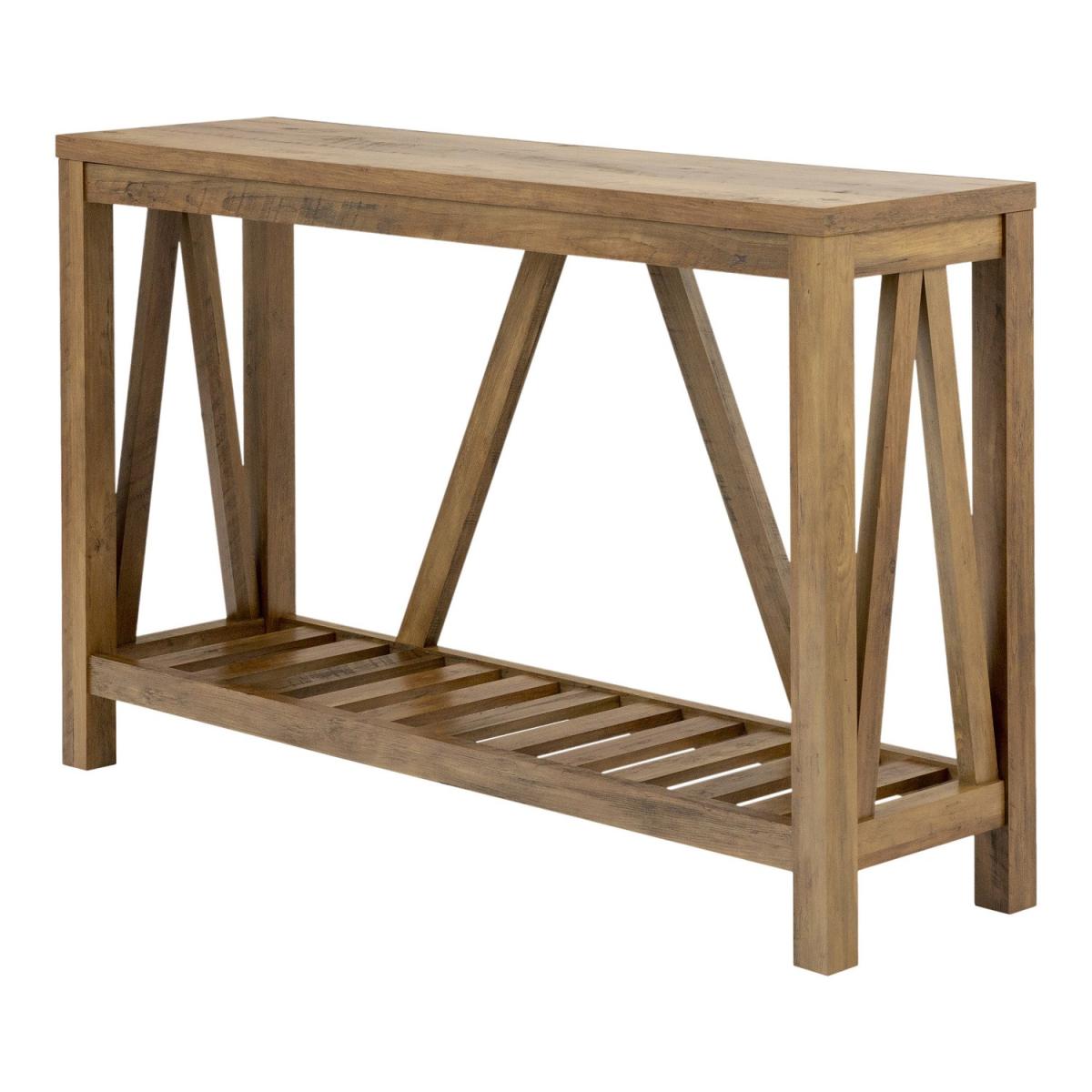 Dimensions Table W133 x H82 x D36 cm. The walnut effect finish of this stunning console brings the perfect touch of aesthetic appeal to your home while the spacious table and open slatted bottom shelf provide the perfect place to display and store your keys accessories photos and other items. Features. Modern A-frame design. Rustic country charm style Perfect for use in an entrance way hallway or living room. The top shelf is ideal for providing some much-needed surface space for keys hats scarves and other miscellaneous items. Spacious slatted bottom shelf perfect for storing shoes Greet your guests with a preview of your home's style and add a lovely lived-in quality to your home Assembly required..