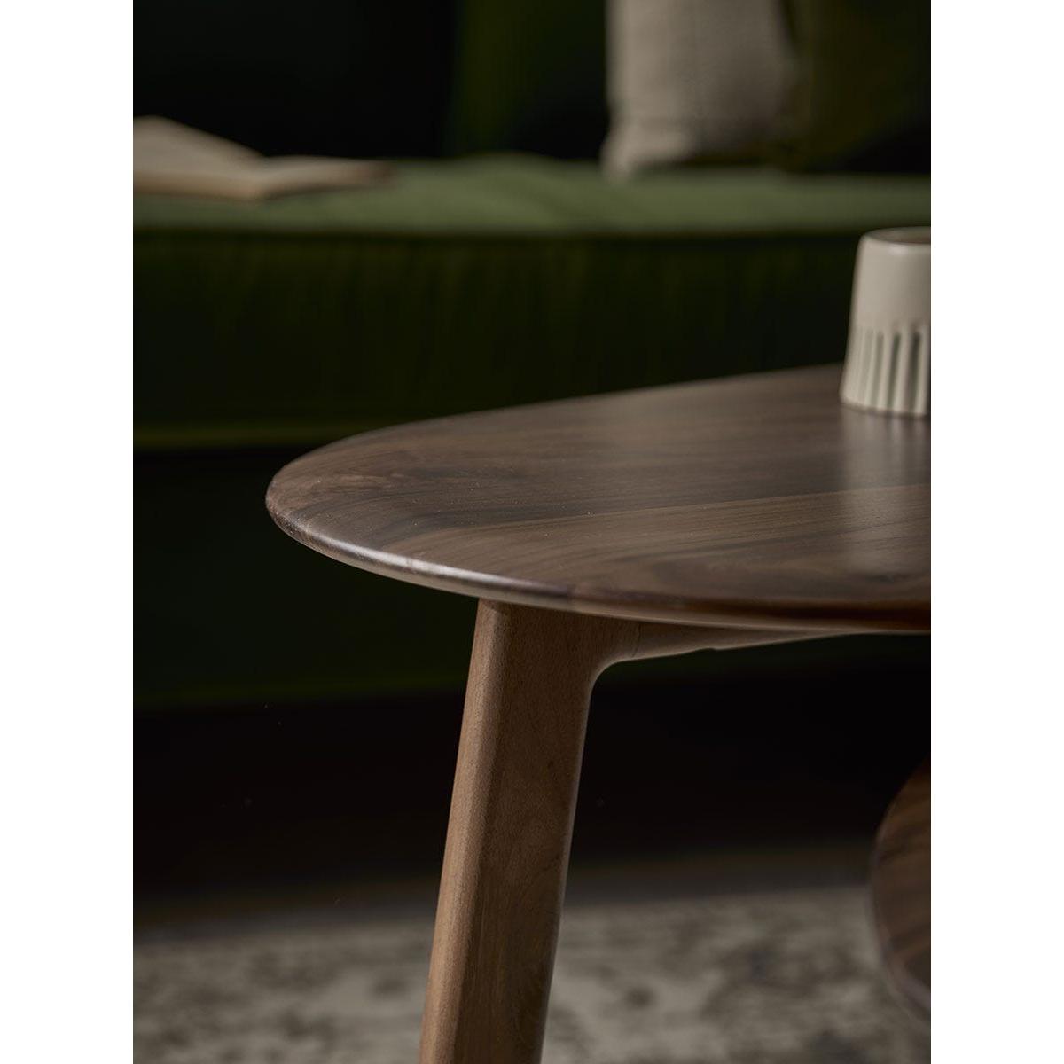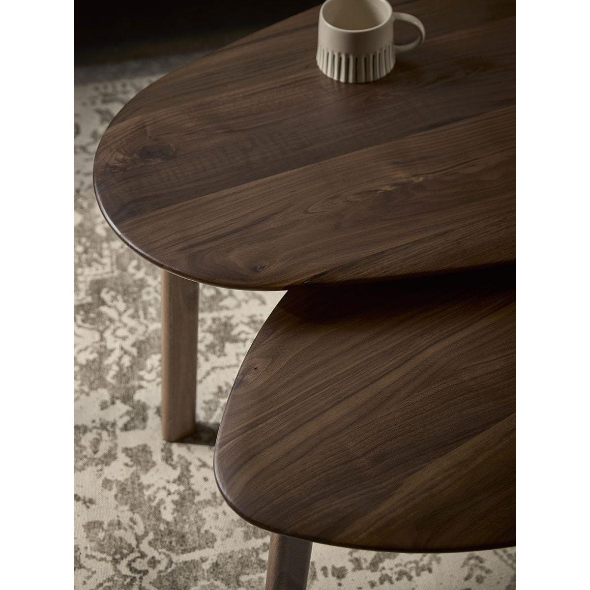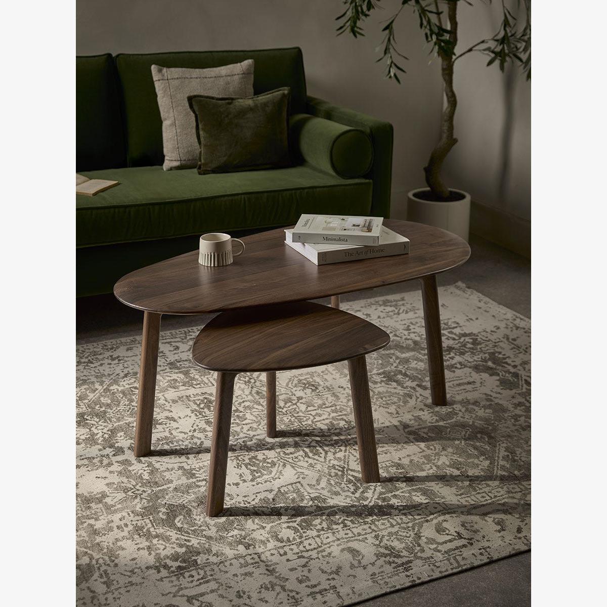 I love these walnut nesting tables for their versatility and timeless appeal. They work particularly well in modern, Scandinavian, or eclectic interiors due to their clean lines and natural wood finish. The nesting feature adds practicality, allowing you to save space or extend your surface area when needed-perfect for casual entertaining or as an adaptable side table. In styling, consider layering with textured cushions or throws on the sofa, or adding decorative objects like candles or small plants on the tables to create visual interest. They’re a great way to introduce warmth and natural material into a pared-back space while maintaining a sleek, functional aesthetic.