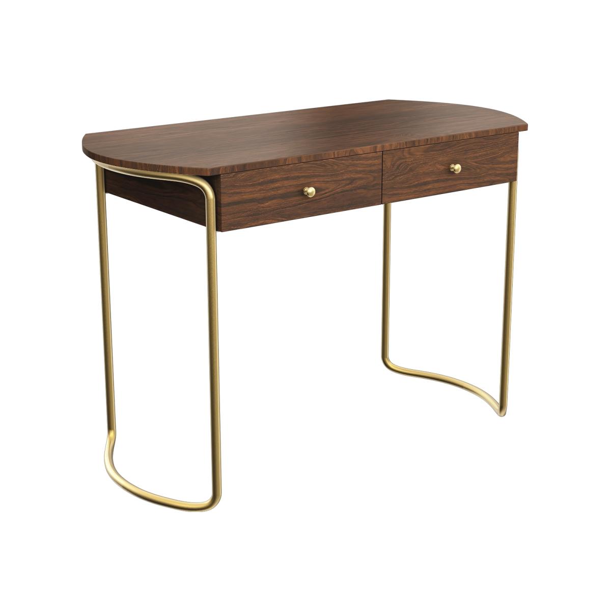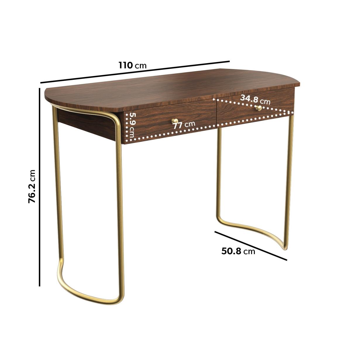 Features we love Walnut dressing table finished with gold metal accents1 drawer for storing your makeup and; other essentials. High quality construction made with solid acacia wood. Modern design with curved wooden edges and open frame. Minimal assembly required with just attach the legs. Need to know. Dimensions. H76.2 x W110 x D50.8 cm Drawer dimensions. H11.5 x W77 x D34.8 cm Number of drawers. 1 Weight. 19.74kg Colour. Dark brown and gold Finish. Lacquered top with powder-coated metal frame Material. Solid acacia wood and metal Assembly required. Yes - just the legs..