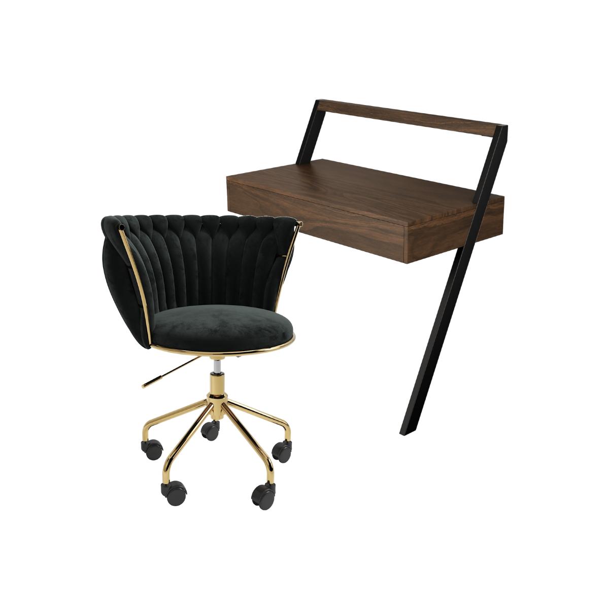 Beautifully lacquered solid acacia wood floating desk Practical and stylish set perfect for any home office Office chair provides comfort with backrest 360-degree swivel and adjustable seating height ensures practicality while you work or study Wall-mounted and super easy to assemble Need to know Office Desk Information Number of drawers: 1 Weight: 25.5kg Colour: Brown and black Finish: Lacquered, powder-coated legs/frame Material: Solid acacia wood and metal Assembly required: Yes - just attach the legs/top rail and fix it to the wall with the kit provided Office Chair Information Weight: 8.4kg Colour: Black, gold (base and frame) and black (castors) Finish: Upholstered and polished (base and frame ) Material: Velvet fabric, foam and metal For use: Indoors Assembly required: Yes
