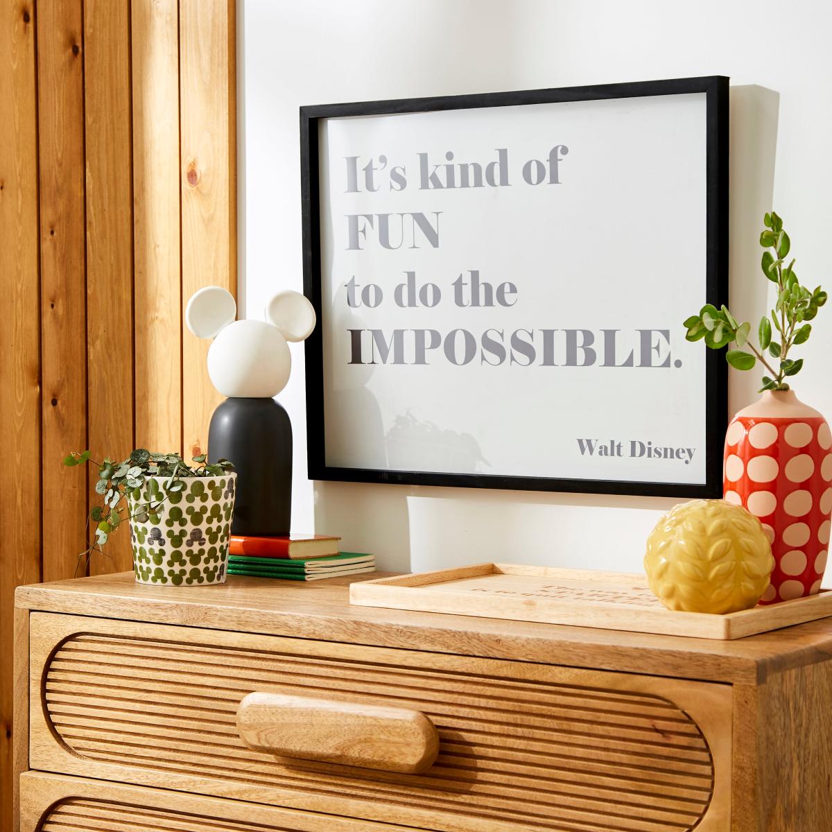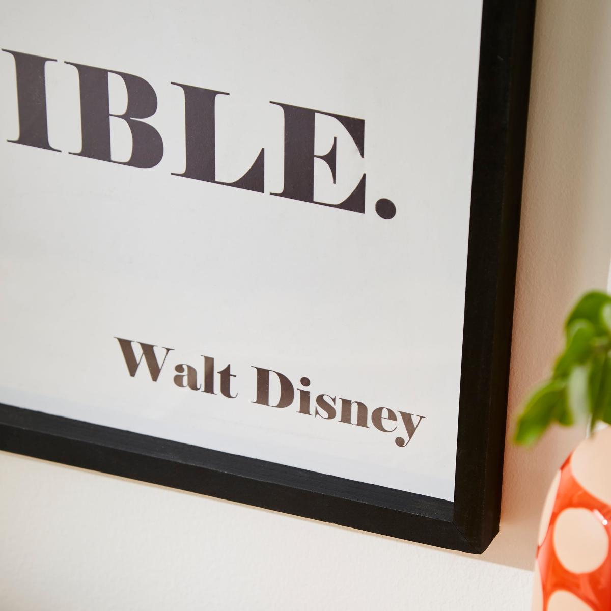 I really like this quote print - it’s a clever way to add a touch of Disney charm with a modern twist. The black frame keeps the look sleek and versatile, making it easy to integrate into various colour schemes and styles, from minimalist to eclectic. It works especially well in living rooms, home offices, or kids' spaces where a bit of positivity and playfulness can inspire daily mood. For styling tips, consider pairing it with other monochrome accessories or natural textures like wood or greenery to create visual interest without overpowering the space. Its size is also quite practical, offering a bold statement without dominating the wall, making it a solid choice for both prominent or more subtle displays.