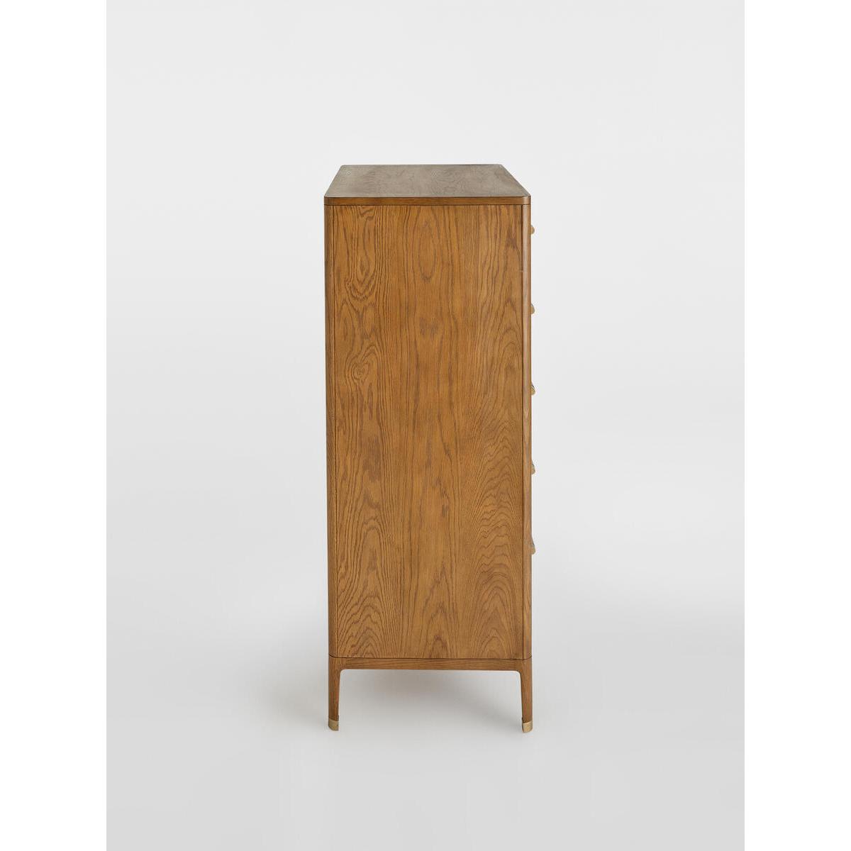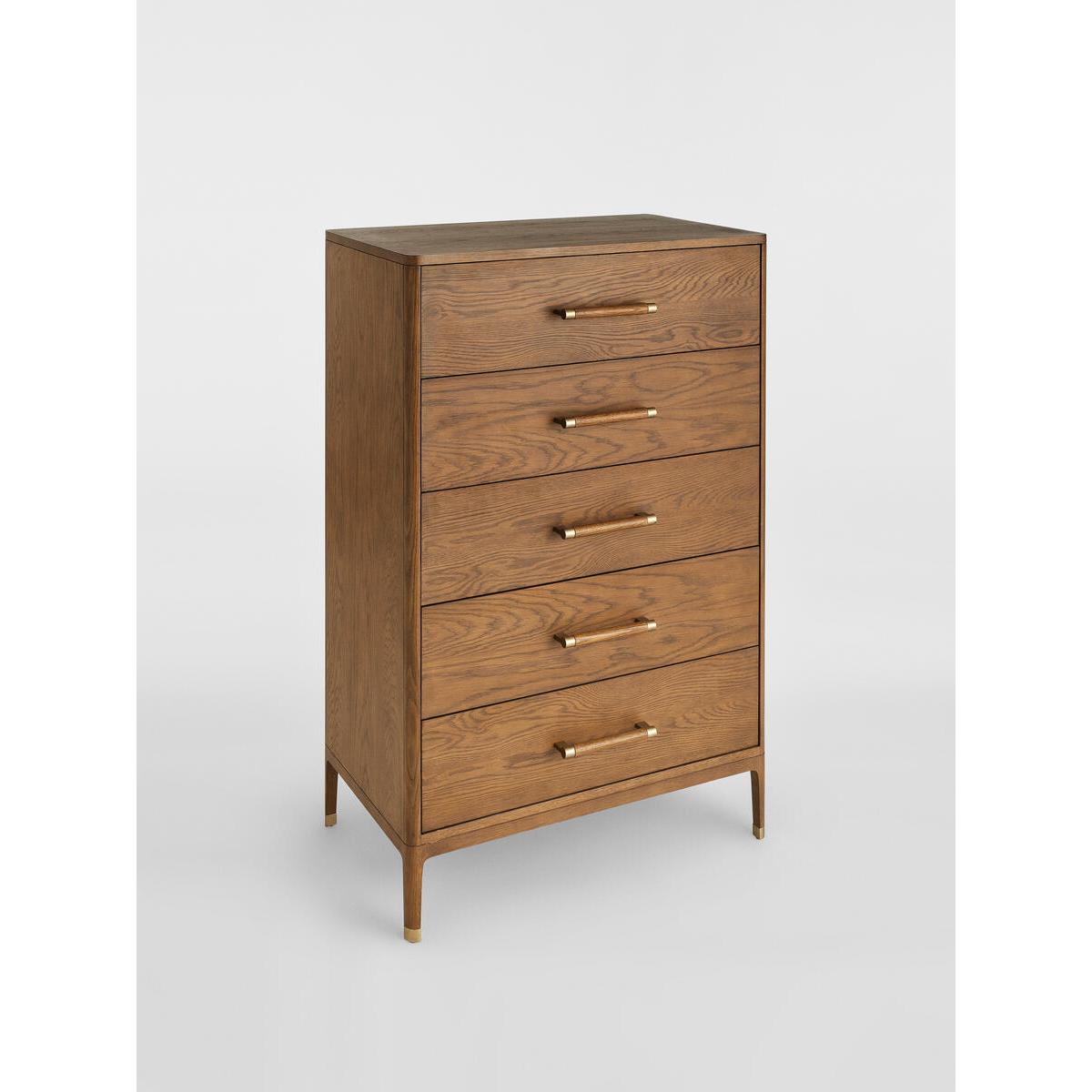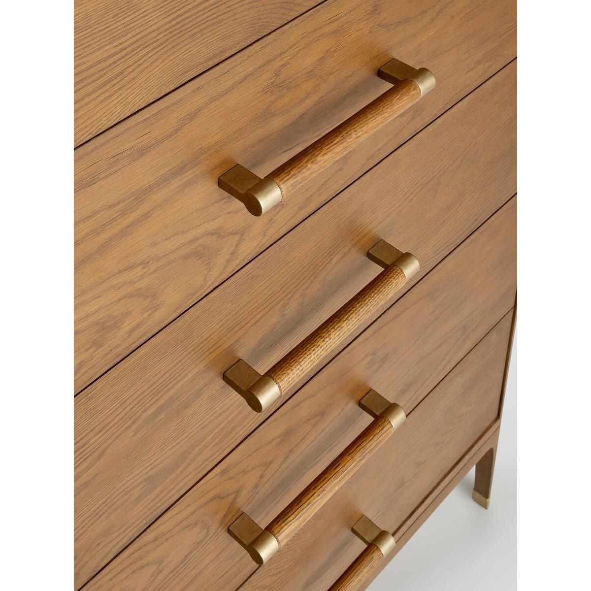The Walton five-drawer dresser takes its cues from themid-century-inspired pieces at White City House. It has a curvedprofile, dovetail drawer boxes, and brass stiletto legs. Oak tonesbring instant warmth to a bedroom. Pair with our Belsa bed for acoordinated scheme. Five-drawer dresser. Oak and oak veneer. Dark brown stain. Dovetail drawers with soft-close runners. Brass stiletto legs. Inspired by White City House.