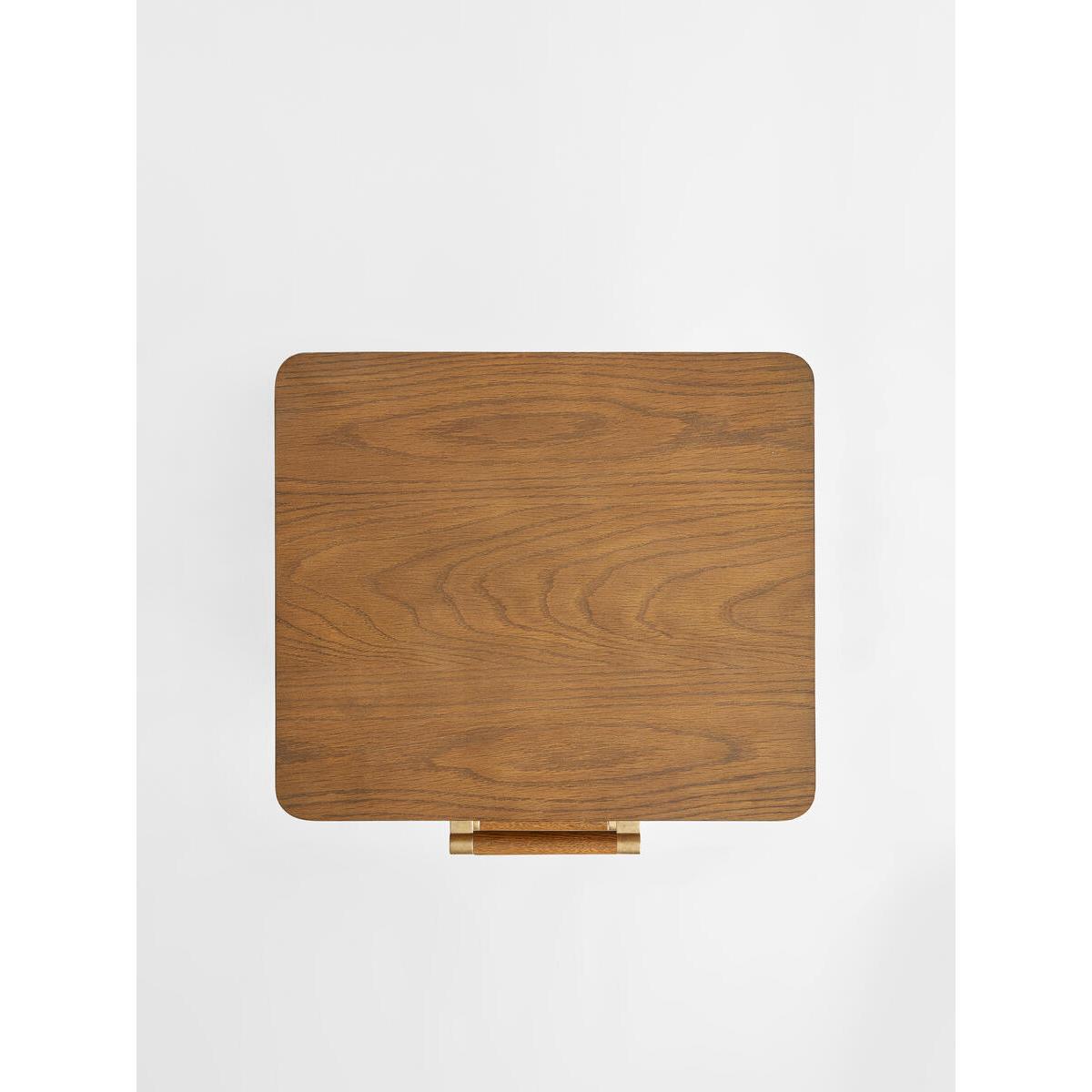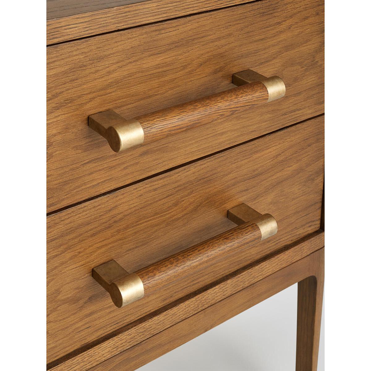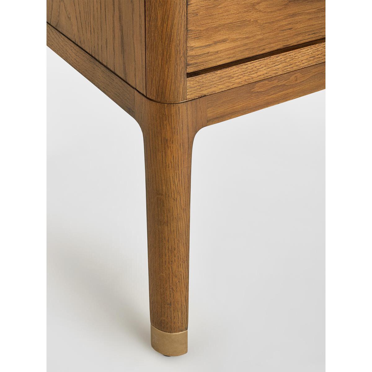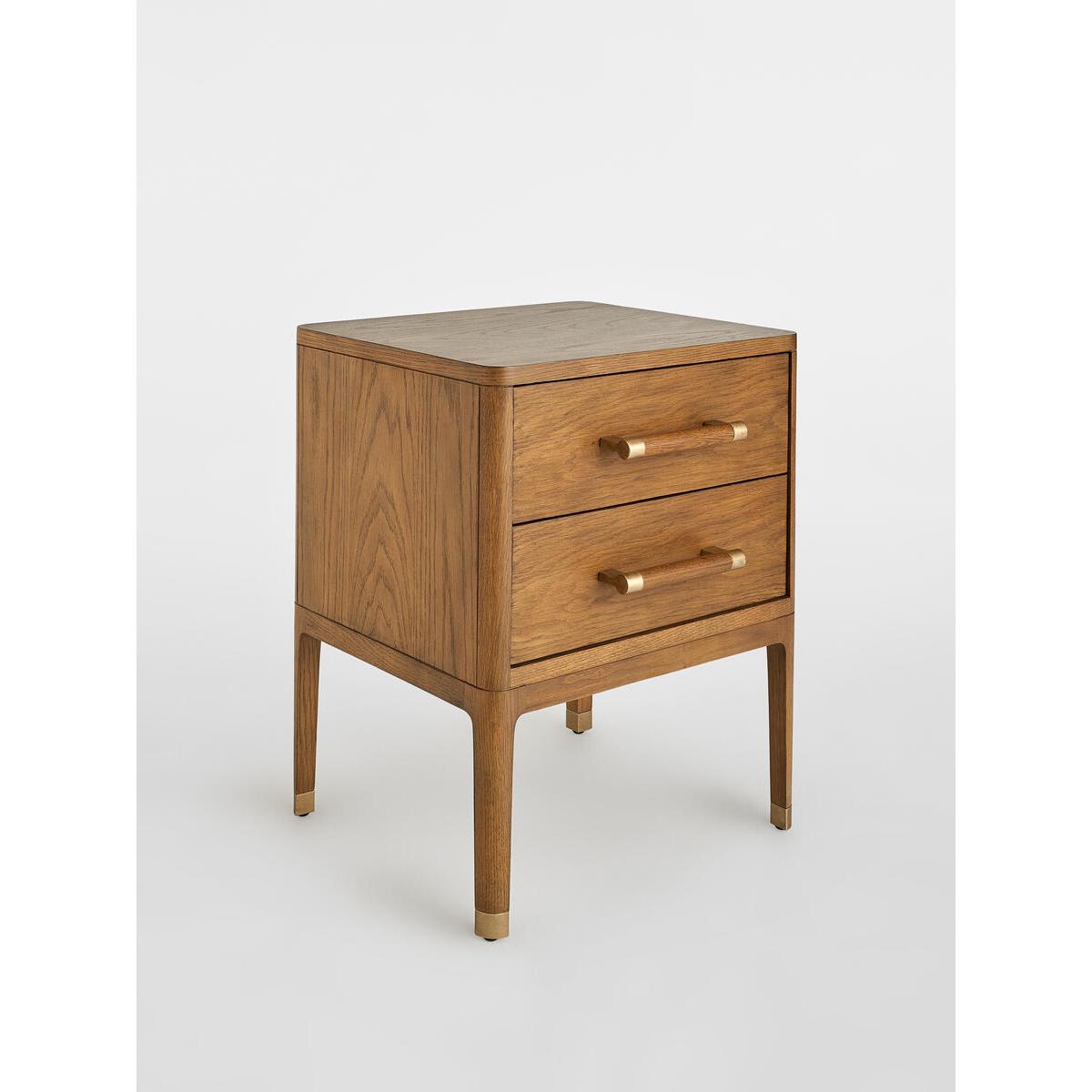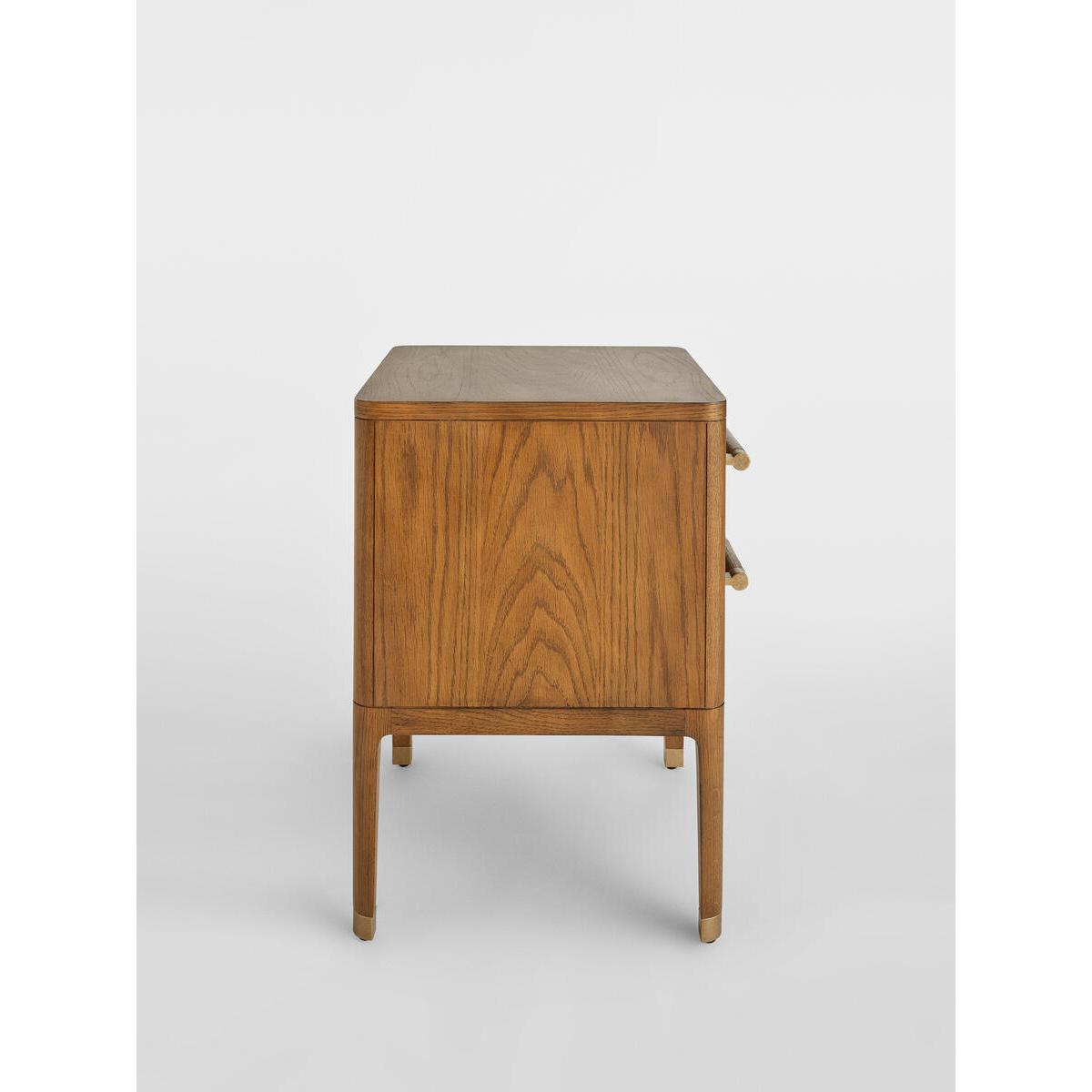 The Walton bedside table takes its cues from themid-century-inspired pieces at White City House. It has a curvedprofile, dovetail drawer boxes, and brass stiletto legs. The warmoak tones bring instant warmth to a bedroom. Pair with our Belsabed for a coordinated scheme. Oak and oak veneer bedside table. Dark brown stain. Dovetail drawers with soft-close runners. Brass stiletto legs. Inspired by White City House.