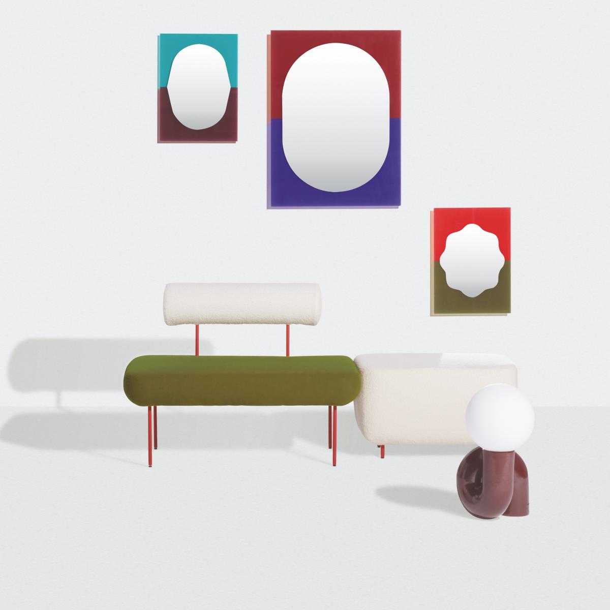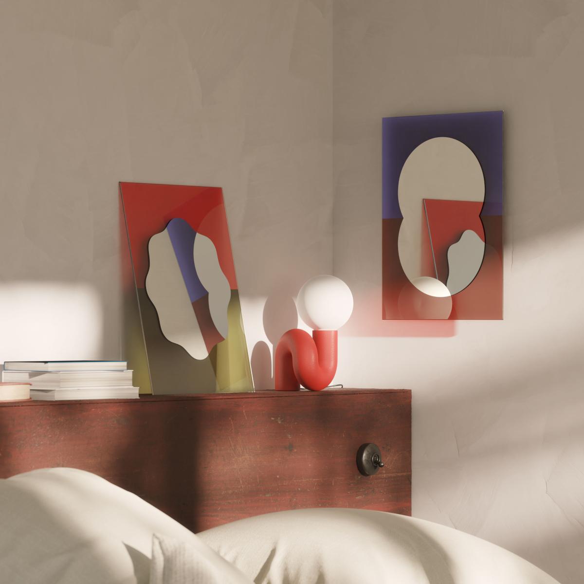 A colourful mirror... Designed by the French studio AC/AL, the Wander mirror offers a bold, unique colour palette with great subtlety in the combination of complementary colours. Of high quality, these mirrors made in France are coloured using a very precise two-tone laser printing process. The Wander collection is designed like a window to another world, light and joyful. It was born from an approach free from any constraint and lets you escape into a graphic, pictorial, playful space. The invisible wall fixing system allows the mirror to be positioned 2 cm from the wall : the mirror thus seems to levitate on the wall, the better to project its colours in a halo. The three sizes allow for various uses. The small Wander mirror can only be used vertically. It’s perfect above a bed to bring depth to the bedroom, in a bathroom or entrance to transform the atmosphere. The different mirrors in the collection together form a mosaic of solids and voids, allowing for different compositions.