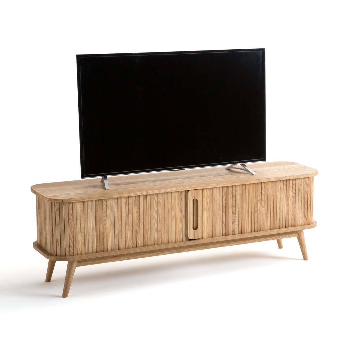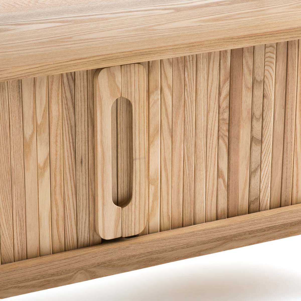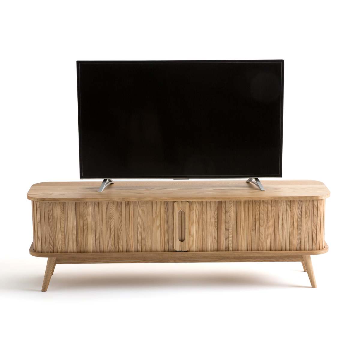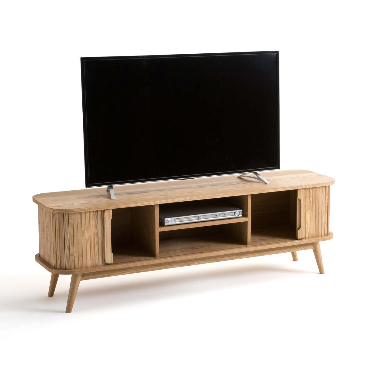 I love this TV stand because of its clean lines and versatile mid-century modern appeal. It works particularly well in contemporary and Scandinavian-inspired interiors, where the natural wood adds warmth and texture. The sliding doors are a practical feature, helping to keep clutter out of sight and giving a streamlined look. Styling tips include pairing it with minimalist accessories like a sleek vase or a few coffee table books on top, and using open shelving or baskets inside to organise electronics and media extras. Its understated design makes it adaptable for both living rooms and open-plan spaces, and it offers enough surface space for additional decorative items without feeling crowded.