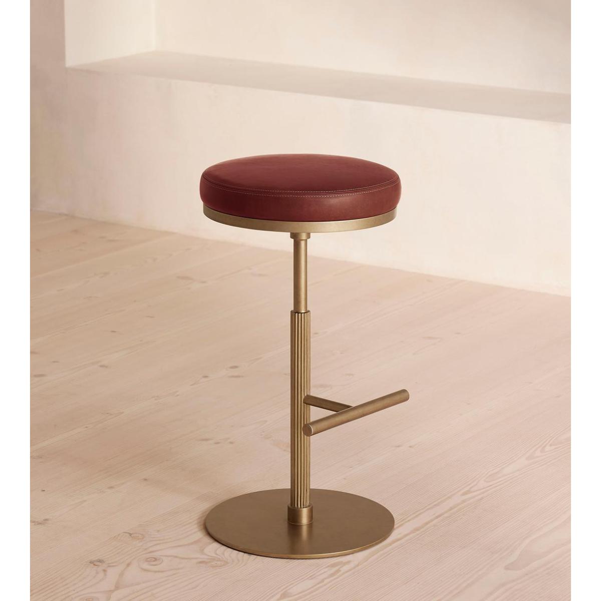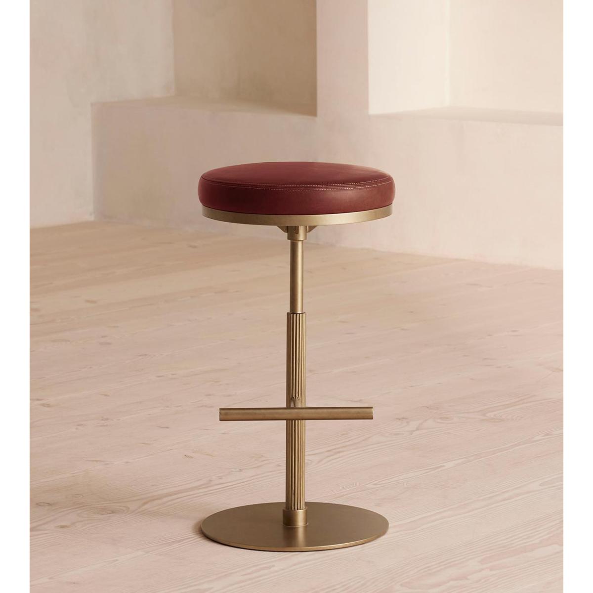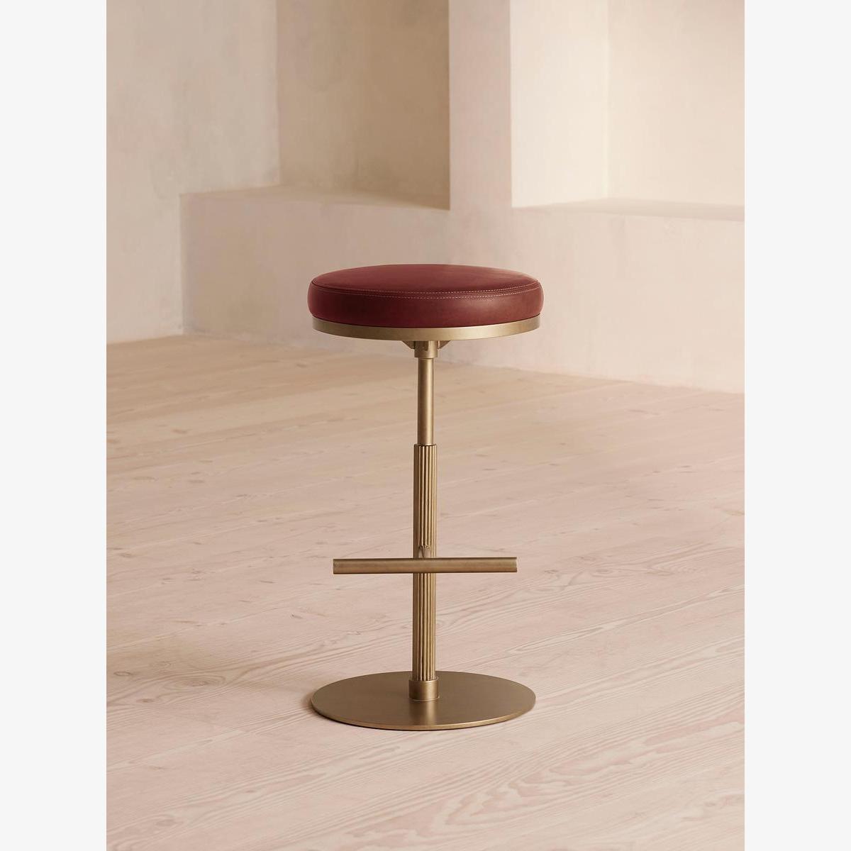 Intricate groove detailing on the central column ascends to a deep red, leather upholstered swivel seat. Bring the bar home with our Wardell counter stool, designed for at-home bar areas or open kitchen spaces. Fitted with an upholstered swivel seat to let you or your guests move with the conversation, its fixed brass stem is finished with groove detailing and a T-bar footrest.